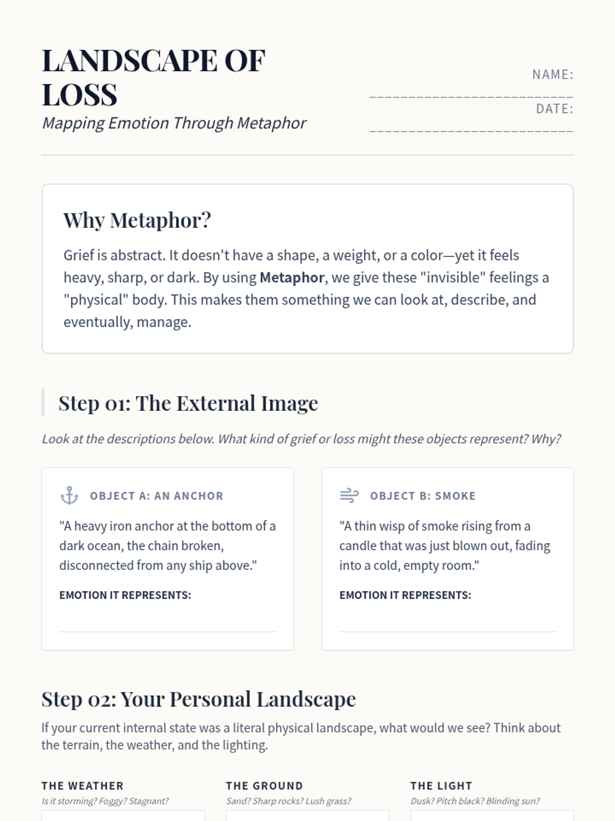 A therapeutic writing sequence for 12th-grade students exploring grief, loss, and resilience. Through journaling, metaphor, and narrative reframing, students develop writing as a sustainable coping mechanism for emotional regulation.