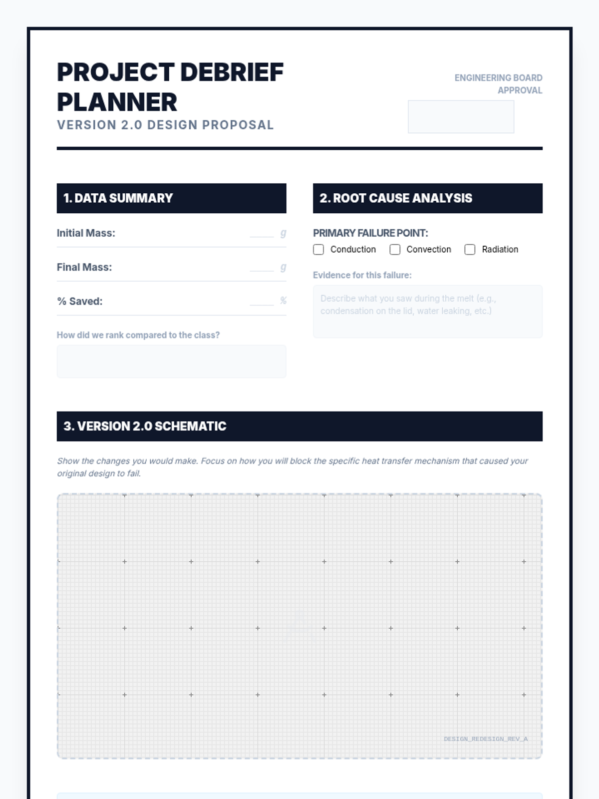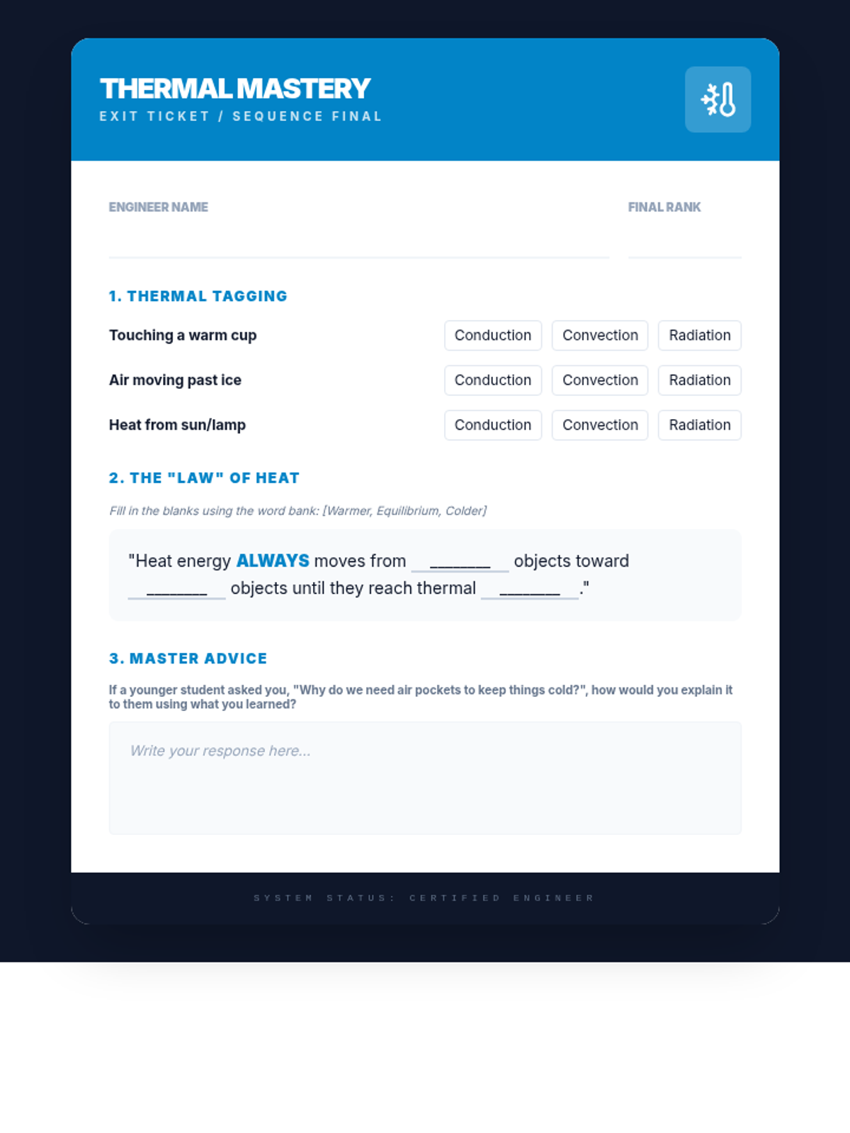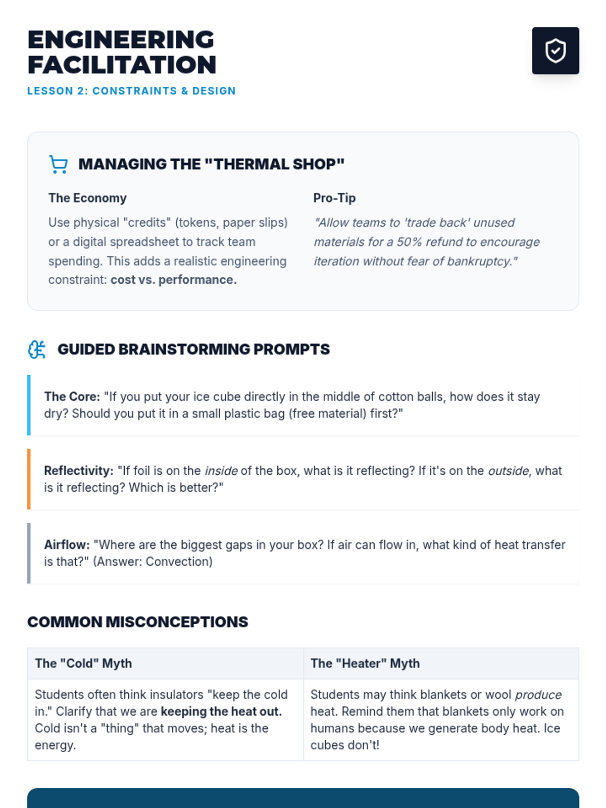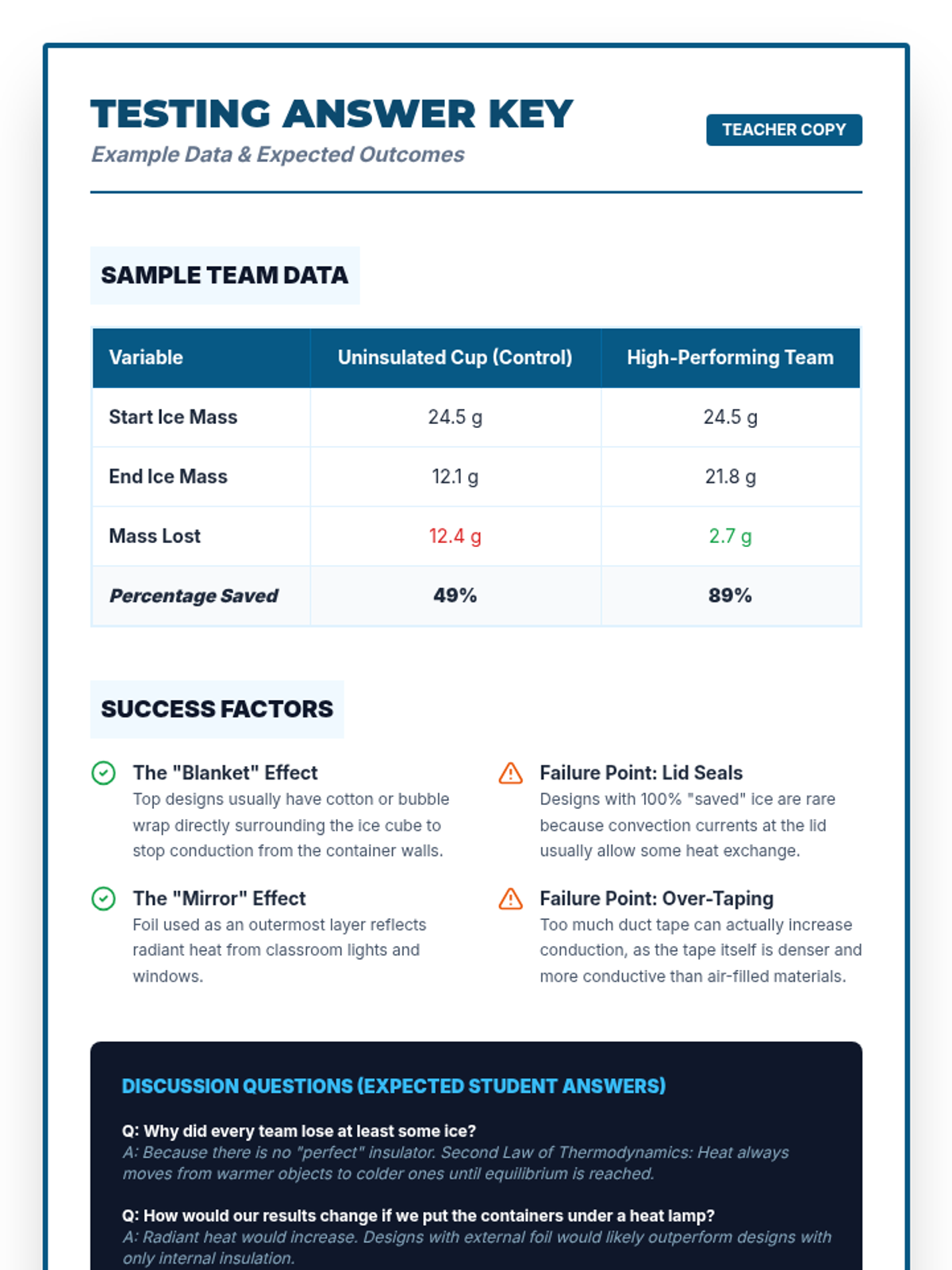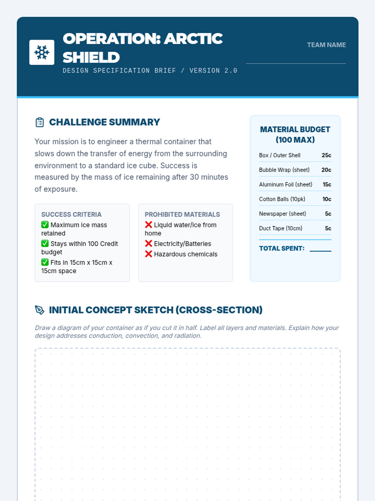 A project-based sequence where 6th-grade students act as thermal engineers. They explore material properties, design and build an insulating container to save an ice cube, test their prototypes, and iterate based on thermodynamic principles.