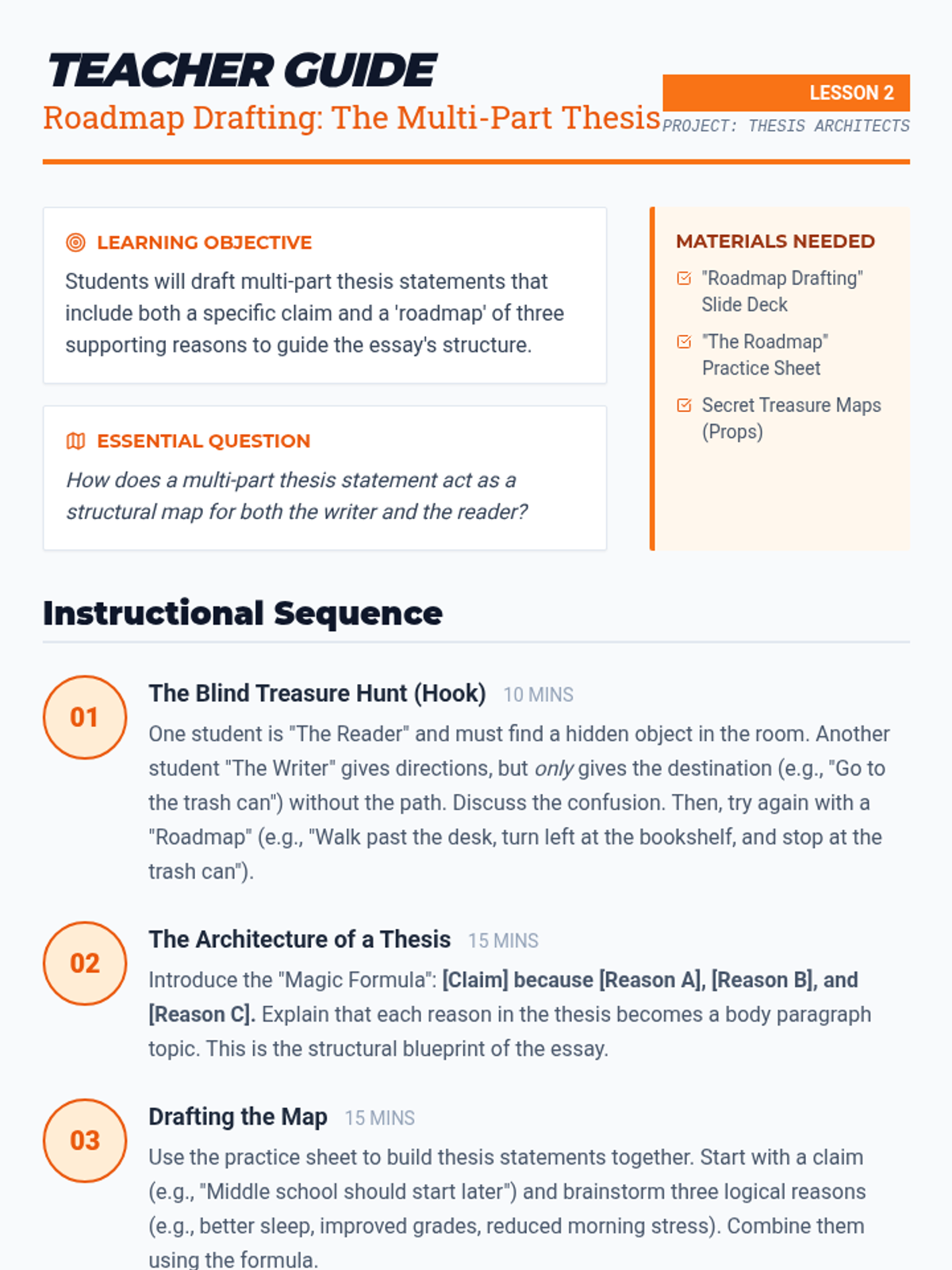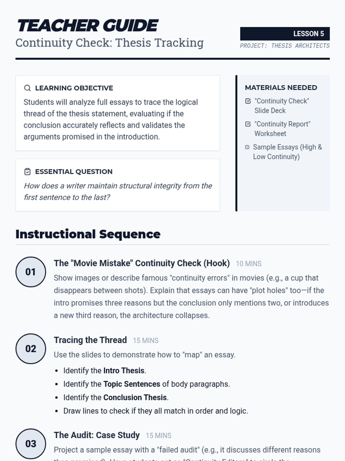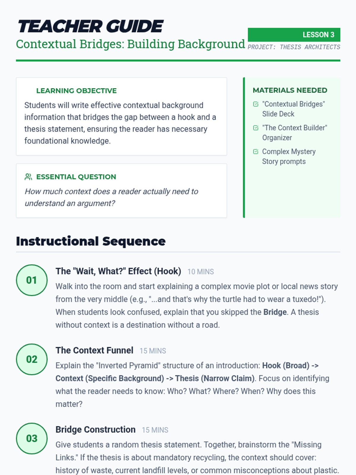 This sequence guides 8th-grade students through the architectural process of crafting strong introductions and conclusions, focusing on the thesis statement as the structural anchor. Students move from identifying debatable claims to building contextual bridges and ensuring consistency throughout their writing.