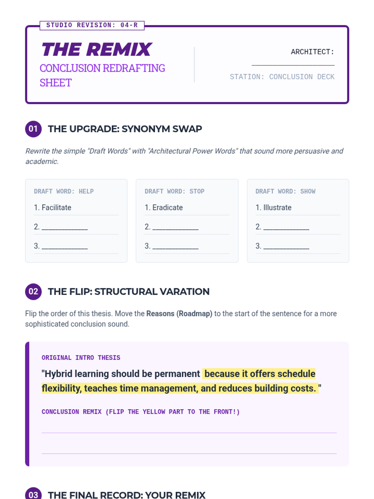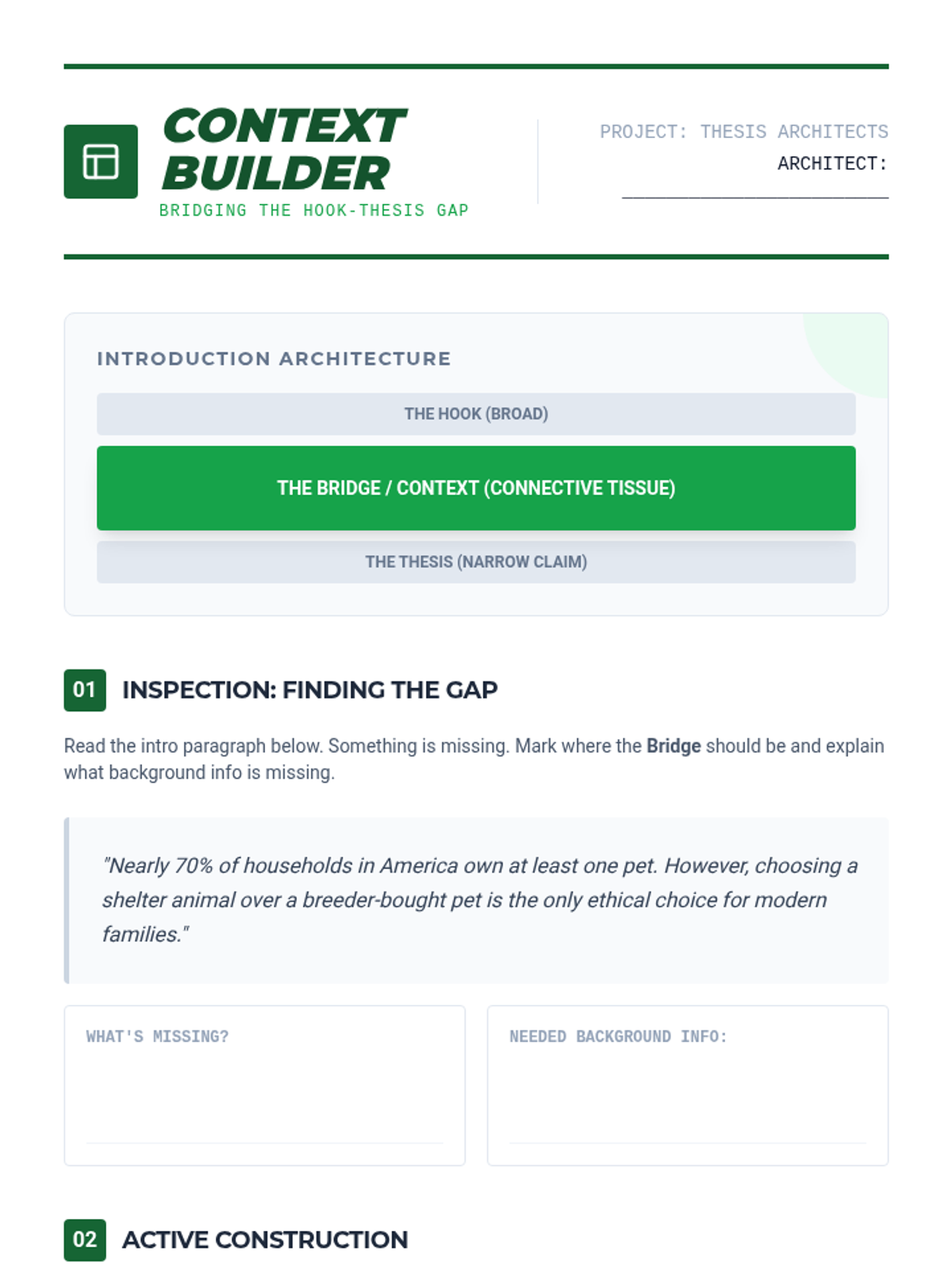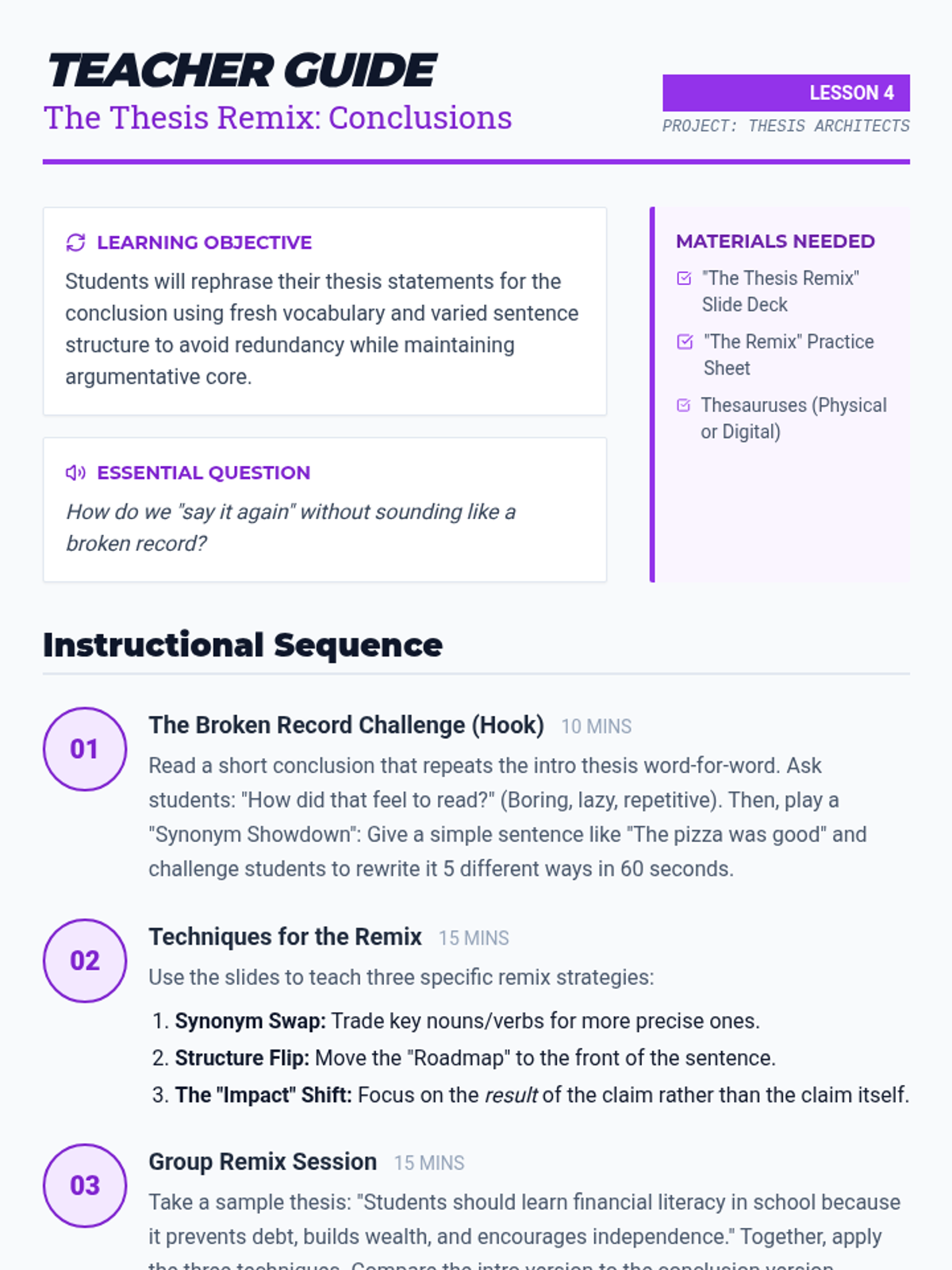 This sequence guides 8th-grade students through the architectural process of crafting strong introductions and conclusions, focusing on the thesis statement as the structural anchor. Students move from identifying debatable claims to building contextual bridges and ensuring consistency throughout their writing.