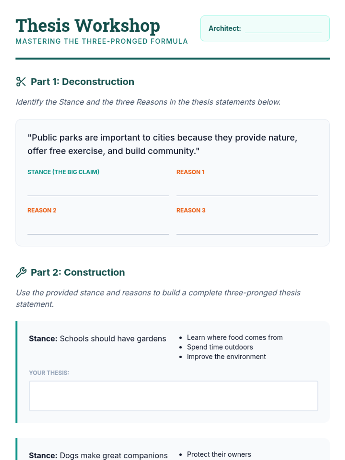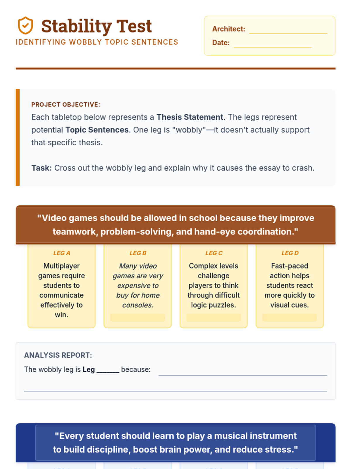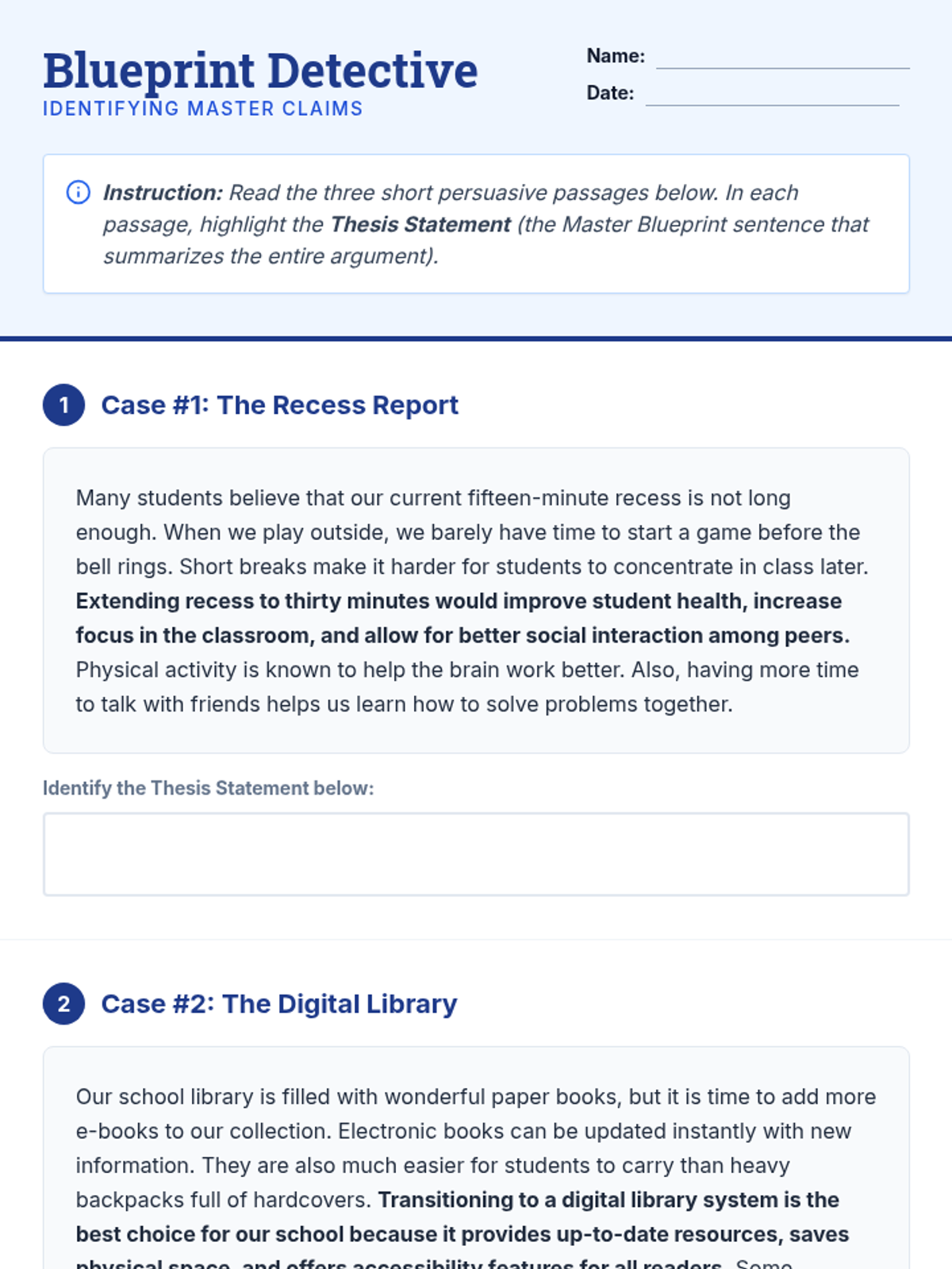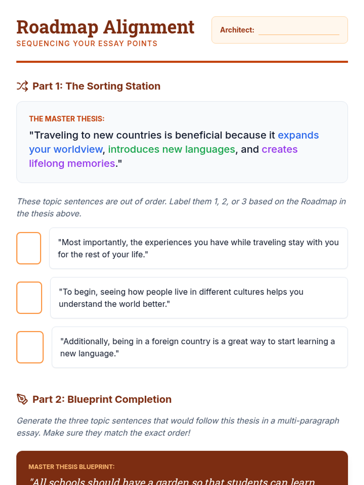 A comprehensive 5-lesson unit for 5th graders transitioning from single paragraphs to structured multi-paragraph essays. Students will master identifying, crafting, and aligning thesis statements with topic sentences using an architectural 'blueprint' theme.