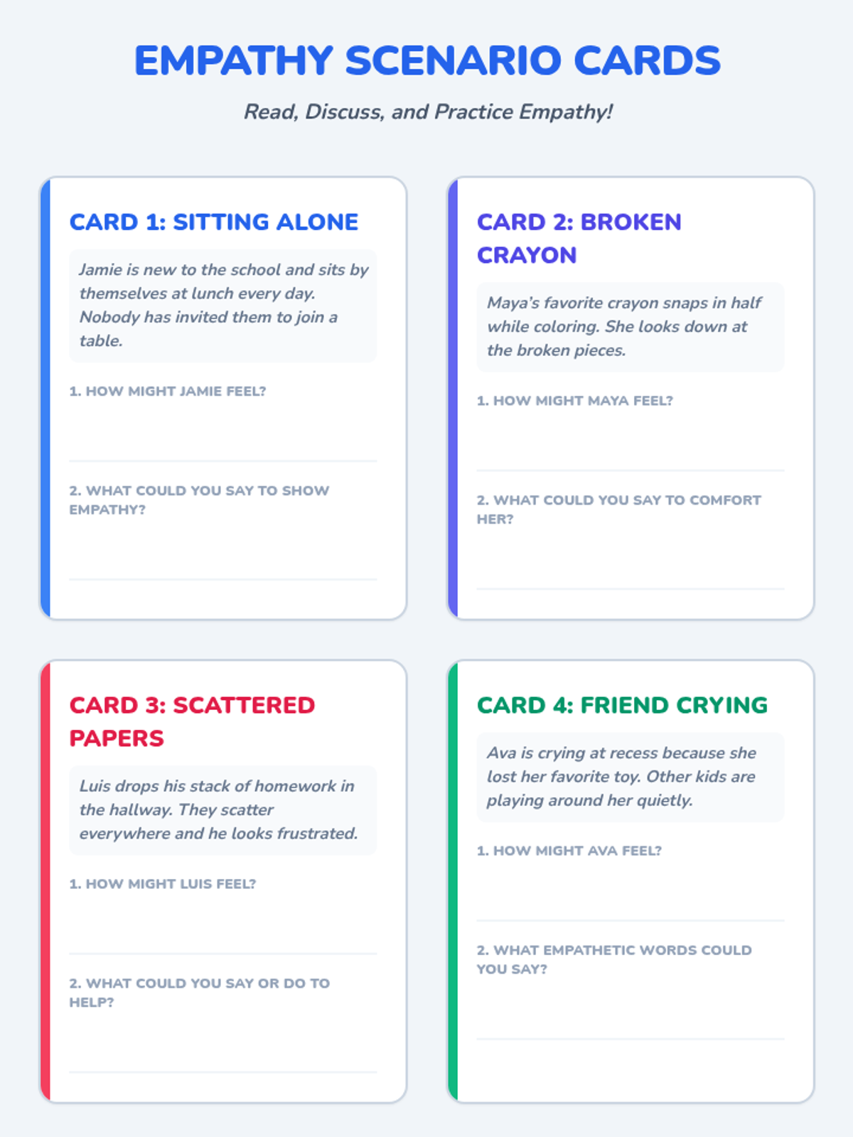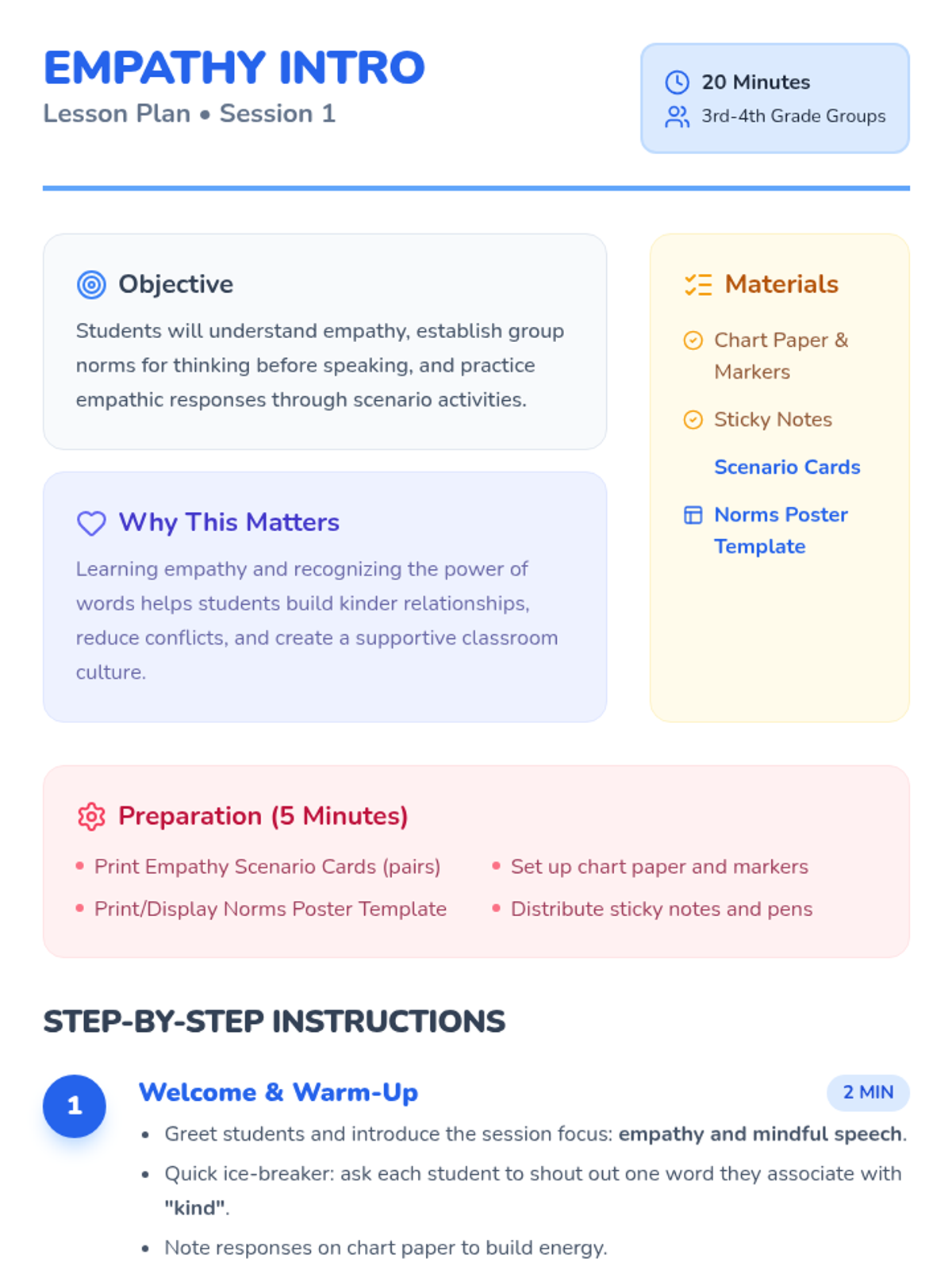 A four-session series for third and fourth graders focused on developing empathy, understanding emotion triggers, and practicing mindful speech through role-play and reflection.
