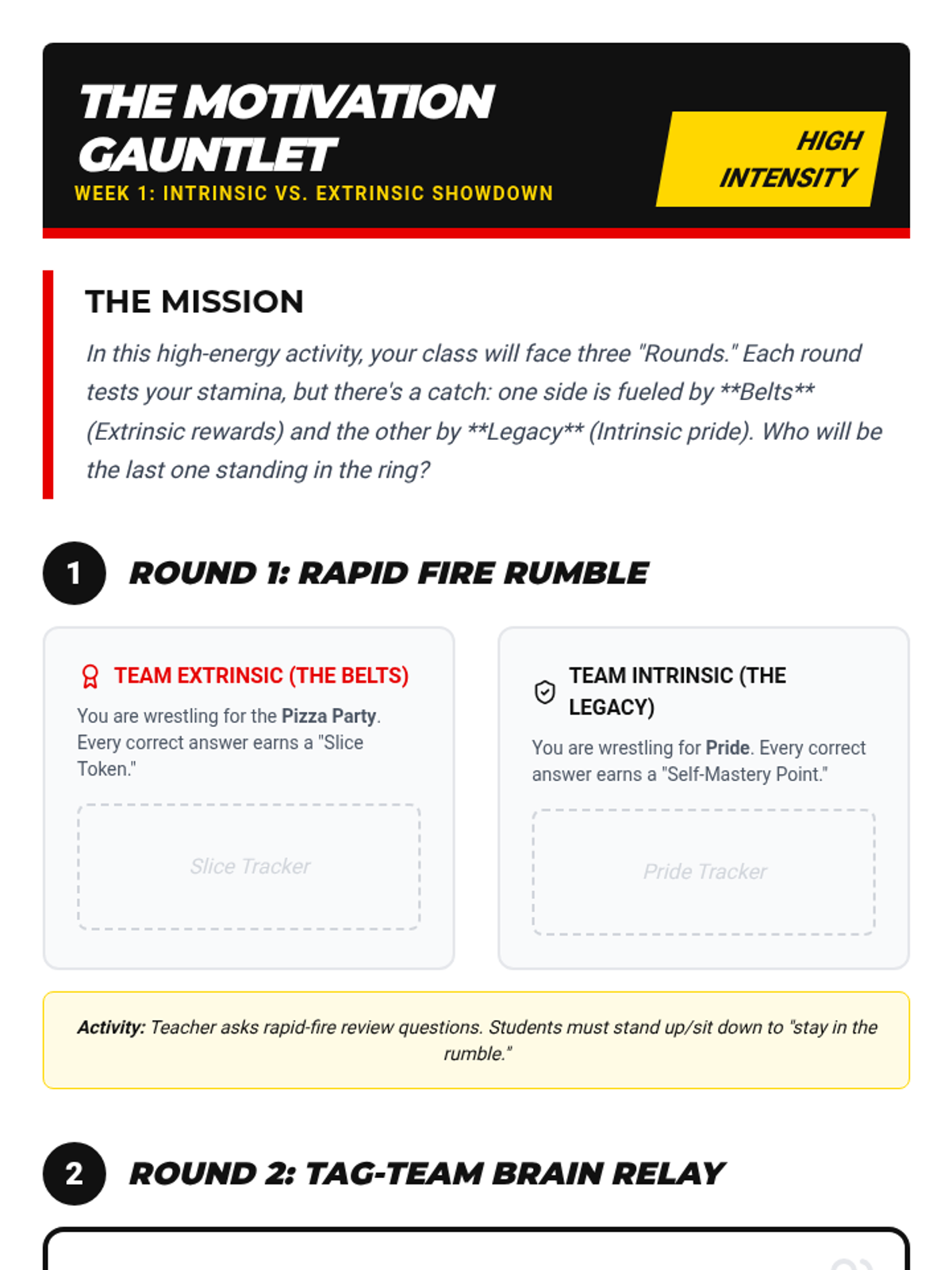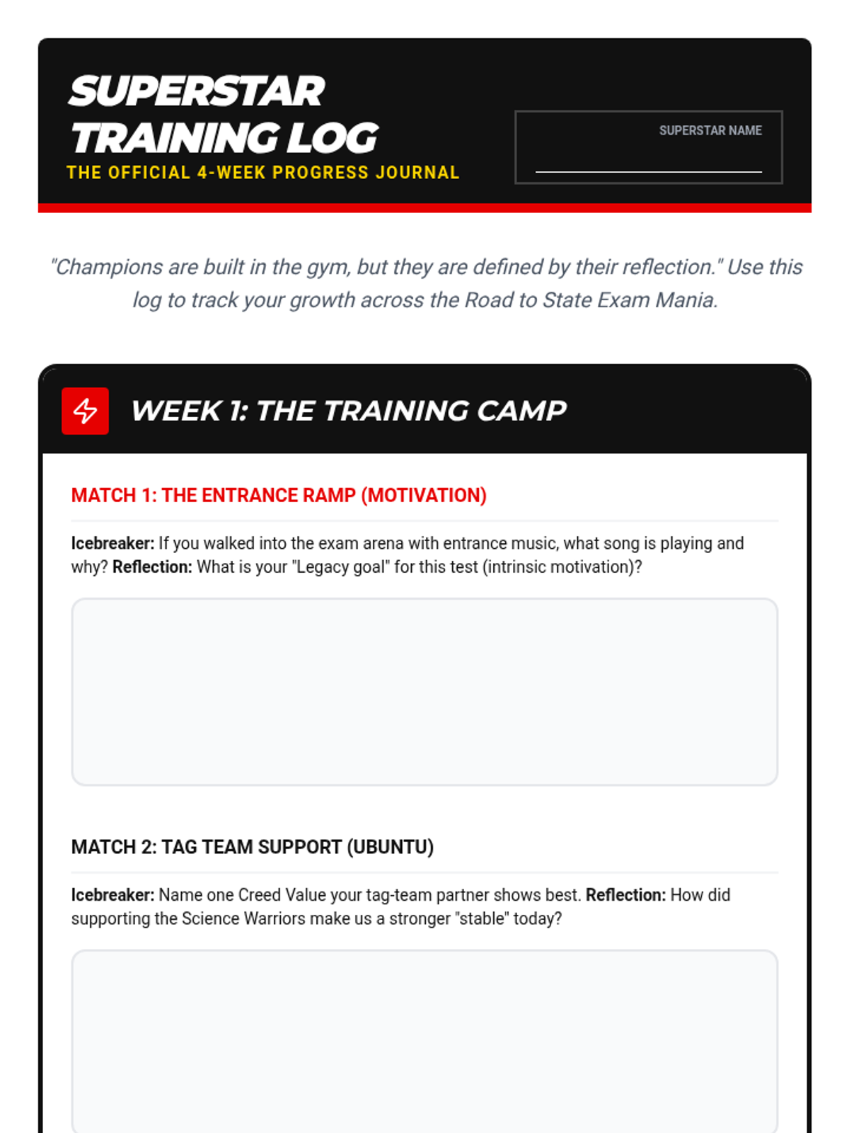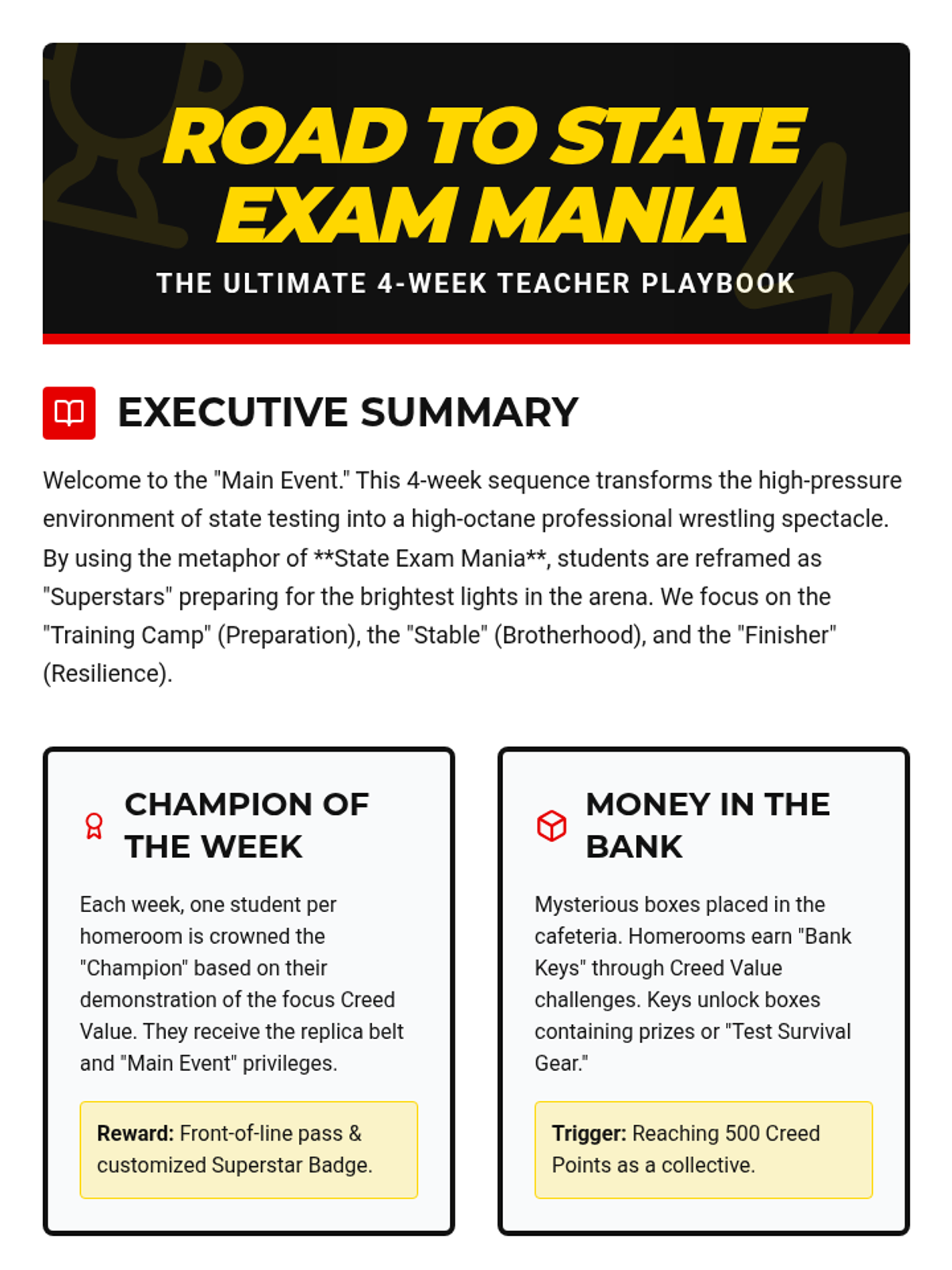 A 4-week socio-emotional learning sequence using professional wrestling as a metaphor for state exam preparation, focusing on motivation, resilience, and brotherhood.