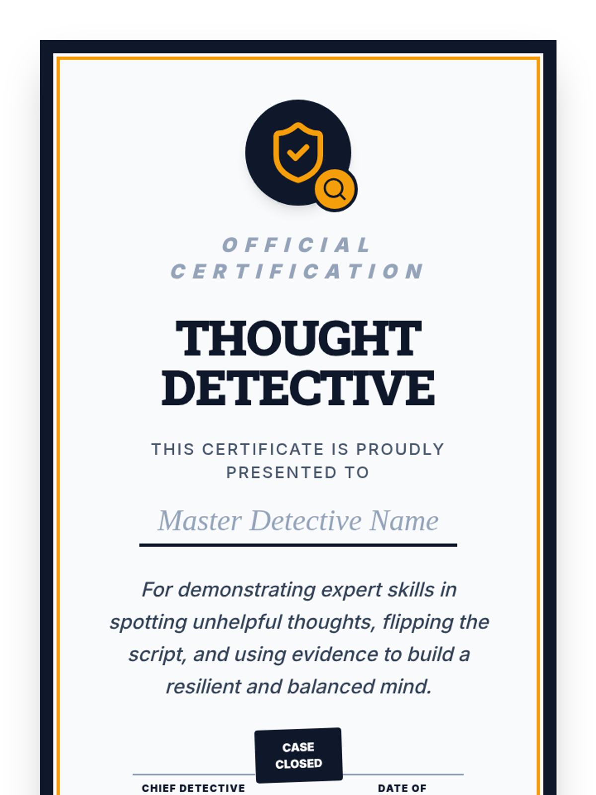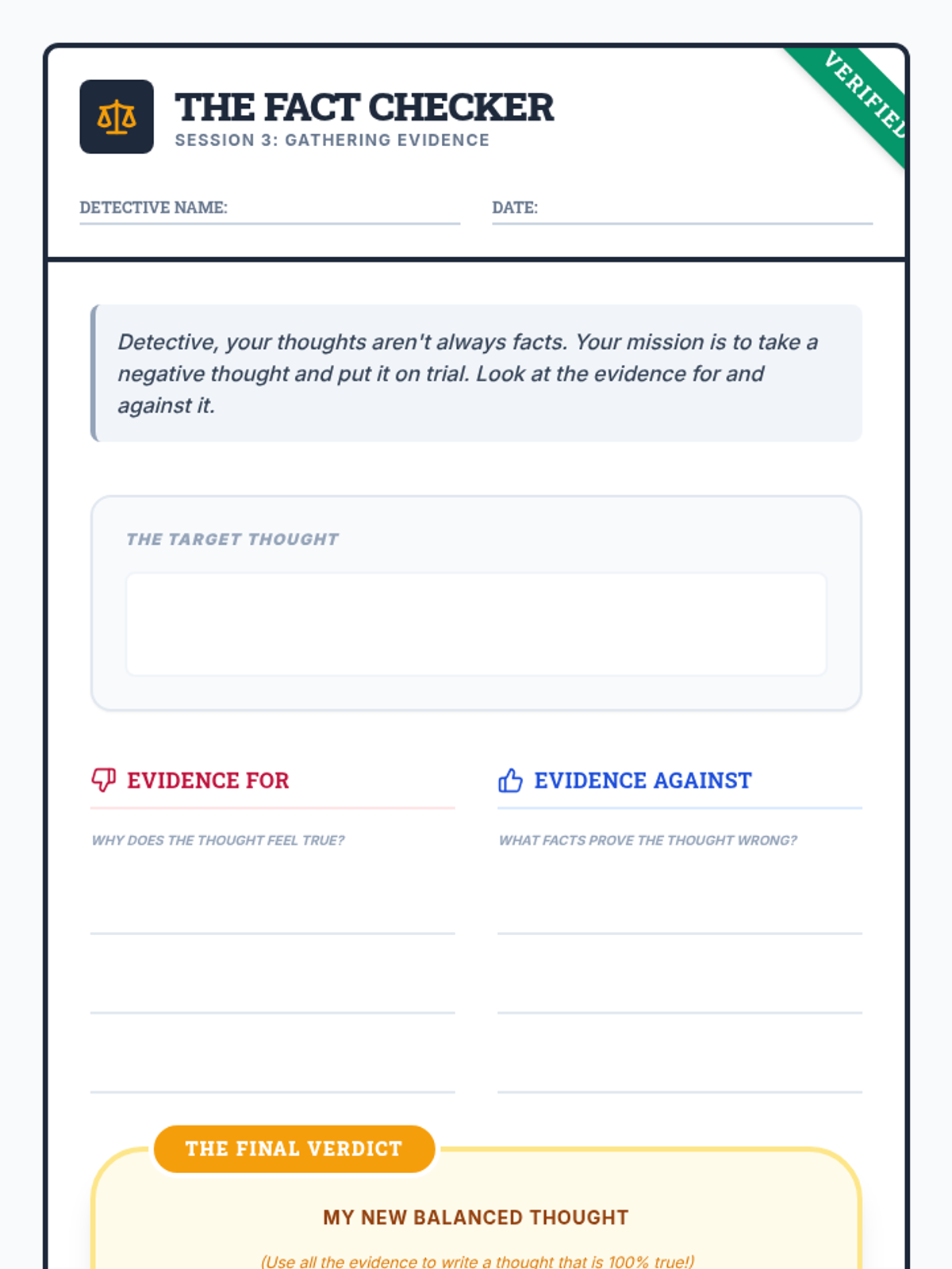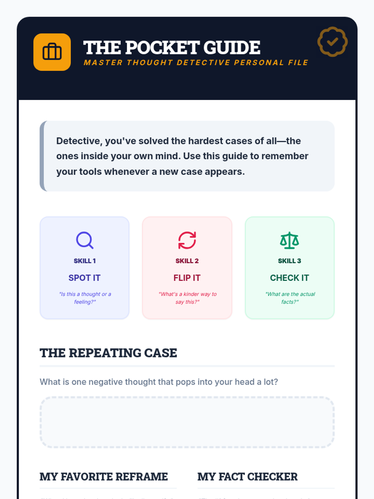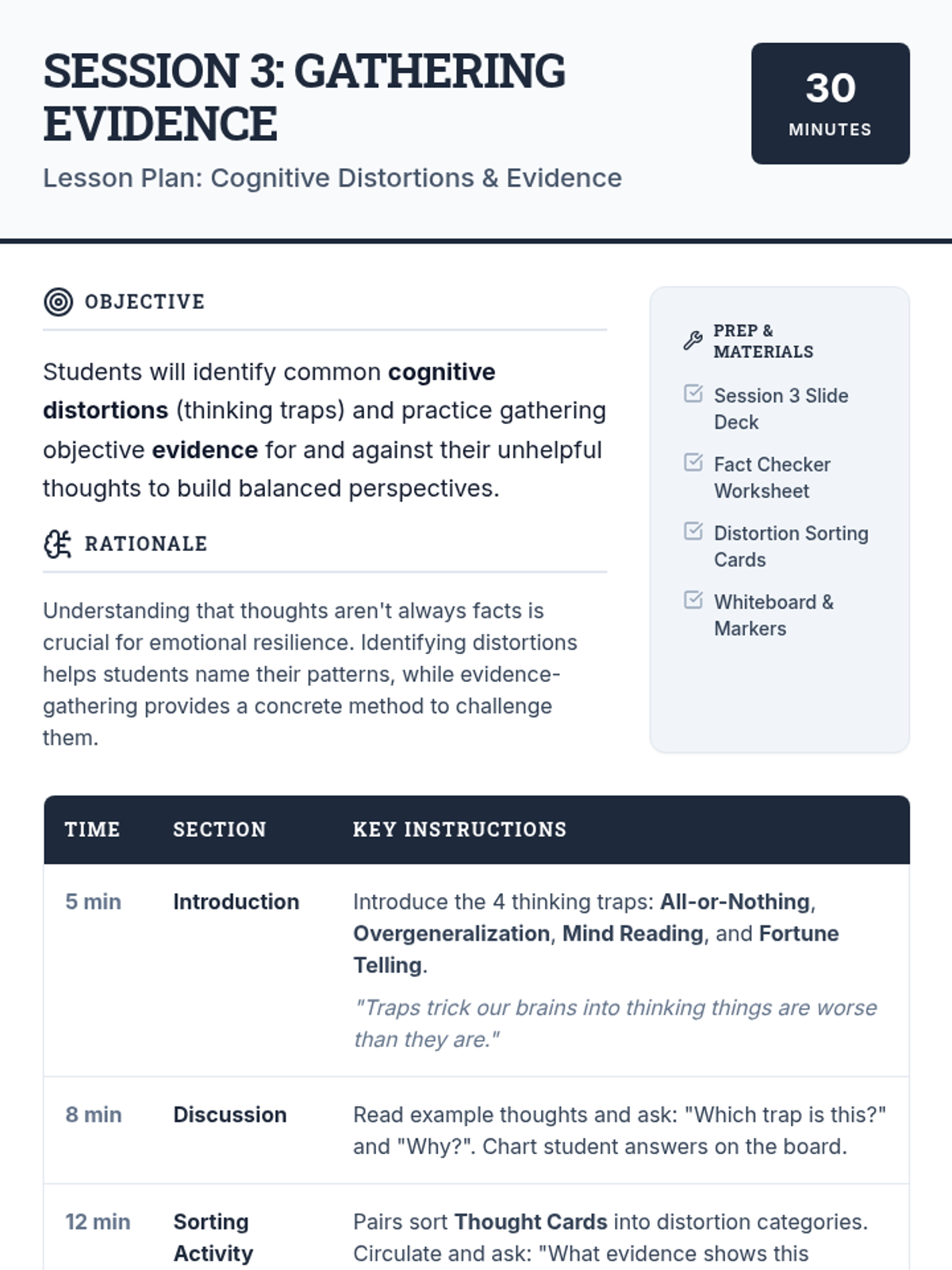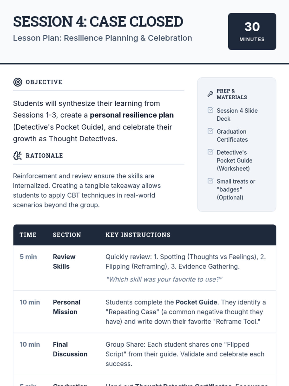 A 4-session CBT-based small group curriculum where students use detective-themed activities to identify, challenge, and reframe negative thoughts. Designed for 6th and 8th-grade special education students with autism or depression to build emotional resilience.