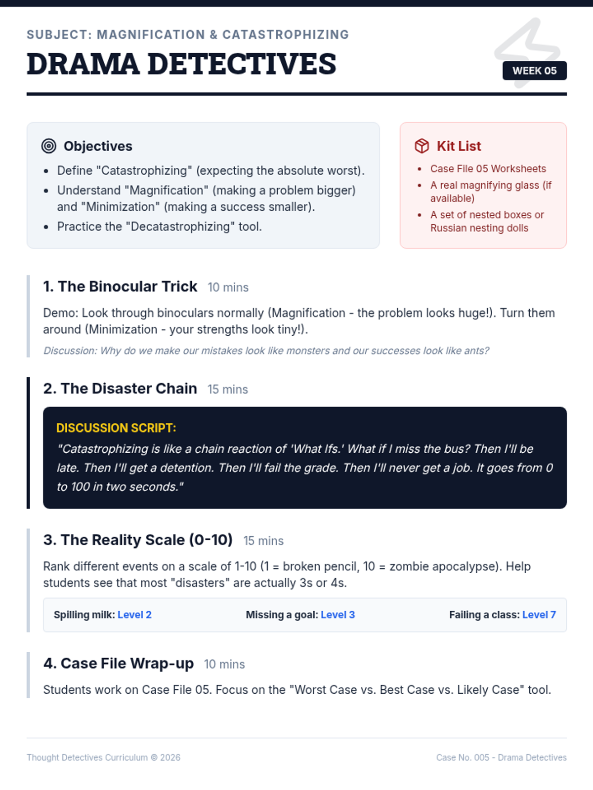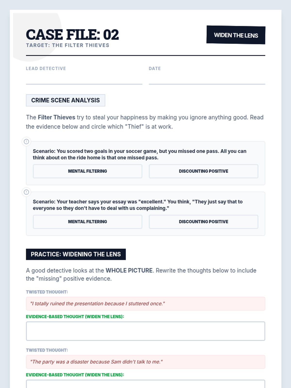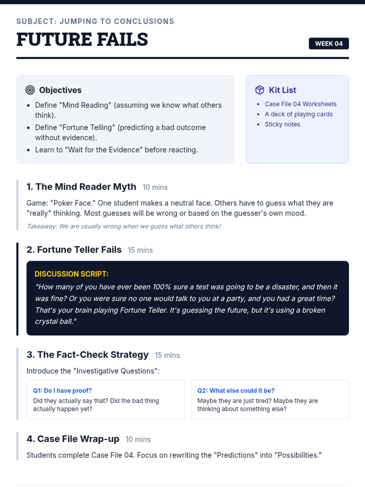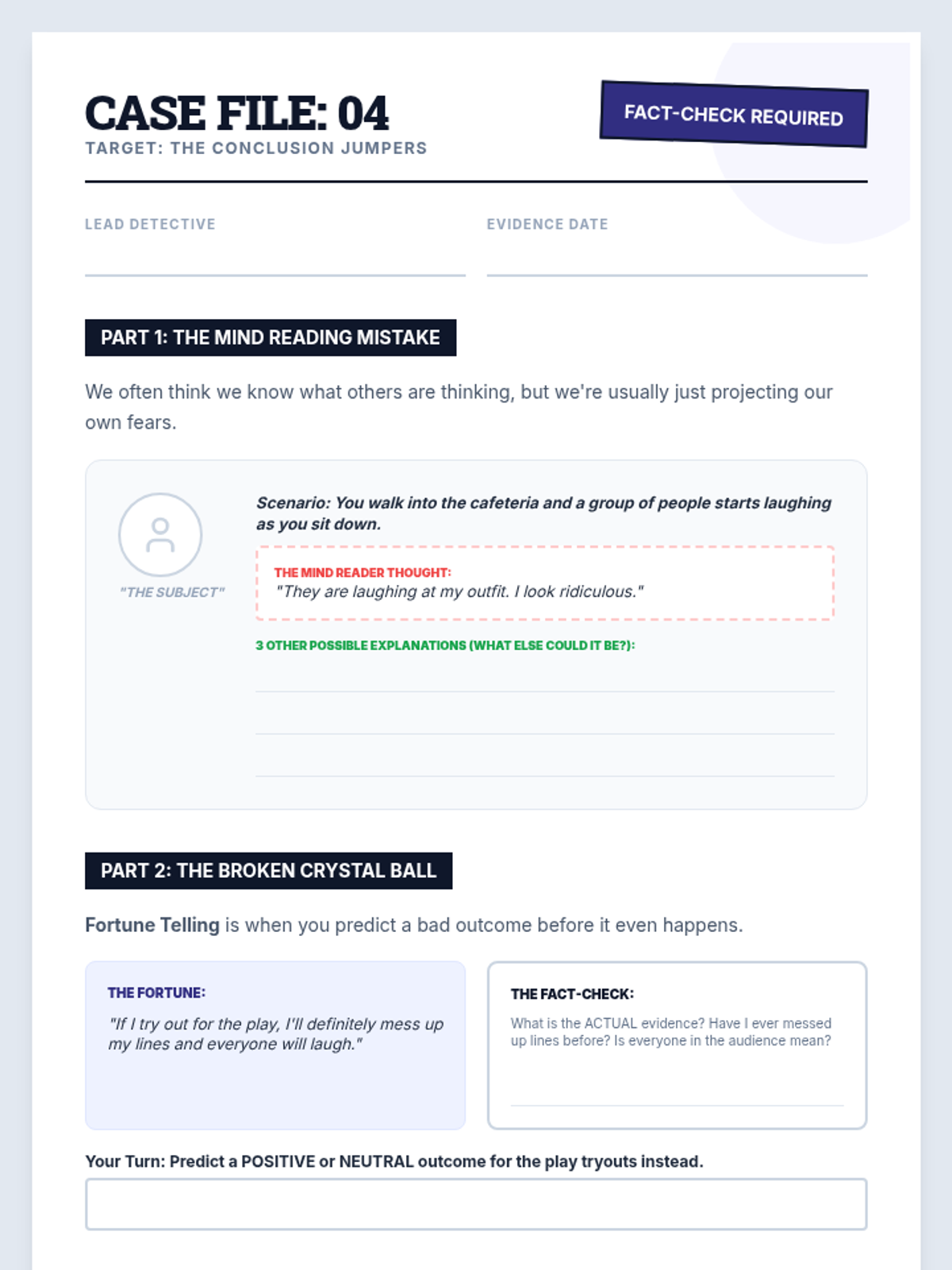 An 8-week cognitive behavioral therapy (CBT) based small group curriculum for 7th graders, focused on identifying and challenging cognitive distortions using a fun detective theme.