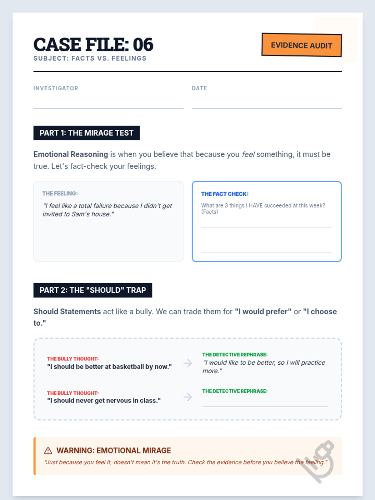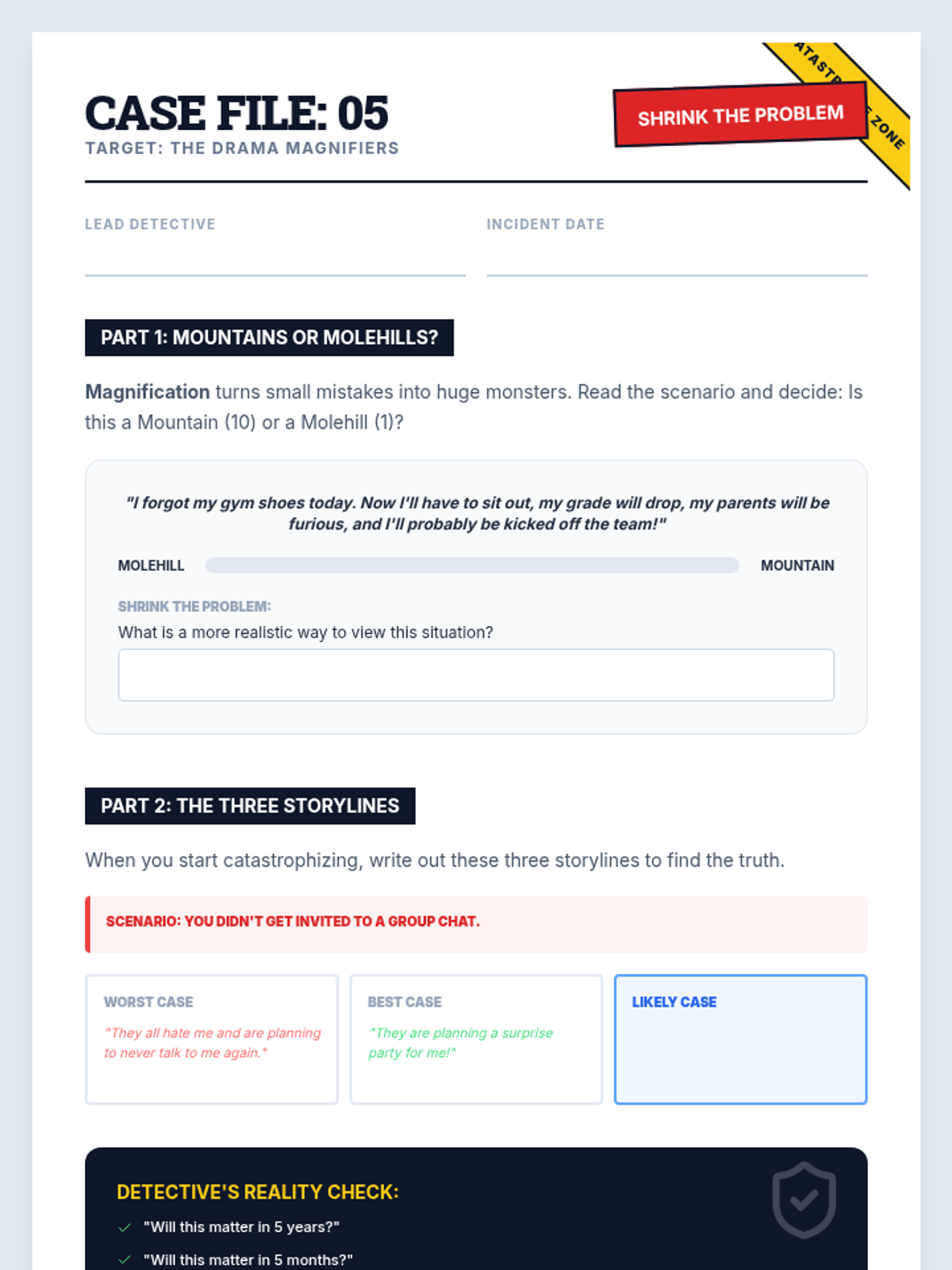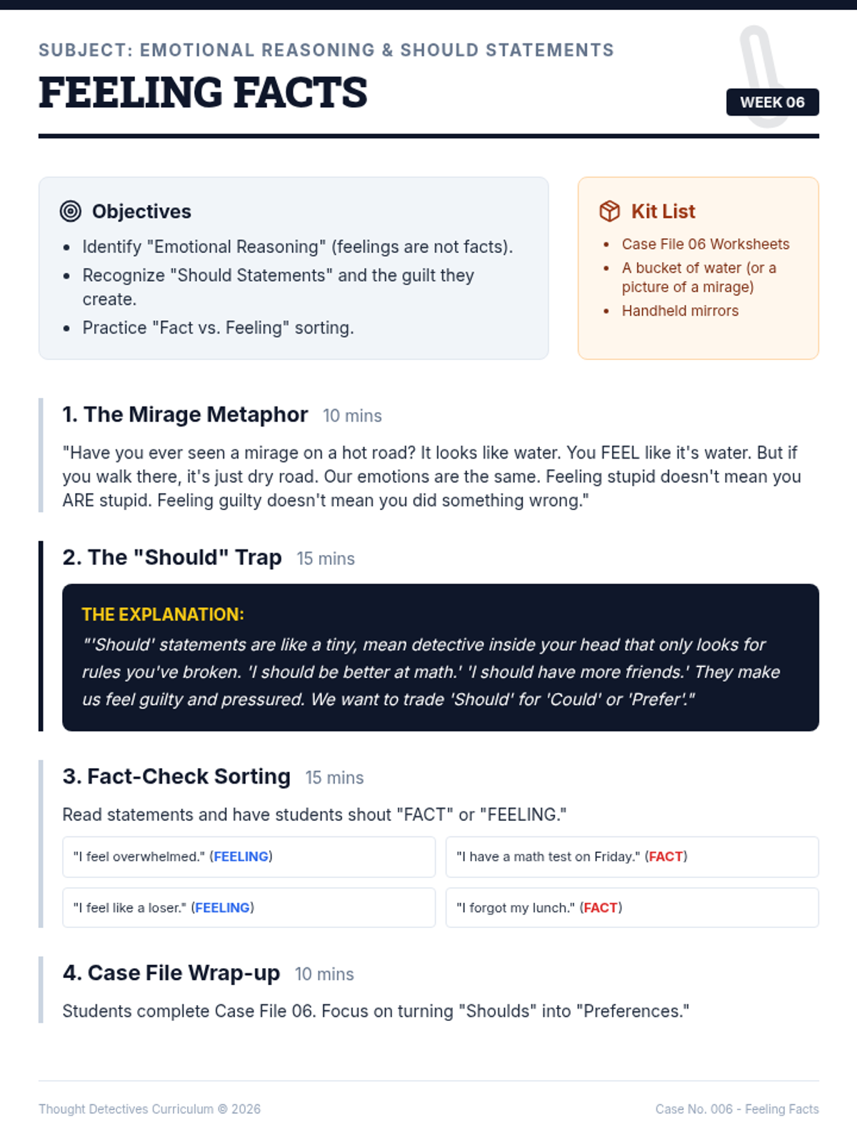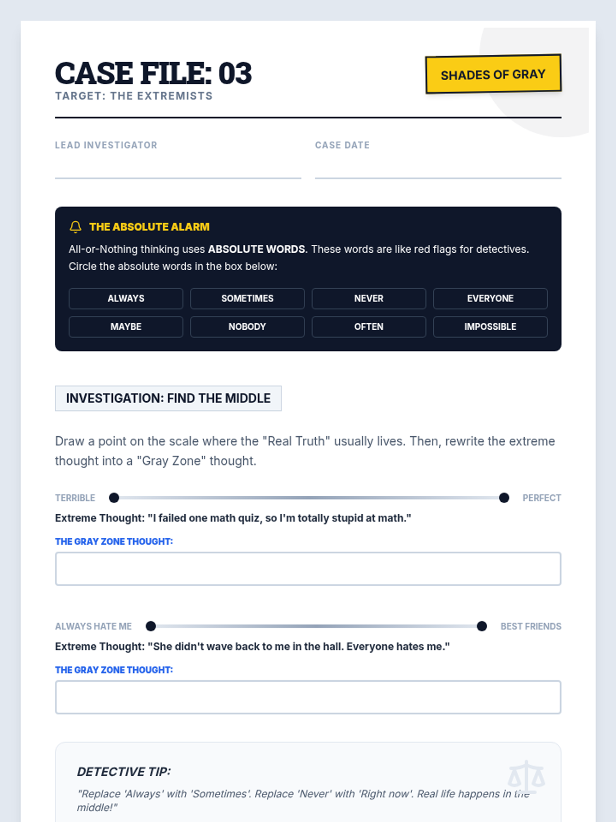 An 8-week cognitive behavioral therapy (CBT) based small group curriculum for 7th graders, focused on identifying and challenging cognitive distortions using a fun detective theme.
