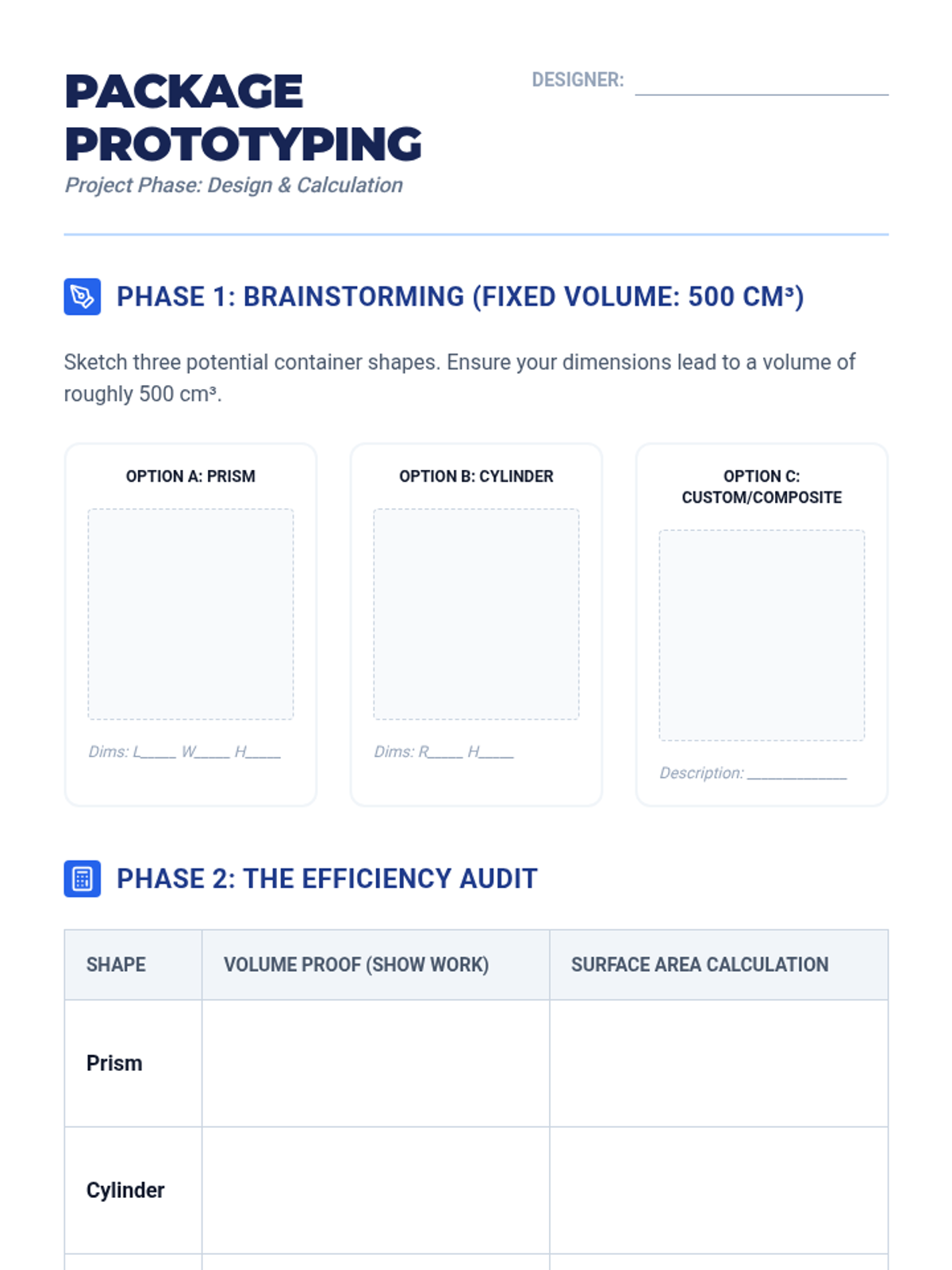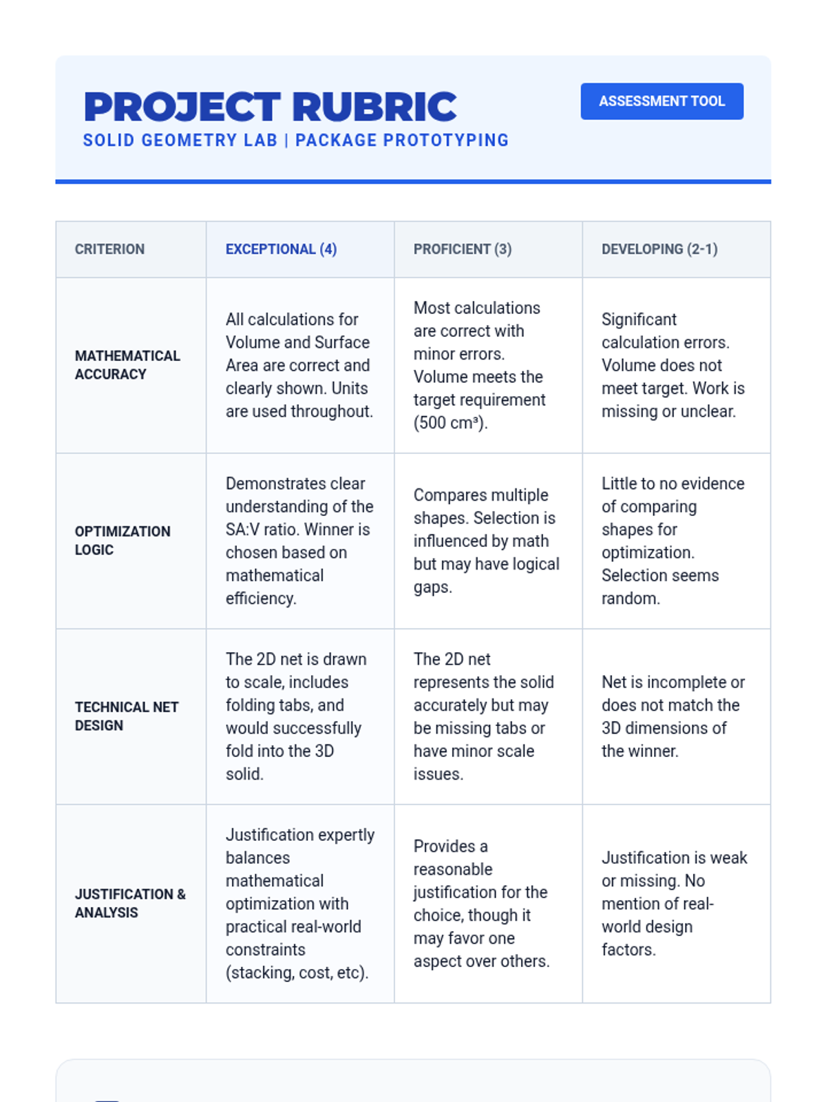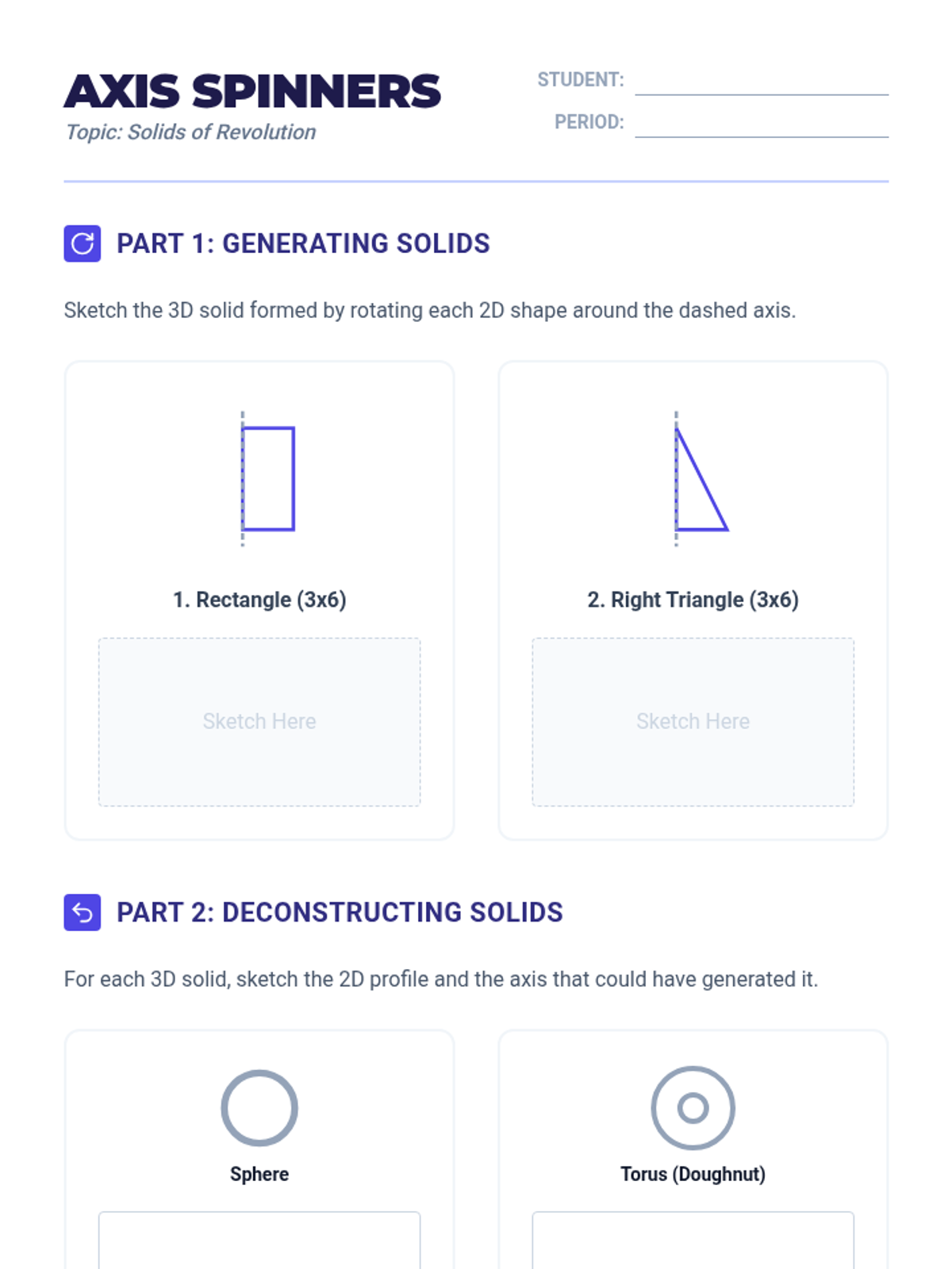 A project-based unit exploring the relationship between 2D shapes and 3D solids through cross-sections, rotations, volume principles, and real-world modeling. Students move from visualization to optimization, culminating in a container design challenge.