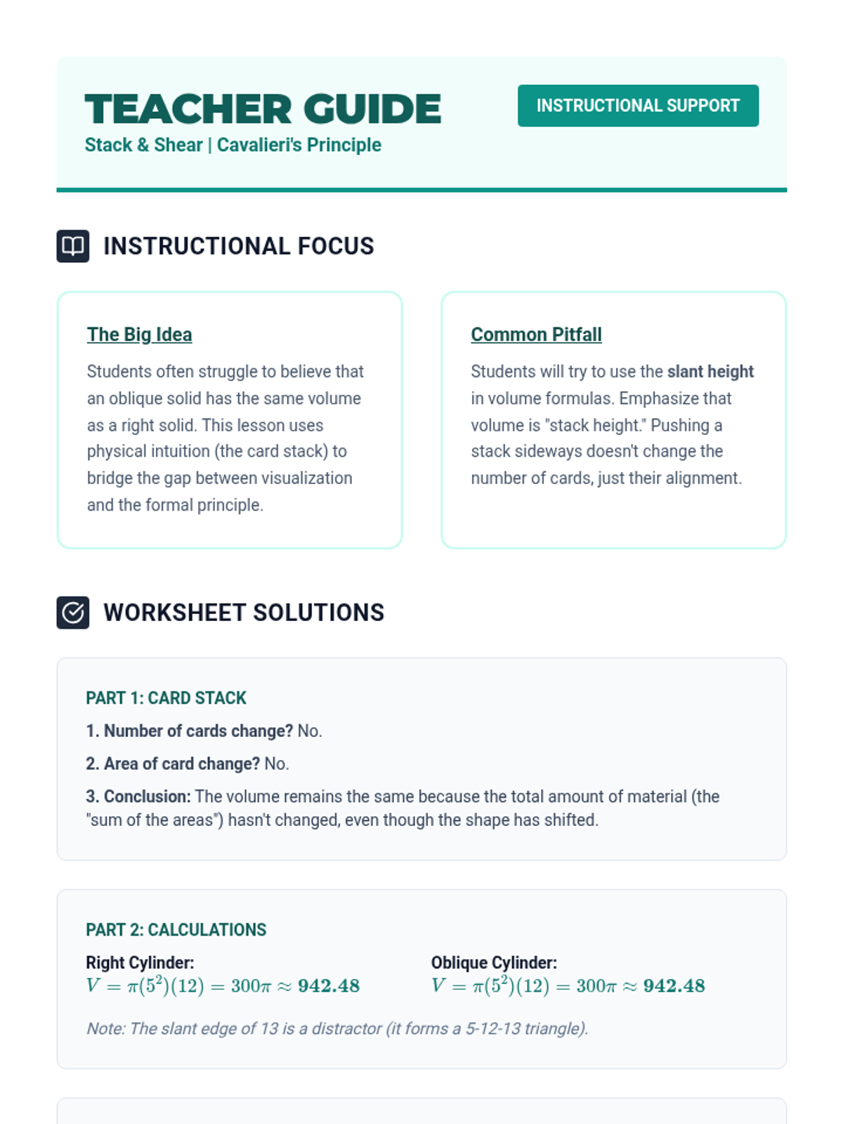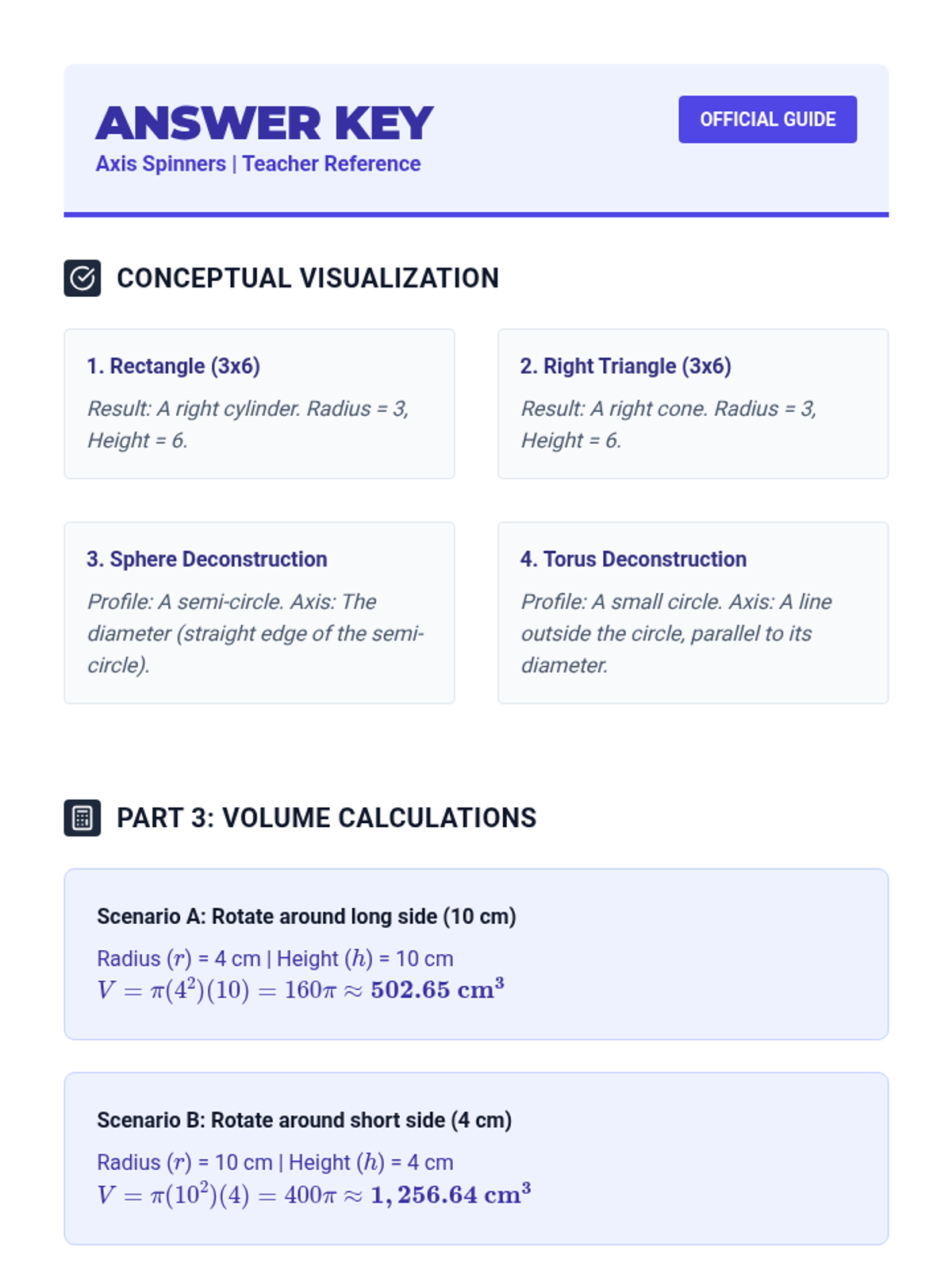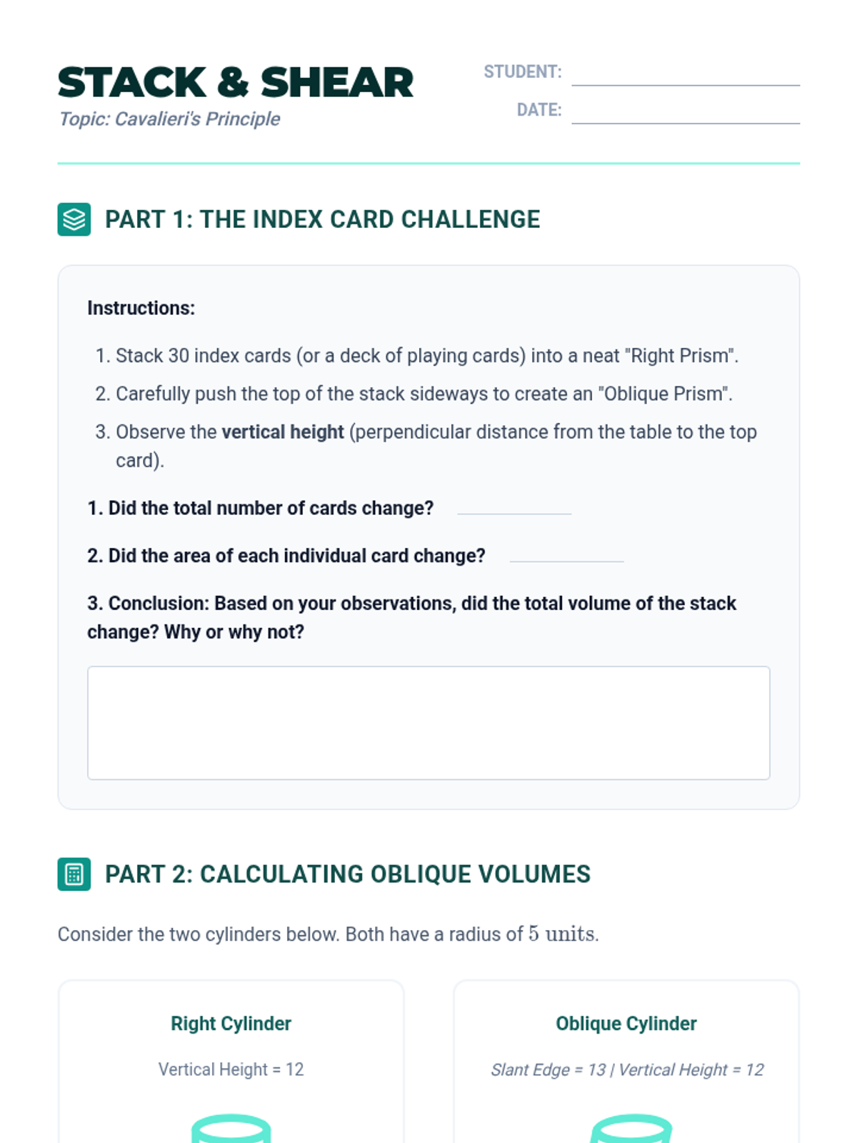 A project-based unit exploring the relationship between 2D shapes and 3D solids through cross-sections, rotations, volume principles, and real-world modeling. Students move from visualization to optimization, culminating in a container design challenge.