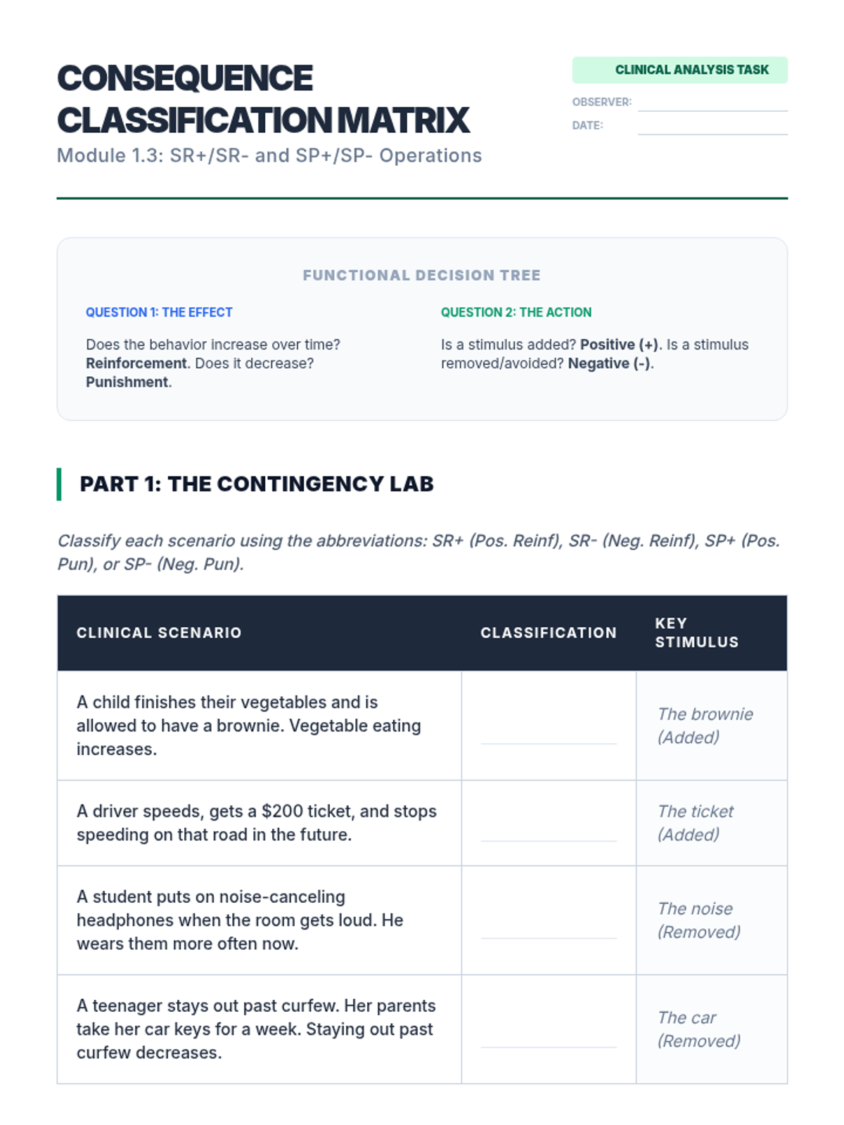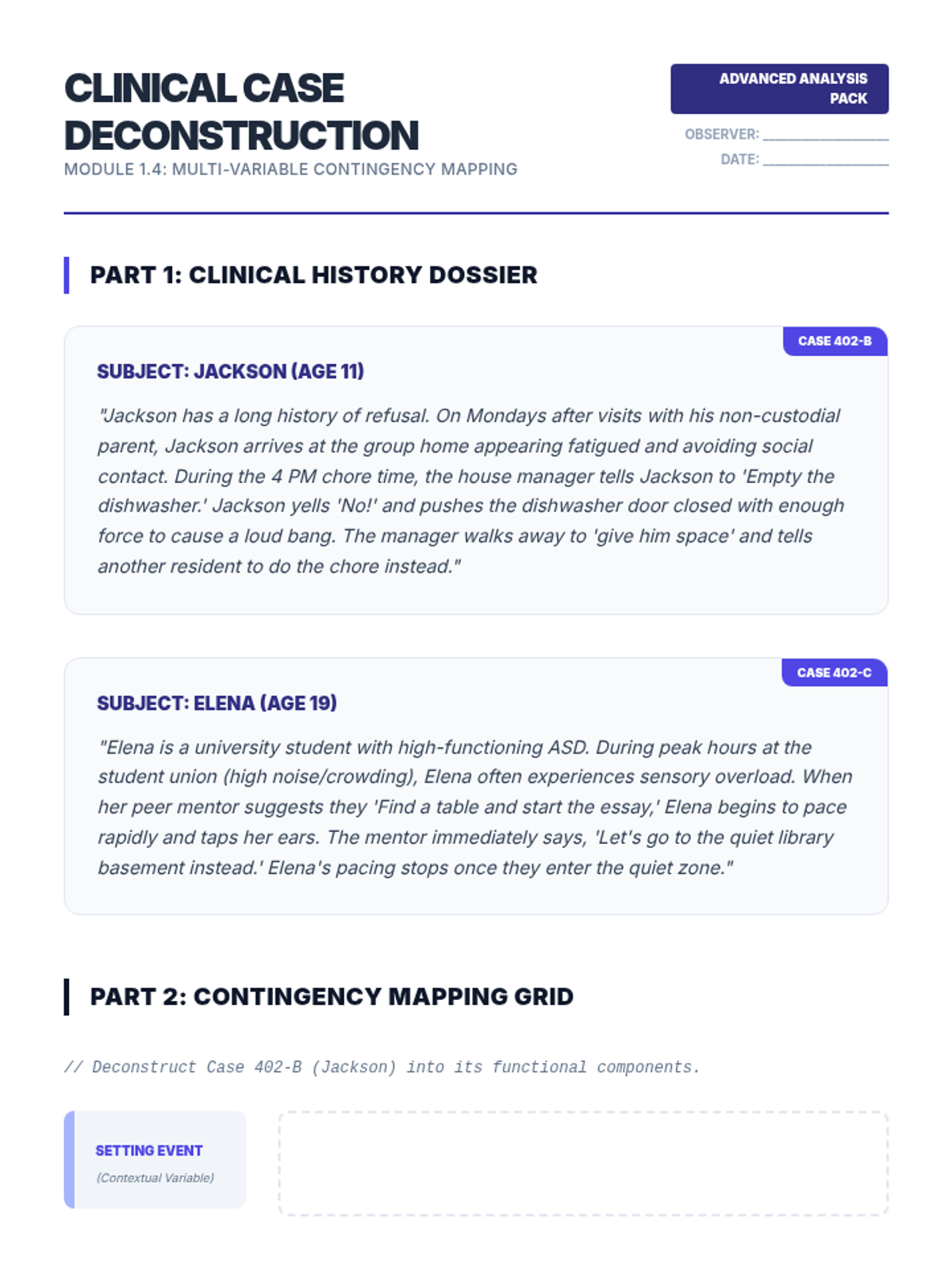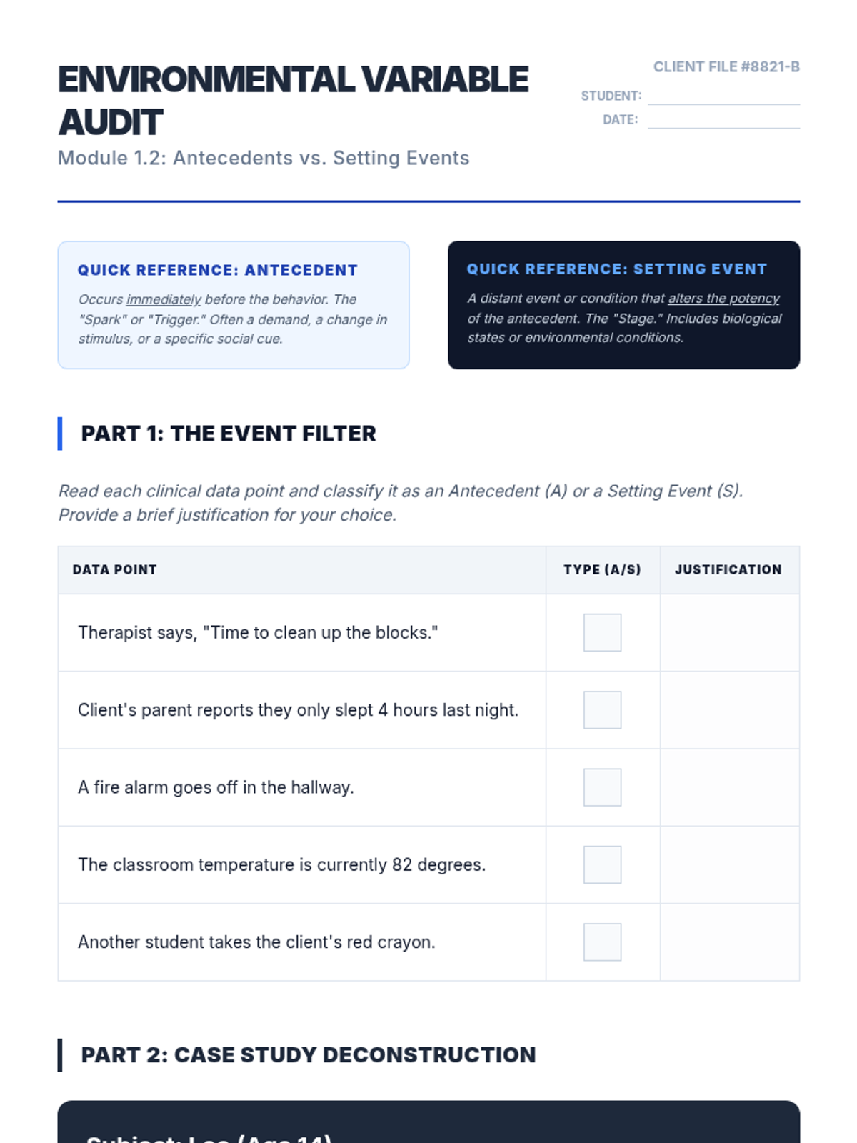 This sequence introduces undergraduate students to the three-term contingency in Applied Behavior Analysis (ABA). Students move from defining observable behaviors to identifying antecedents, setting events, and consequences, ultimately synthesizing complex clinical data into professional narratives.
