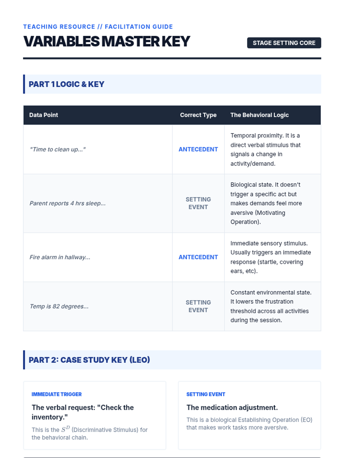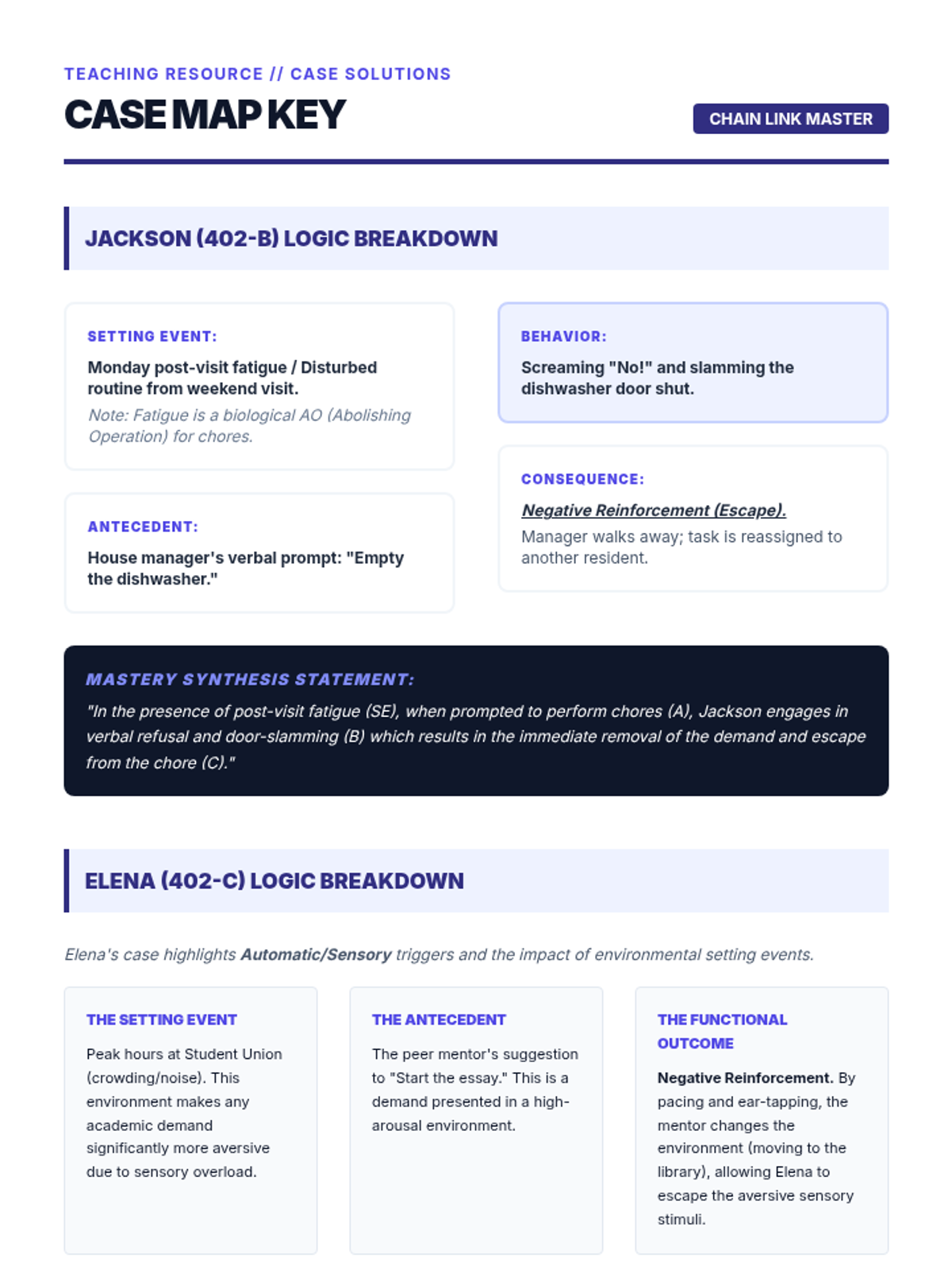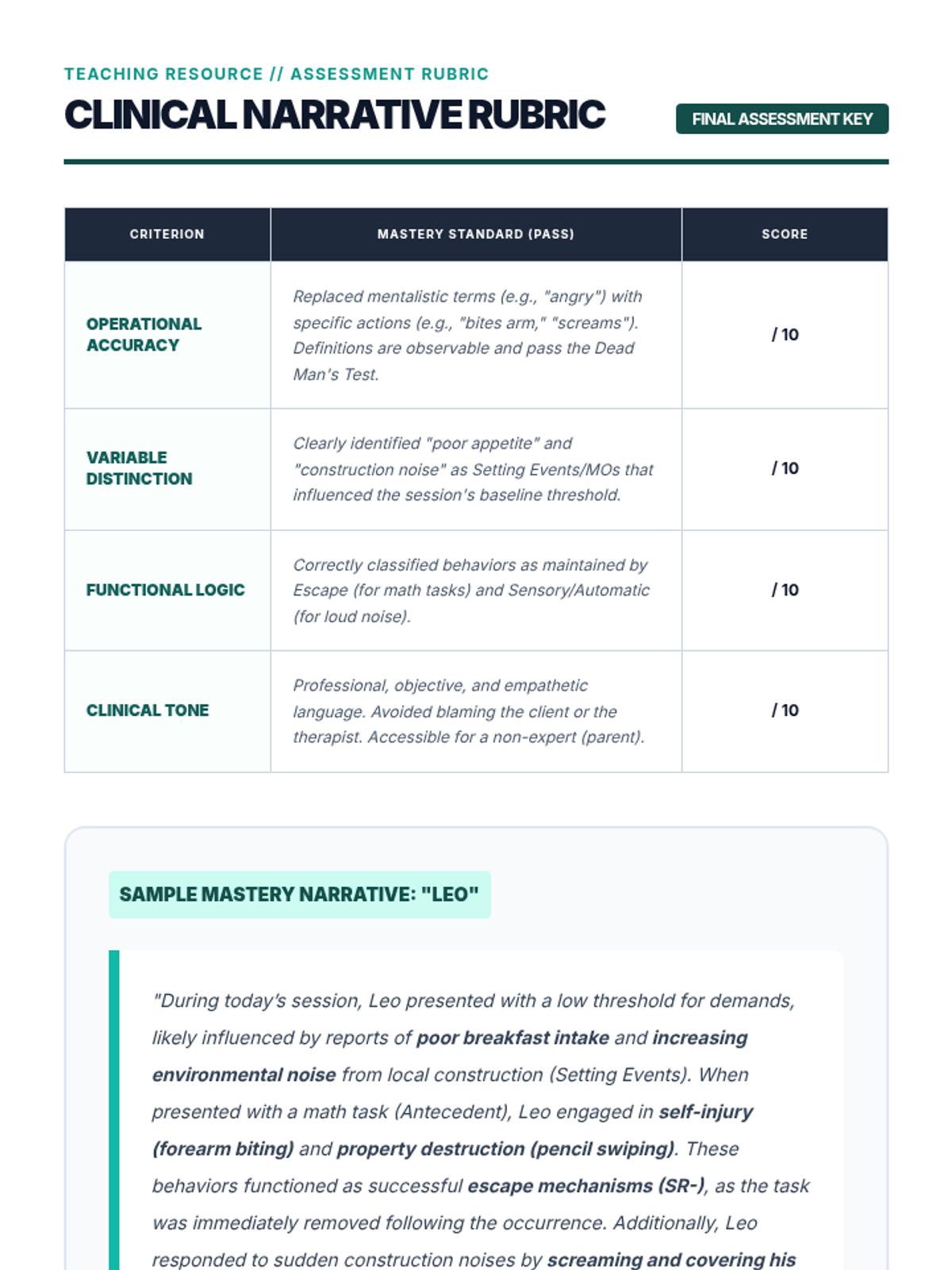 This sequence introduces undergraduate students to the three-term contingency in Applied Behavior Analysis (ABA). Students move from defining observable behaviors to identifying antecedents, setting events, and consequences, ultimately synthesizing complex clinical data into professional narratives.