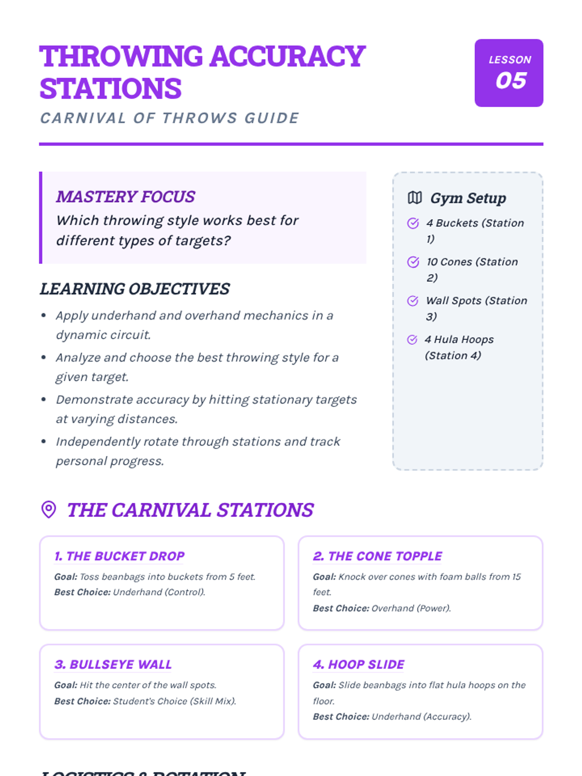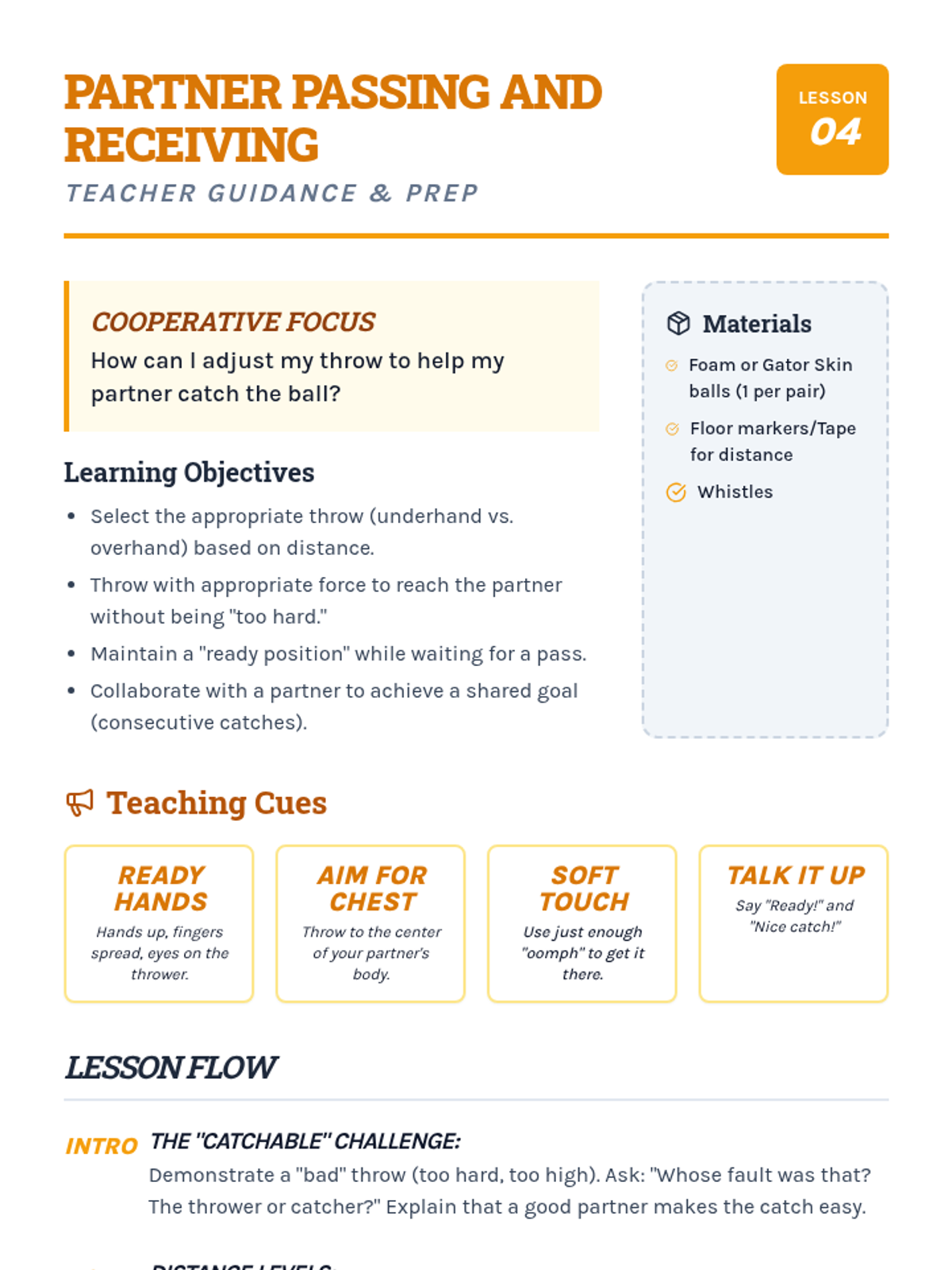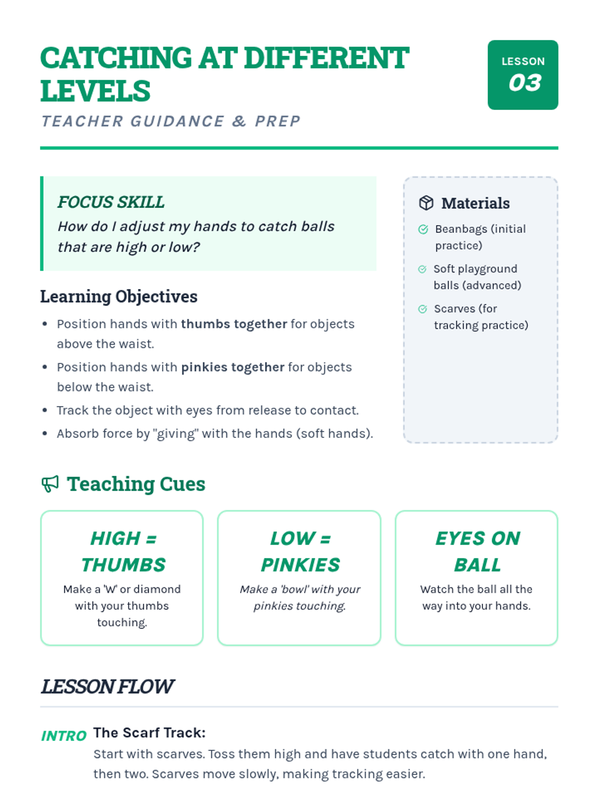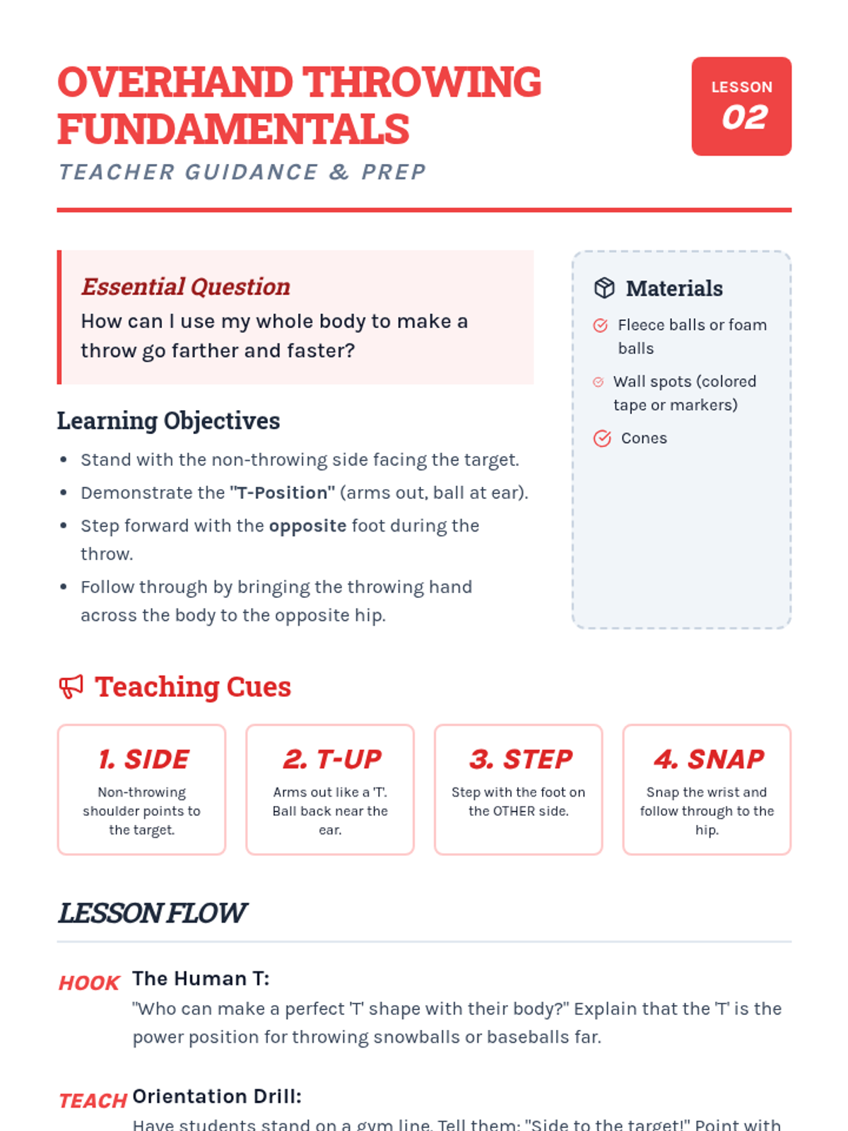 A comprehensive physical education sequence for 2nd graders focused on mastering the mechanics of underhand and overhand throwing, alongside essential catching techniques. Students will progress from individual skill-building to cooperative partner play and accuracy challenges.