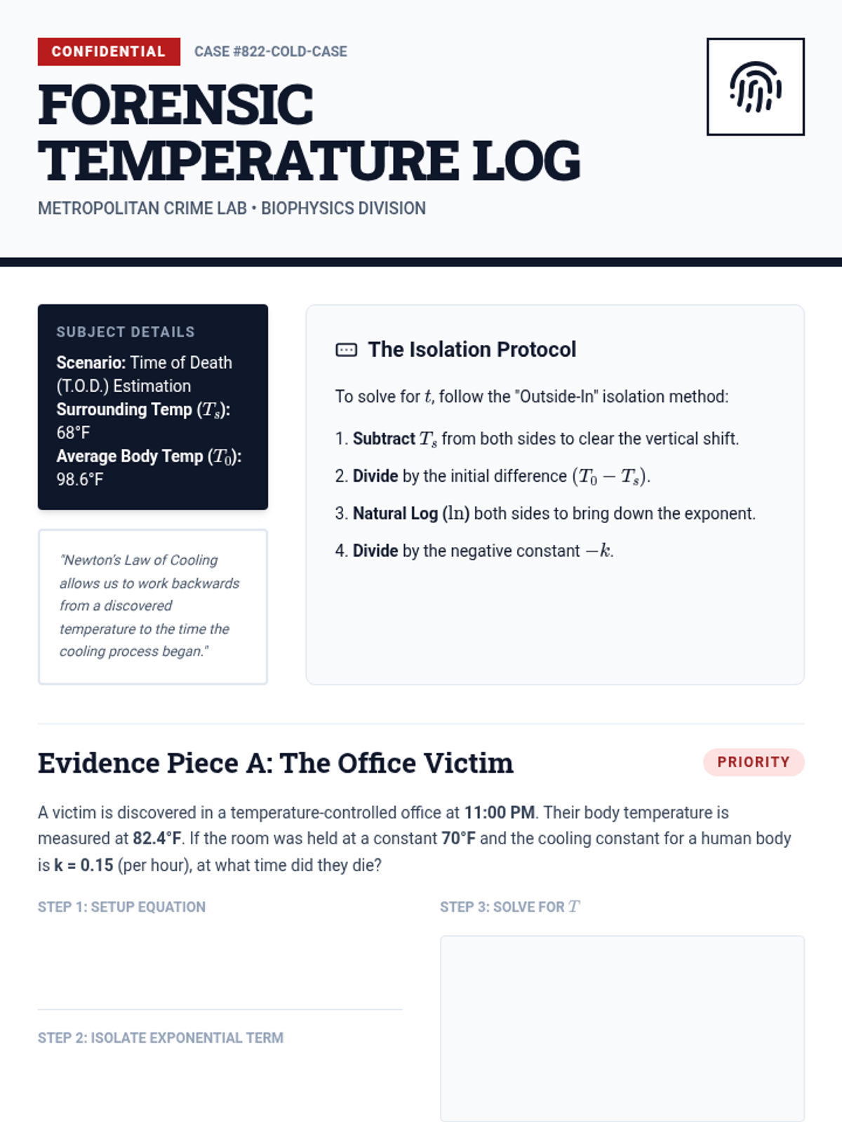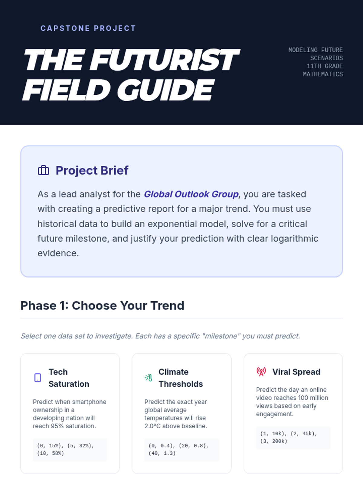 A comprehensive 11th-grade unit where students apply logarithmic solving techniques to real-world exponential growth and decay scenarios. Students act as financial planners, archaeologists, ecologists, and forensic scientists to solve for the time variable in complex equations.