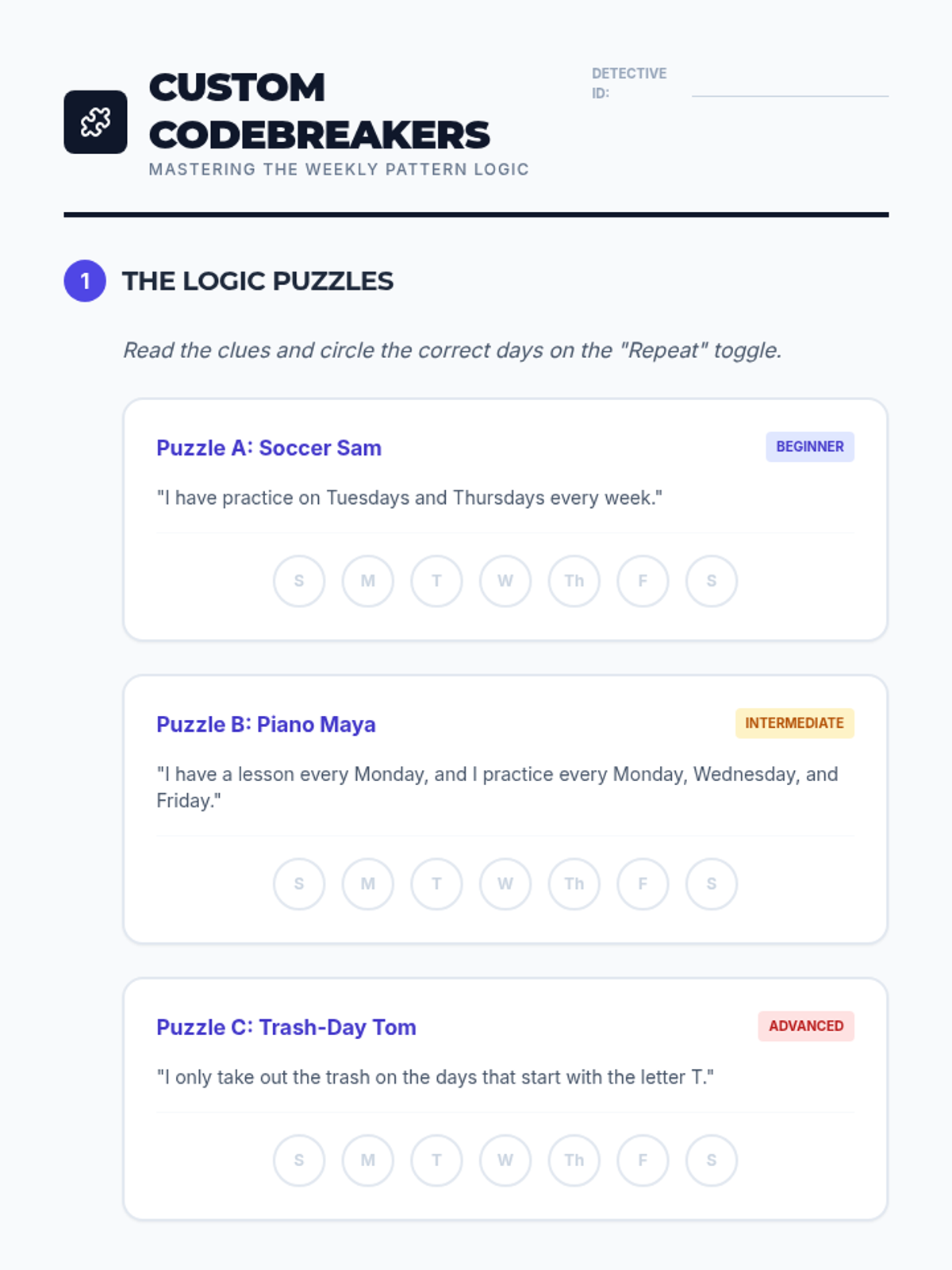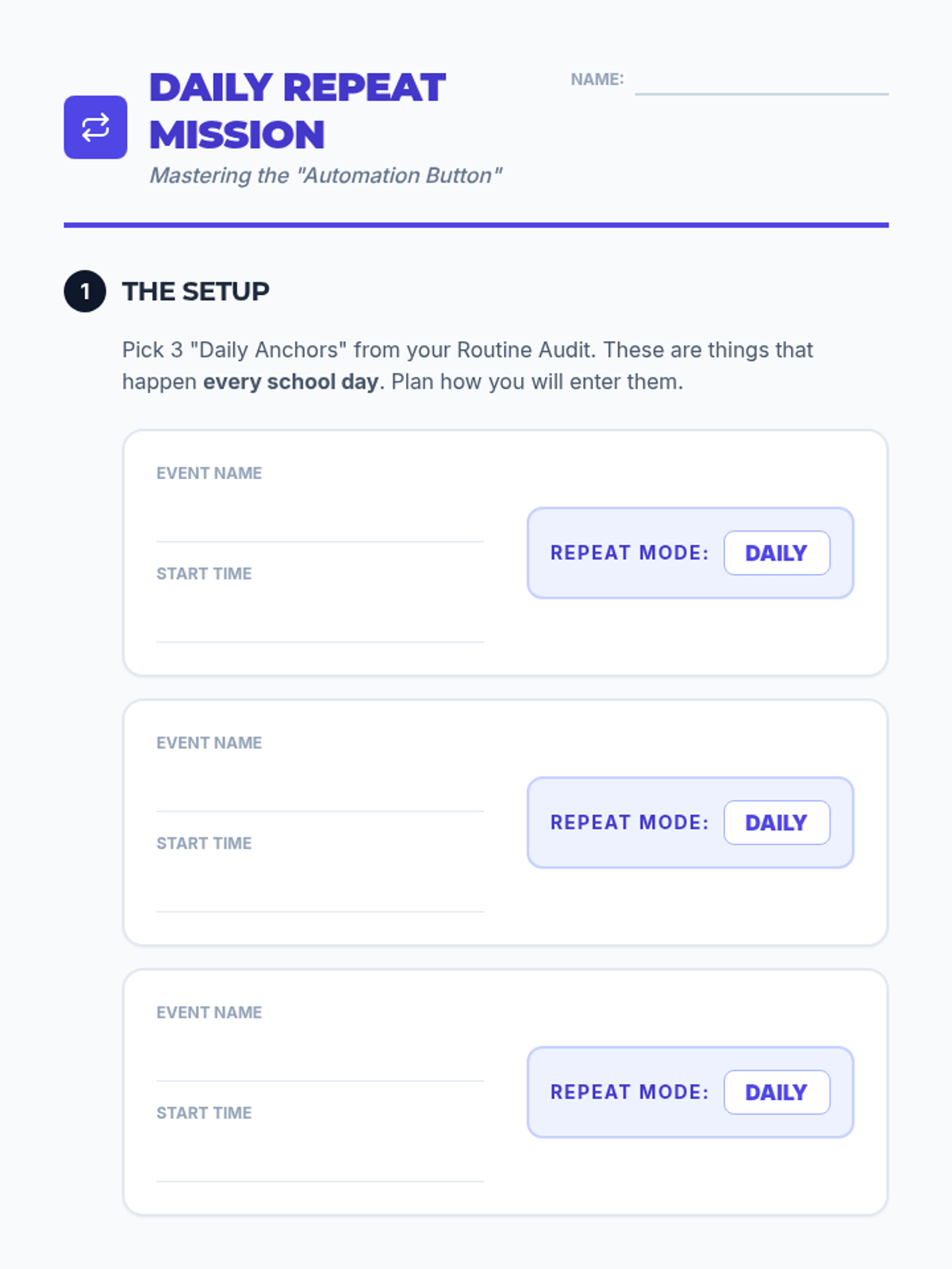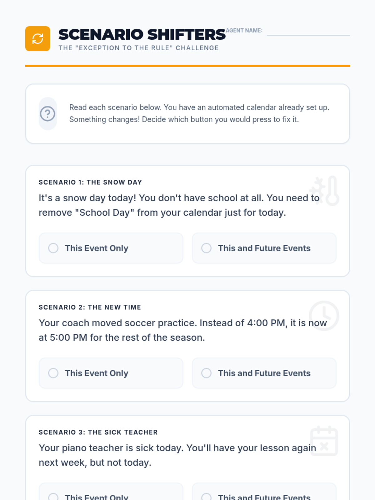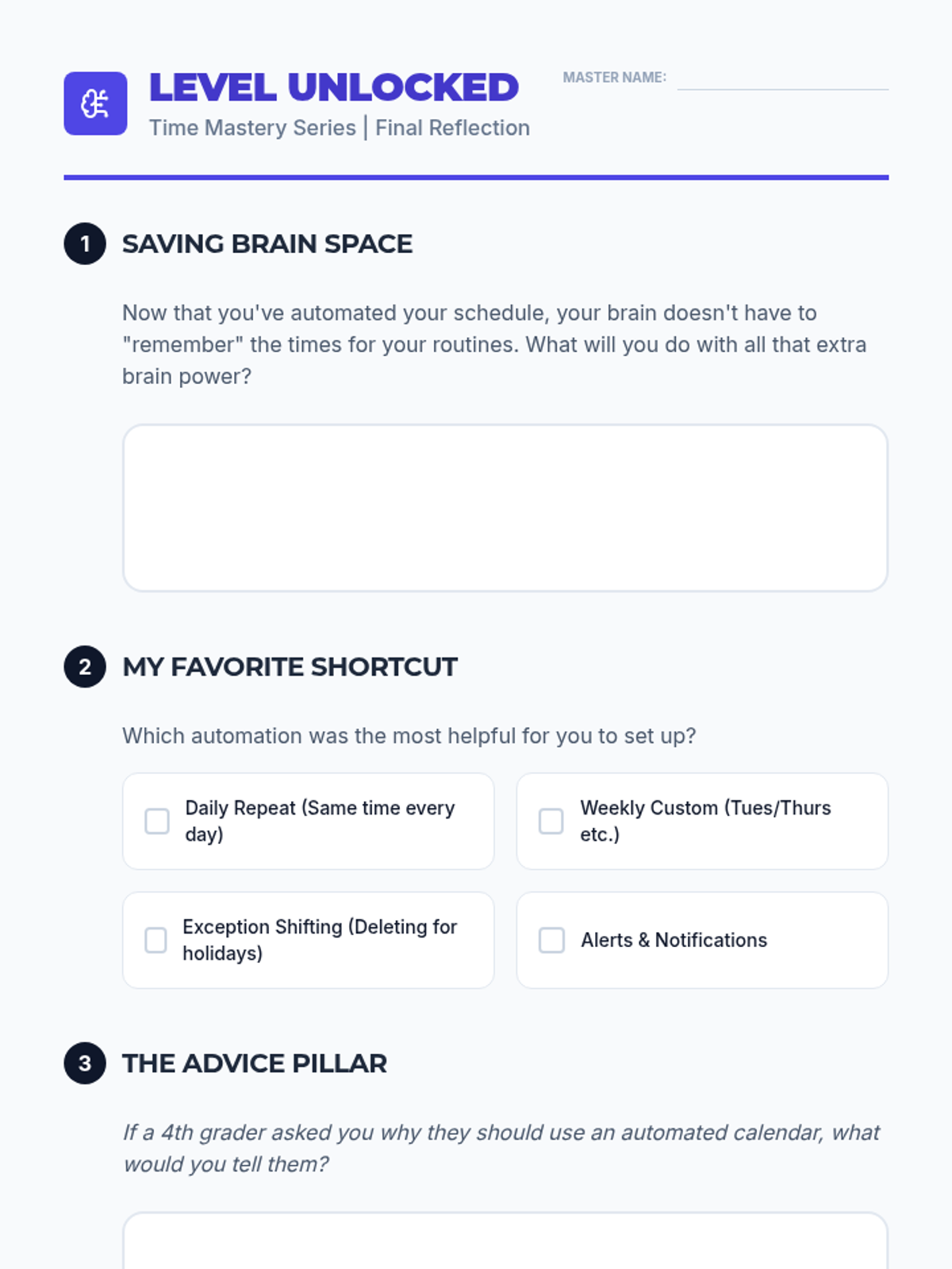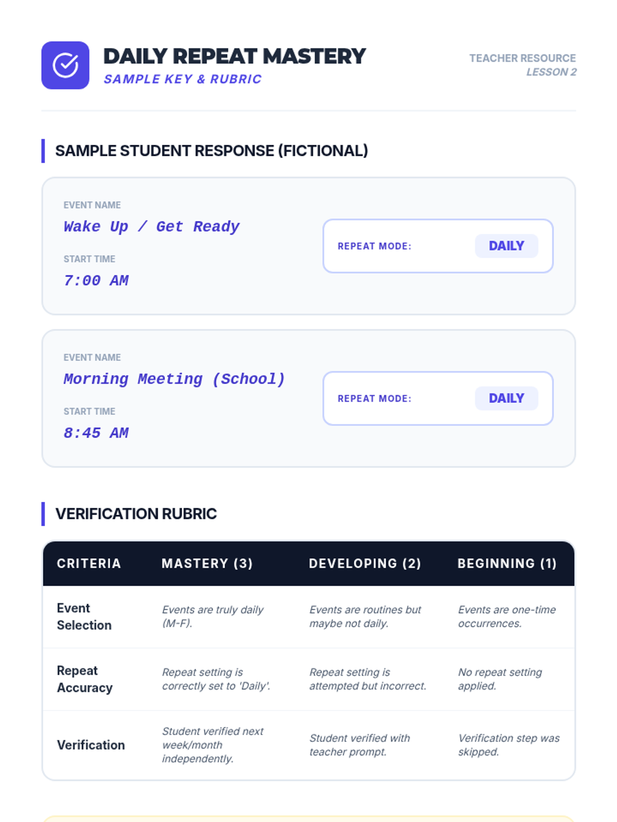A comprehensive sequence for 5th-grade students focusing on digital calendar automation. Students learn to identify routines, set daily and weekly recurrences, and manage exceptions to build a foundational 'skeleton schedule' that supports executive function and working memory.