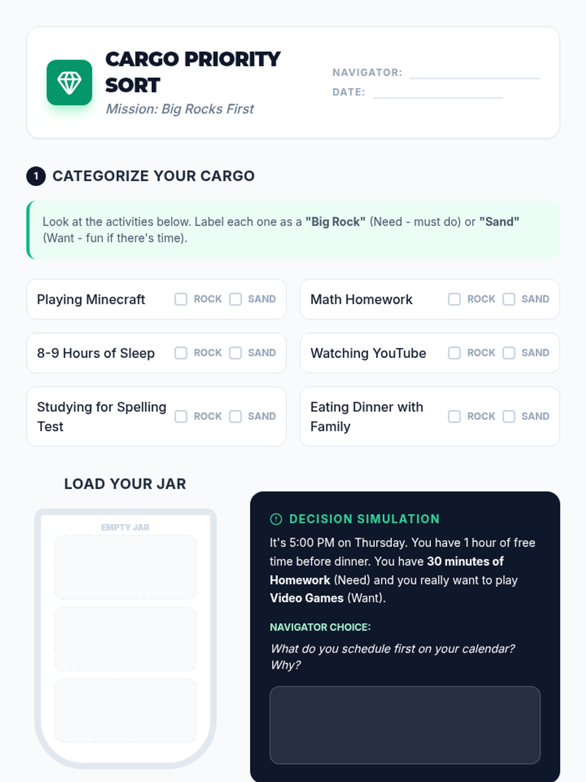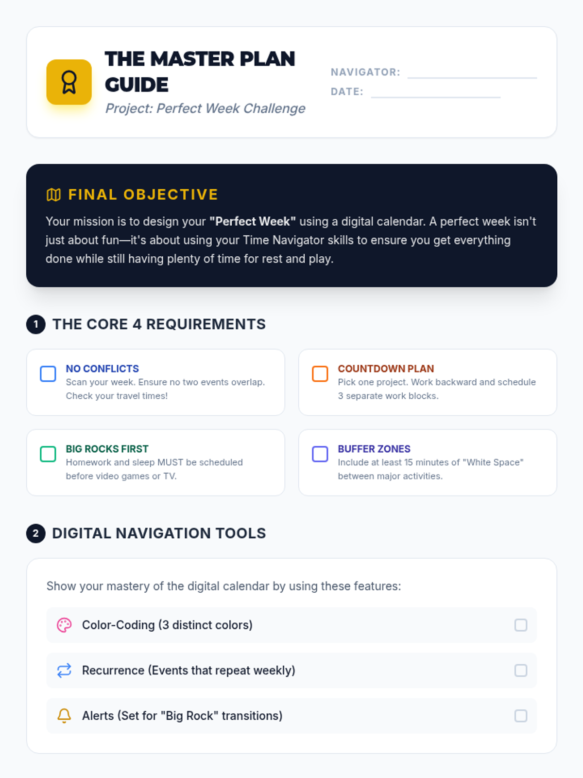 A 5th-grade sequence focusing on using digital calendars for independent planning, conflict resolution, and task prioritization. Students transition from passive scheduling to active time management, preparing them for the organizational demands of middle school.