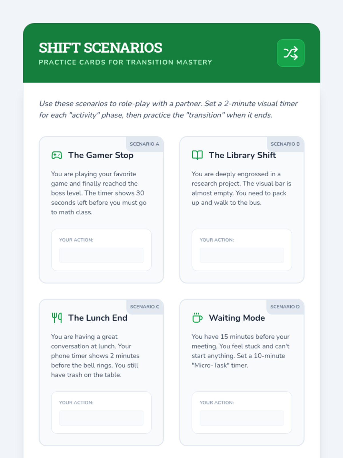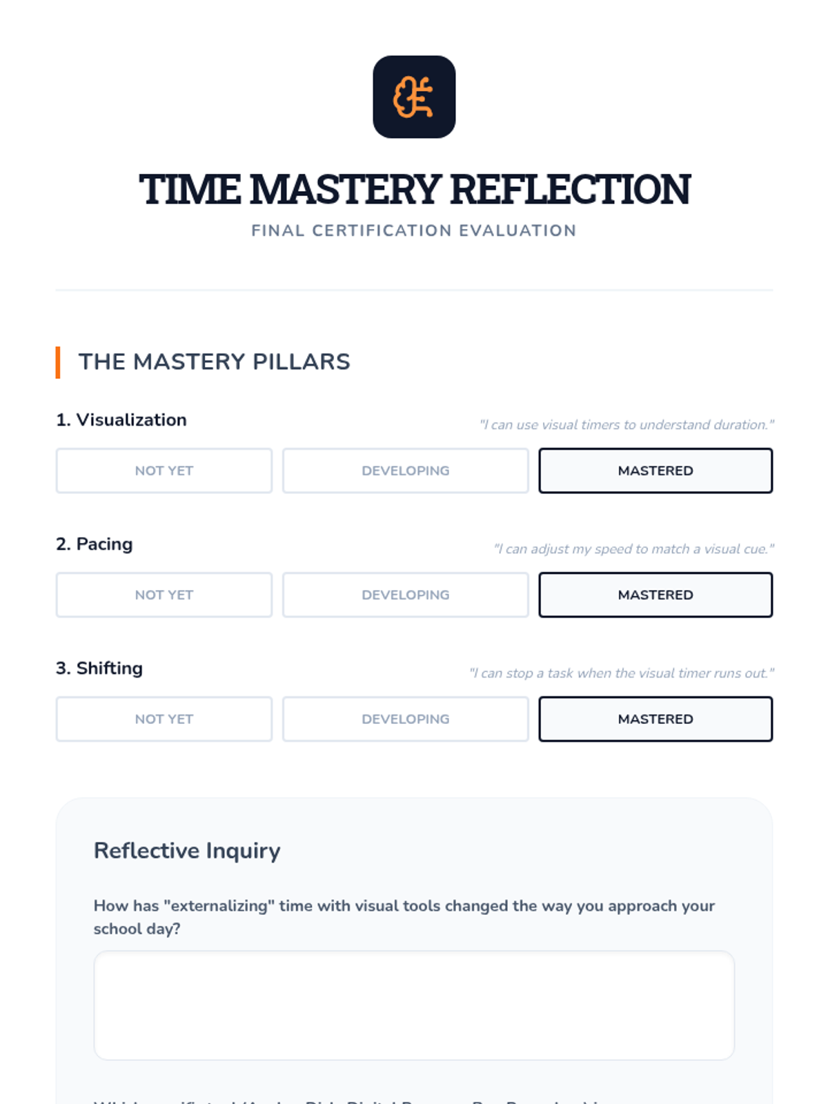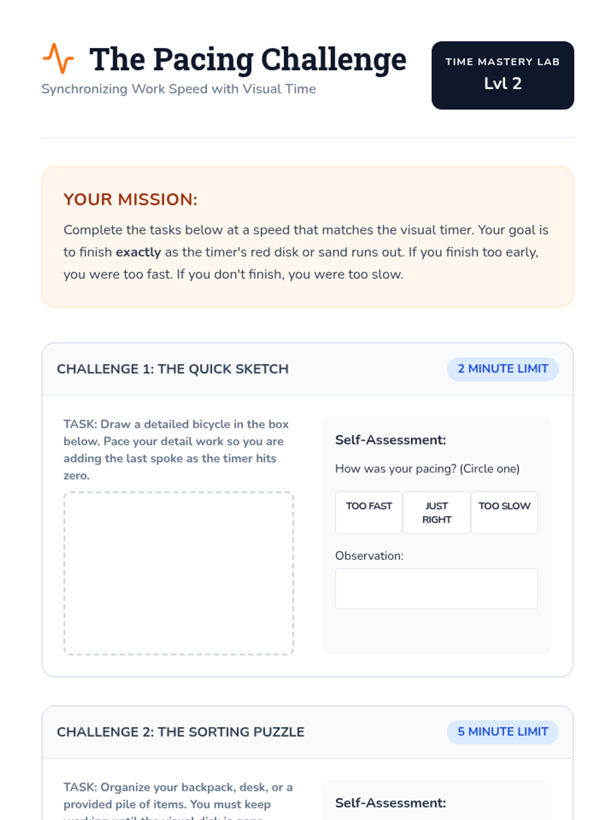 This sequence helps neurodivergent students address 'time blindness' by using visual timers. Students progress from investigating their own time perception to mastering transition strategies and managing multi-step tasks using analog and digital countdown tools.