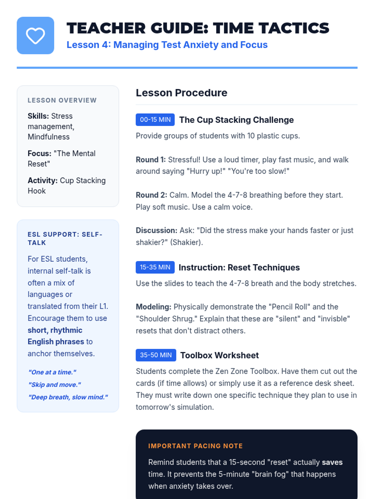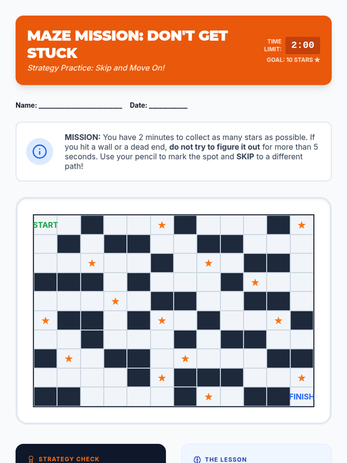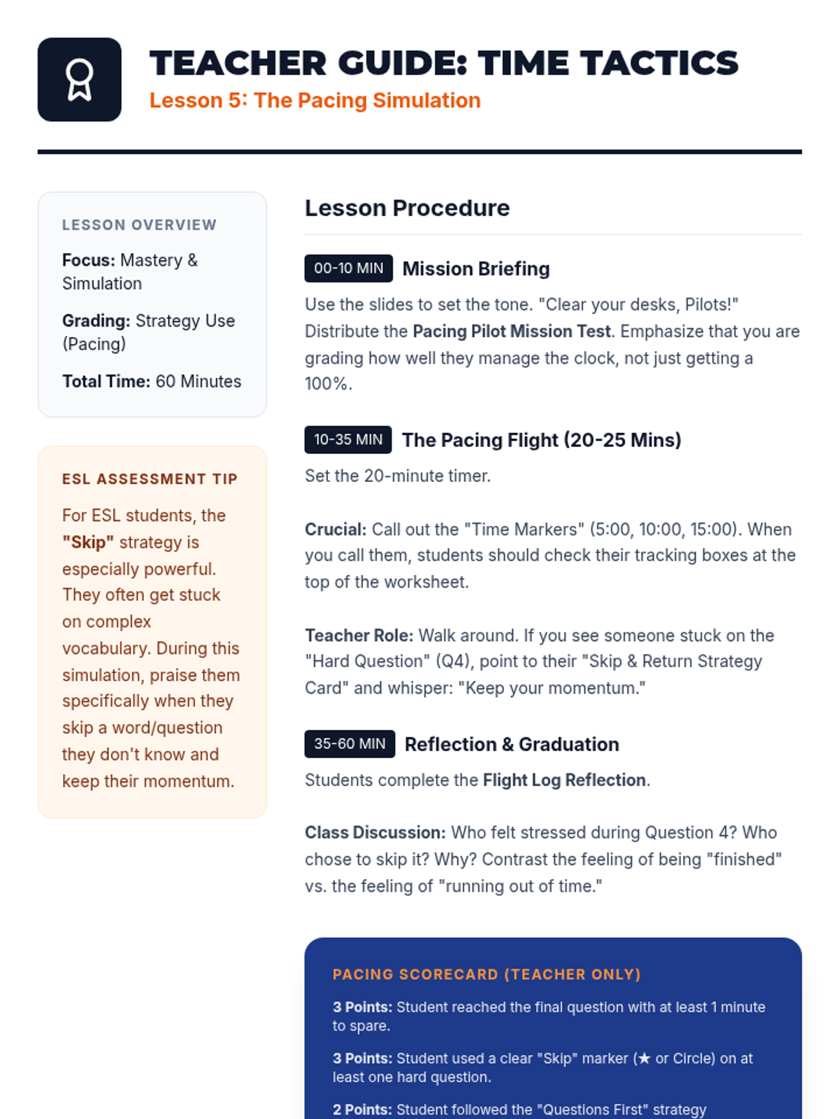 This sequence helps students master time management and prioritization during exams. Through hands-on activities and simulations, students learn to estimate pacing, use the 'skip and return' strategy, navigate long passages efficiently, and manage test anxiety.