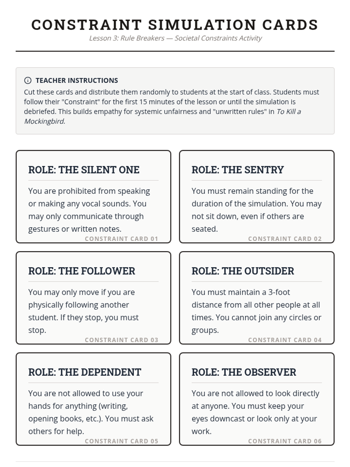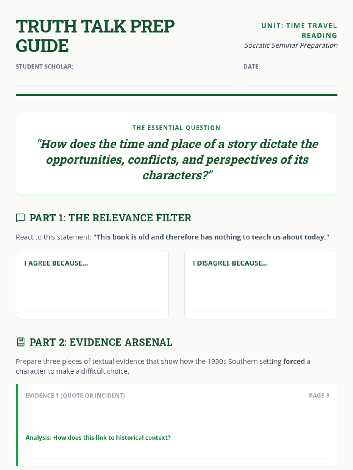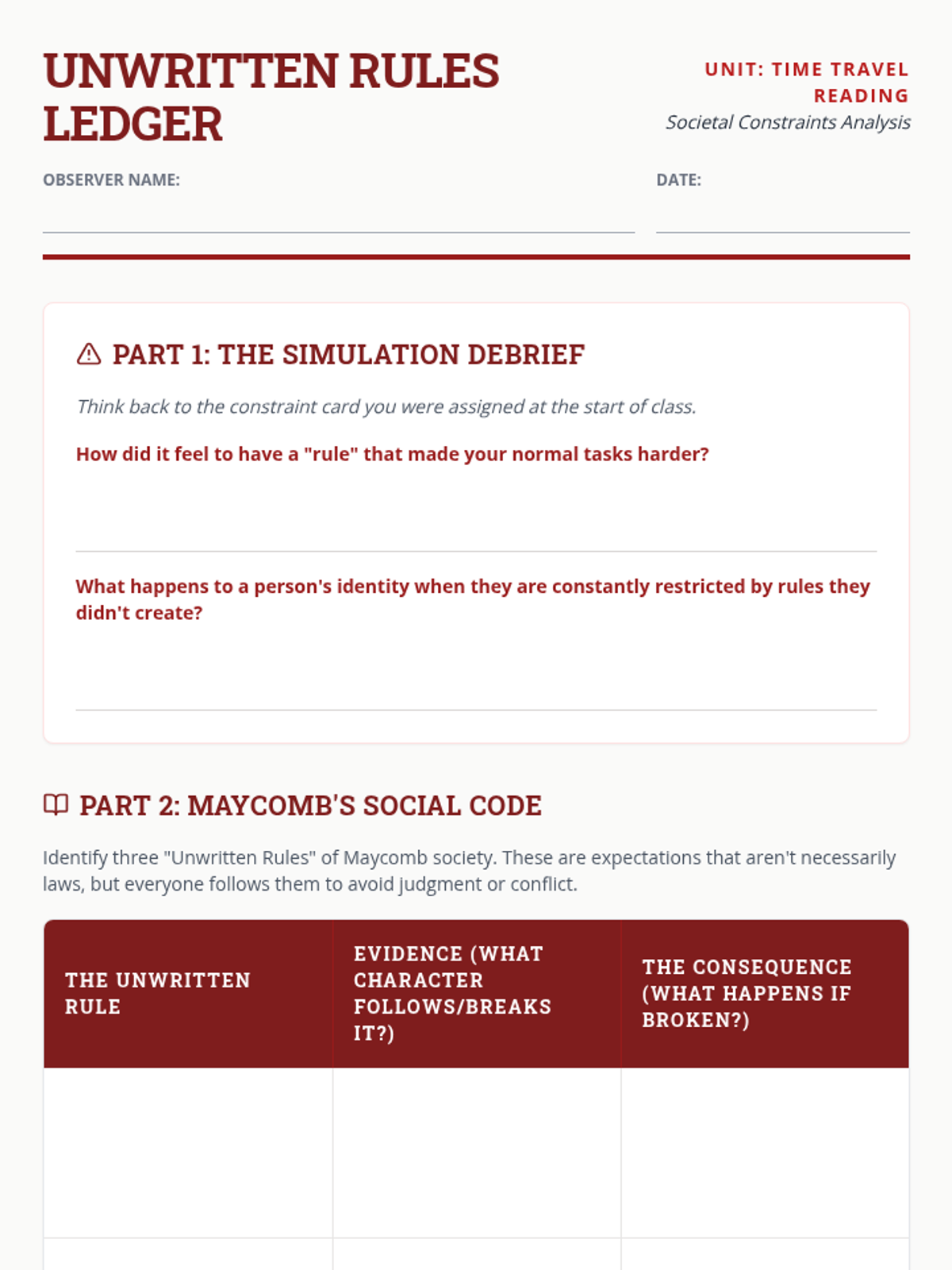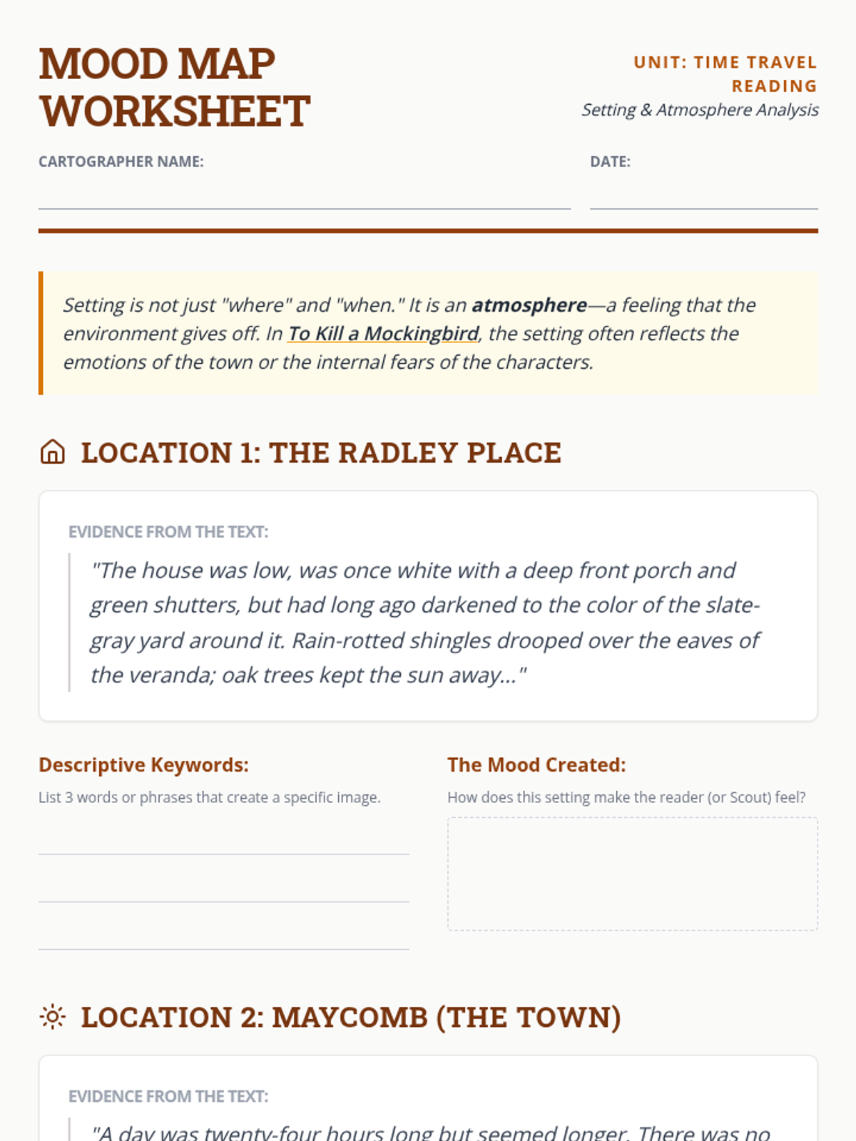 This sequence situates a novel (exemplified by 'To Kill a Mockingbird') within its specific 1930s Southern context, exploring how historical, social, and physical environments shape character choices and perspectives. Students engage in research, atmospheric analysis, and a culminating Socratic Seminar to connect historical themes to modern relevance.