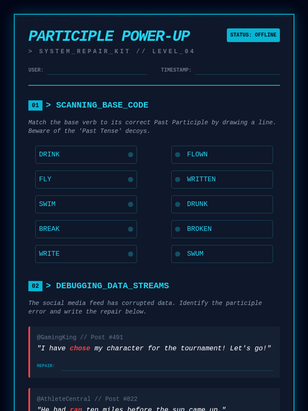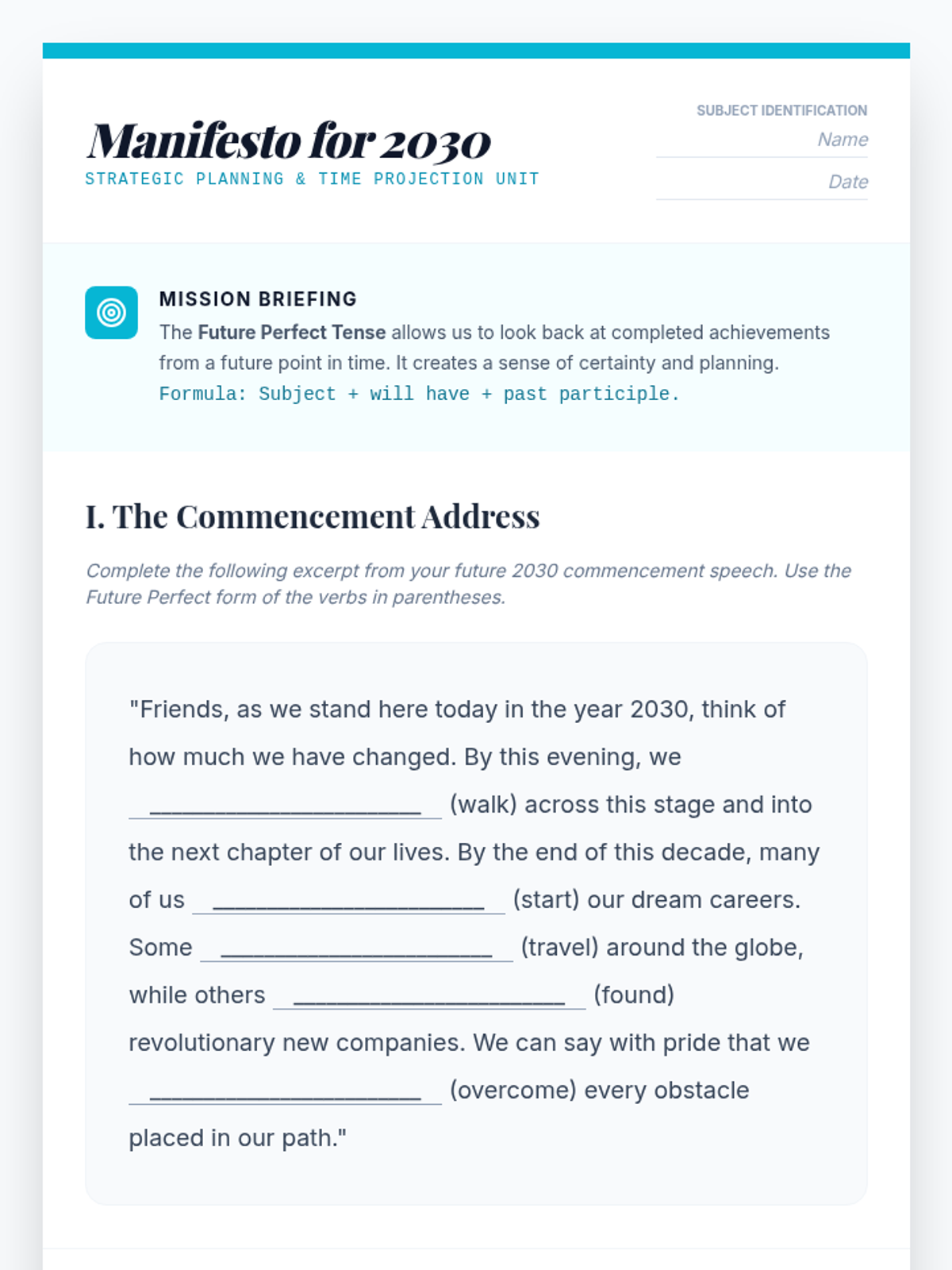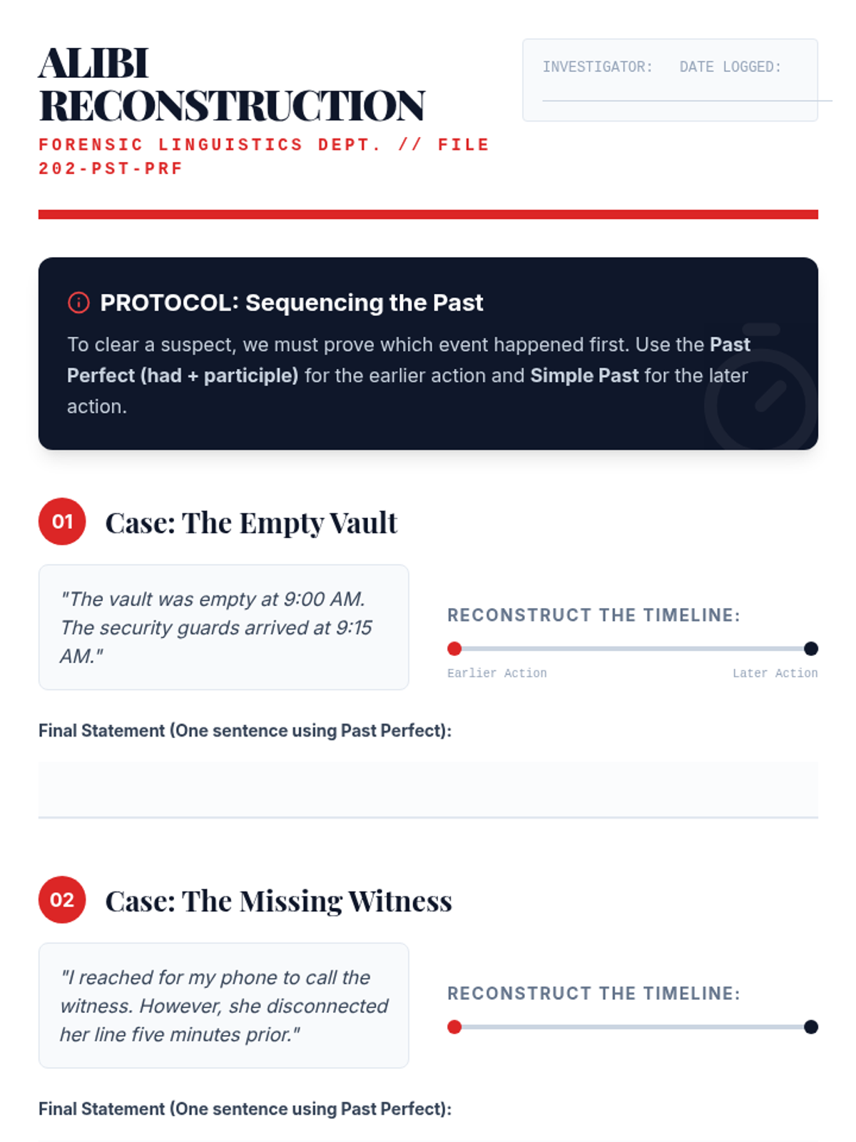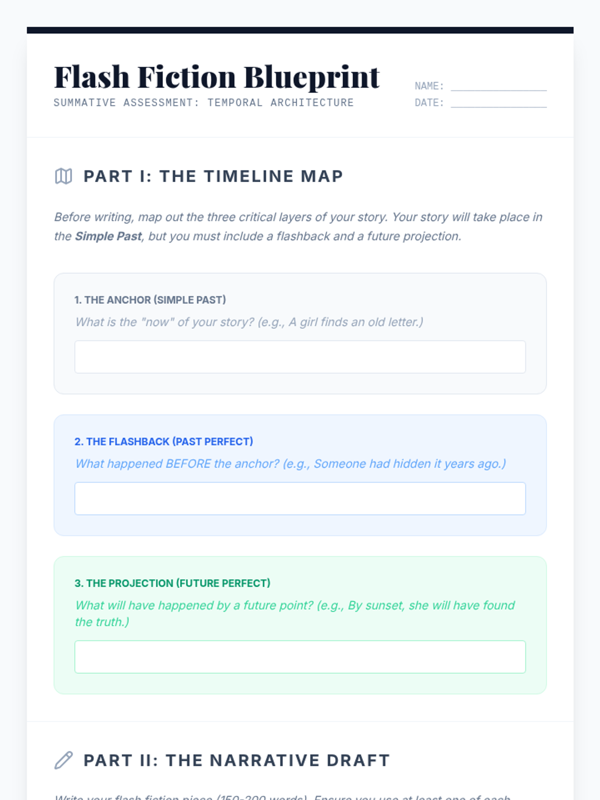 A 9th-grade grammar unit focusing on the perfect verb tenses (present, past, and future). Students use visual timelines, logic puzzles, and creative writing to master complex sequences and causality.