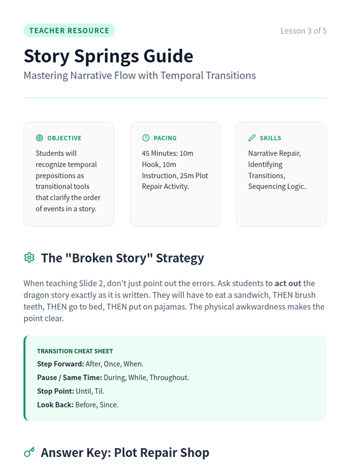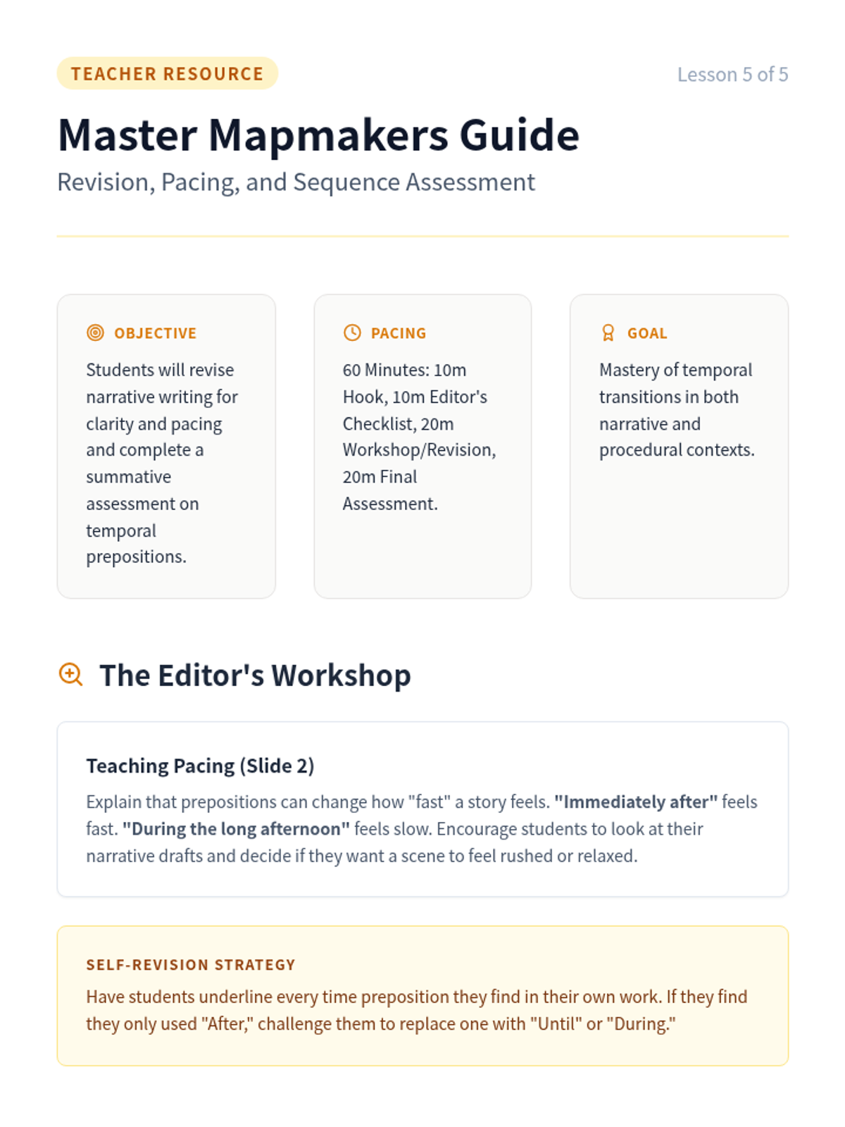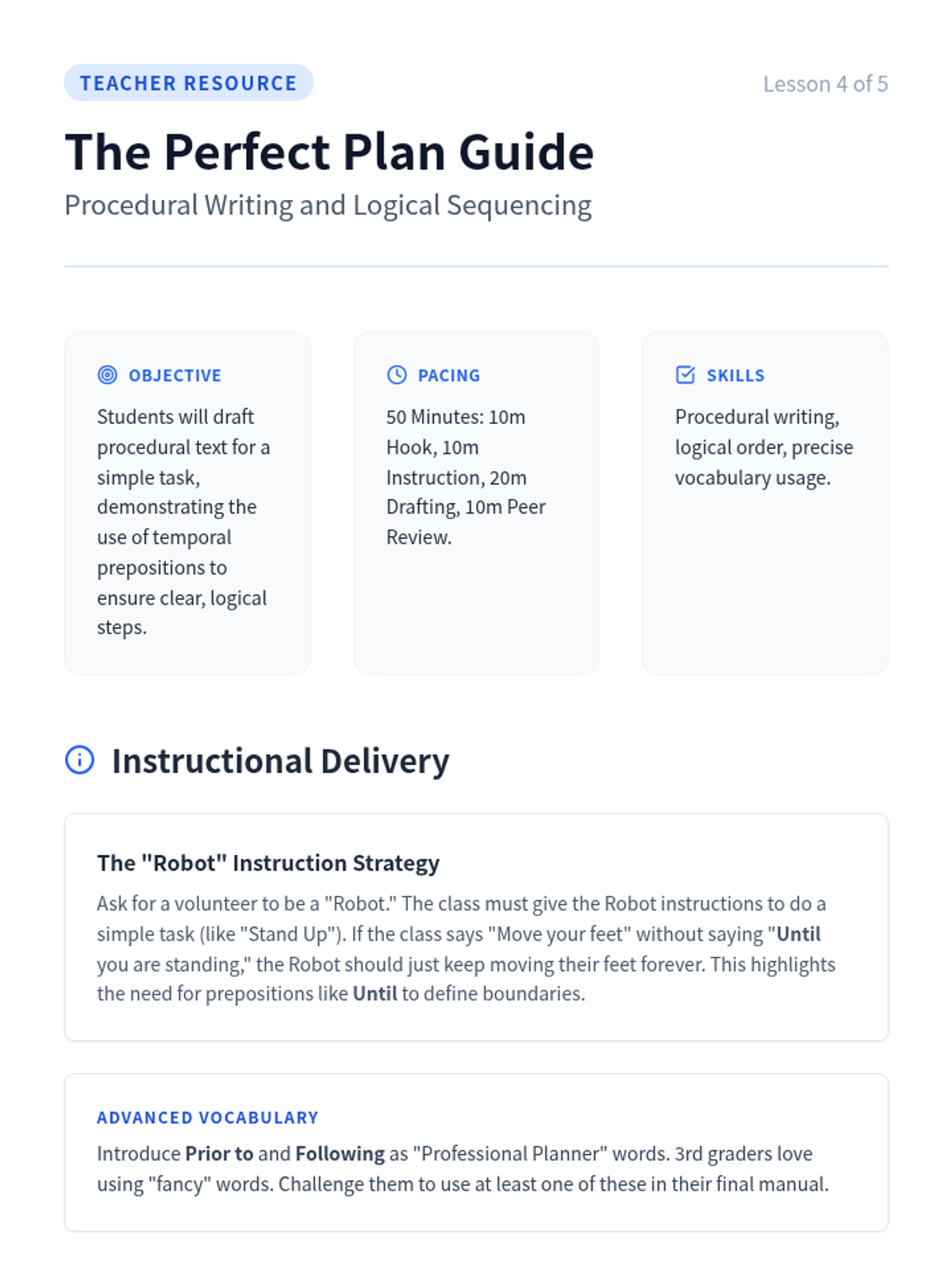 A 3rd-grade grammar sequence focusing on temporal prepositions (before, after, during, until, etc.) to help students order events in narratives and instructions. Students progress from distinguishing time vs. space prepositions to applying them in their own procedural and narrative writing.