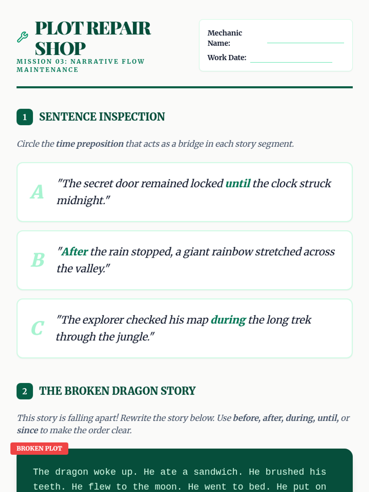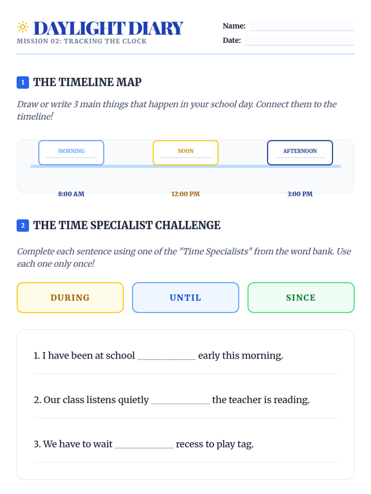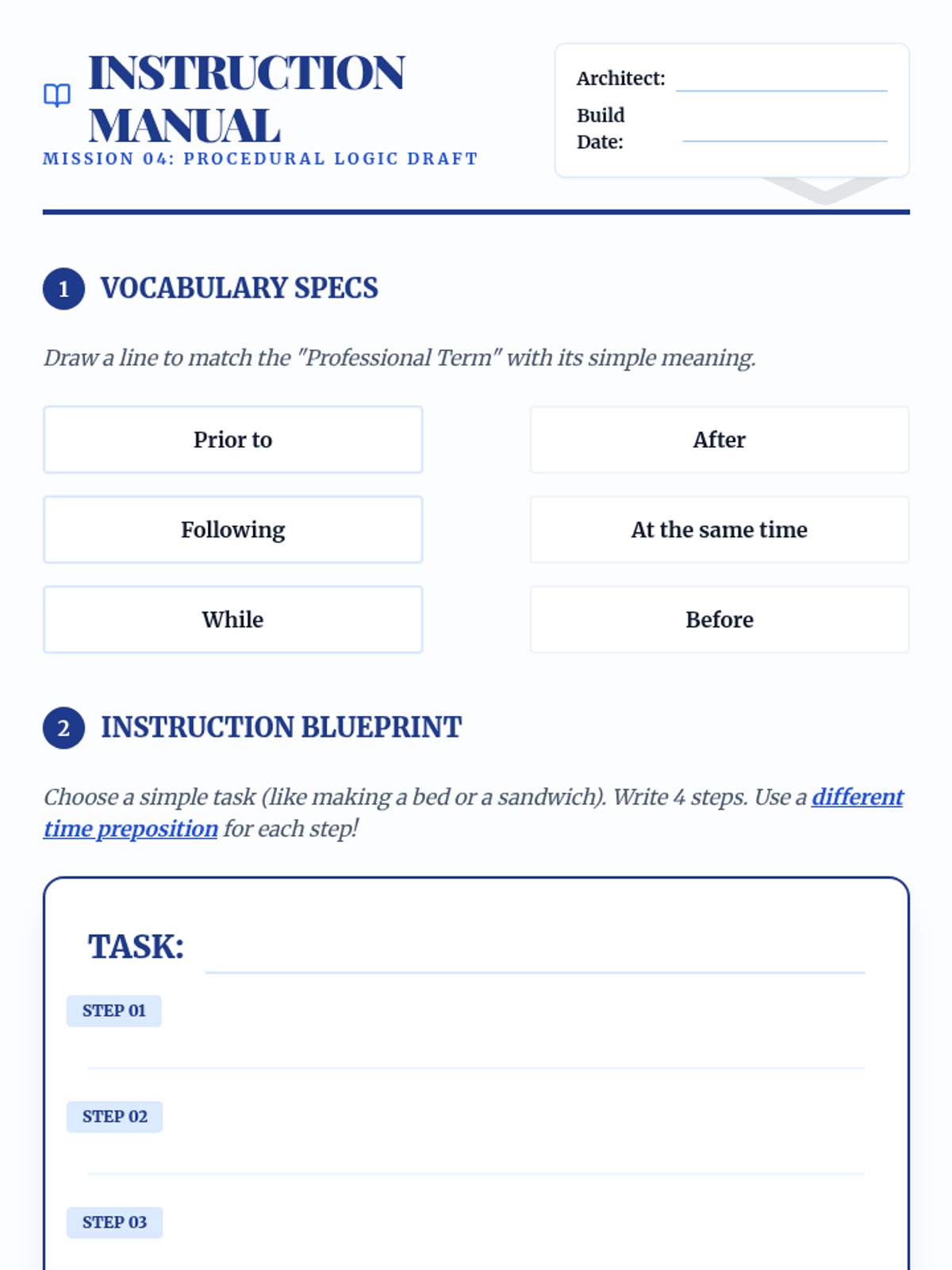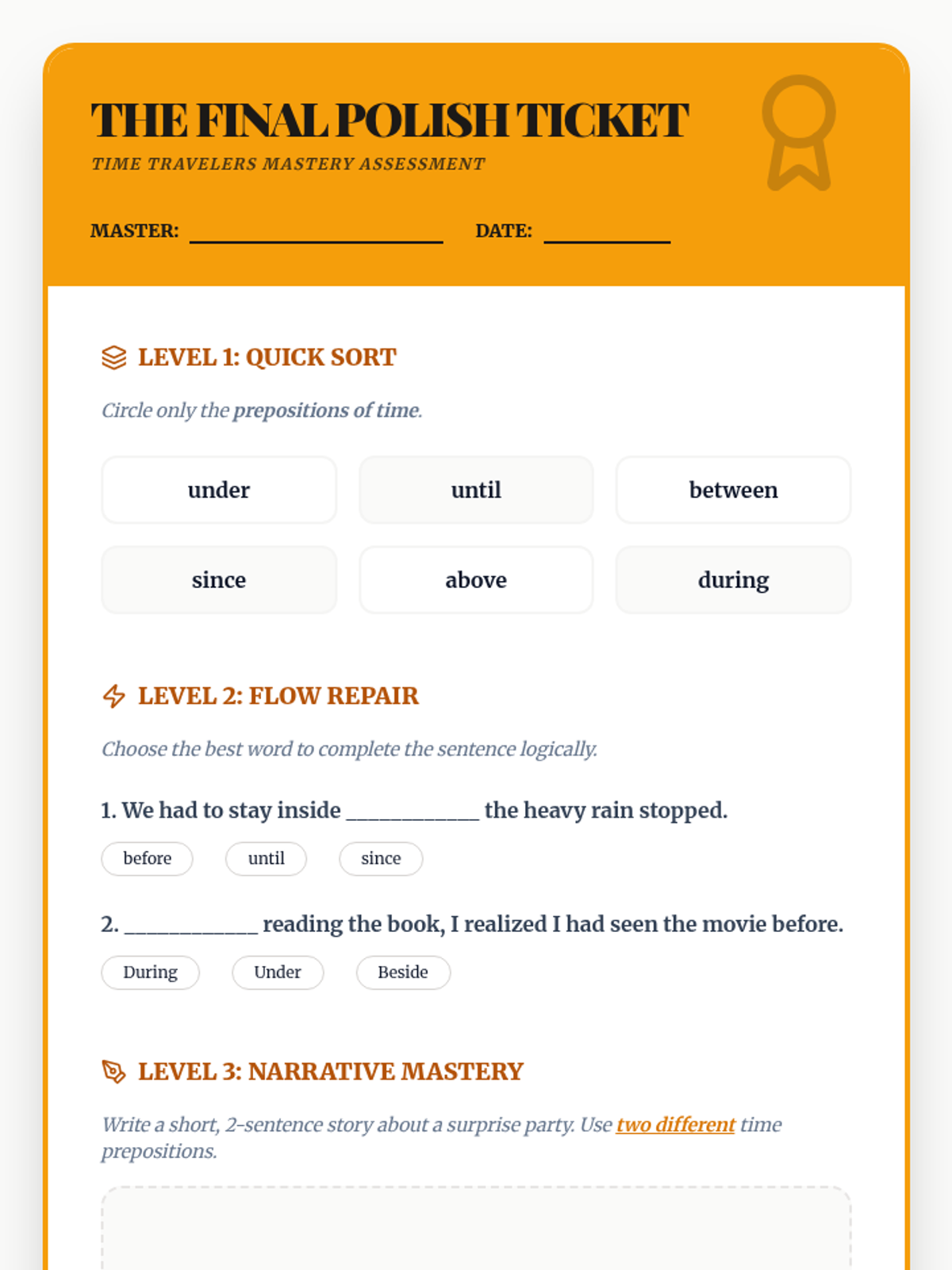 A 3rd-grade grammar sequence focusing on temporal prepositions (before, after, during, until, etc.) to help students order events in narratives and instructions. Students progress from distinguishing time vs. space prepositions to applying them in their own procedural and narrative writing.