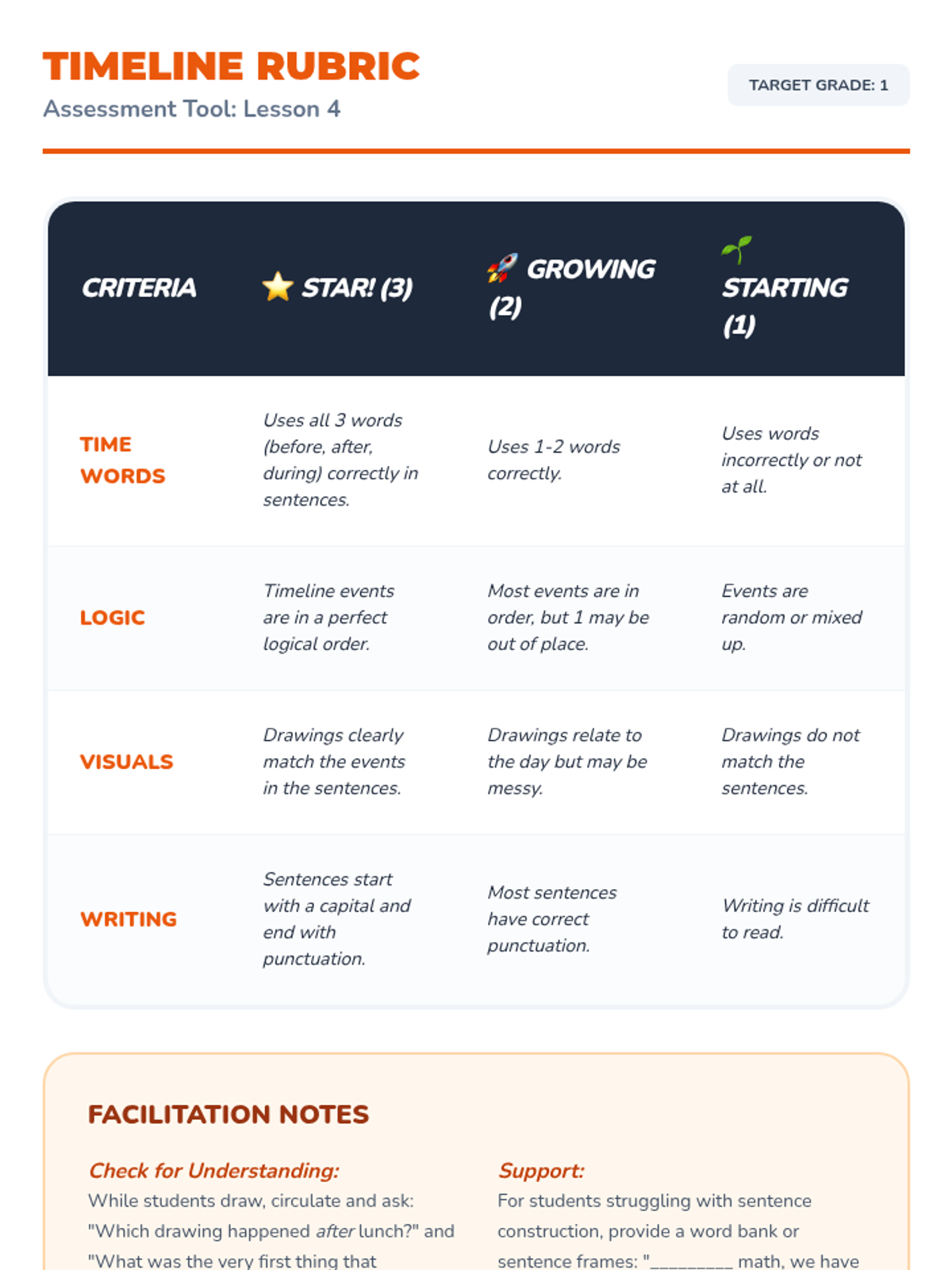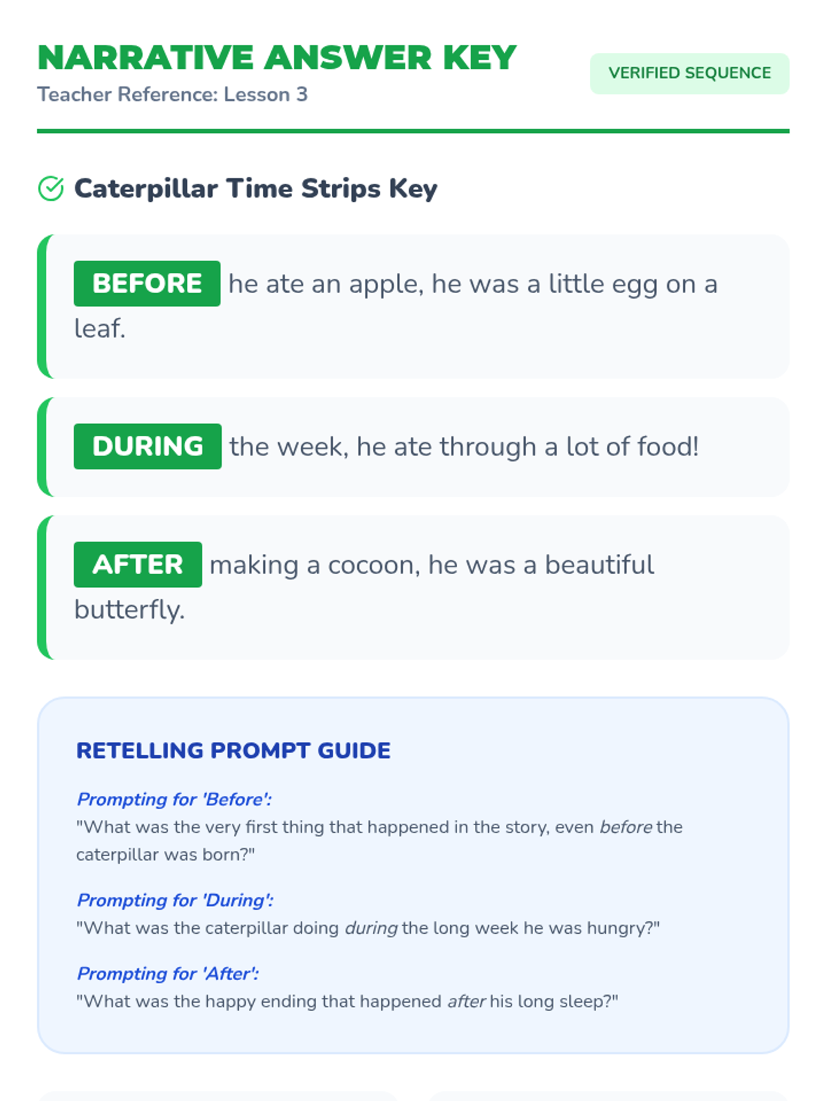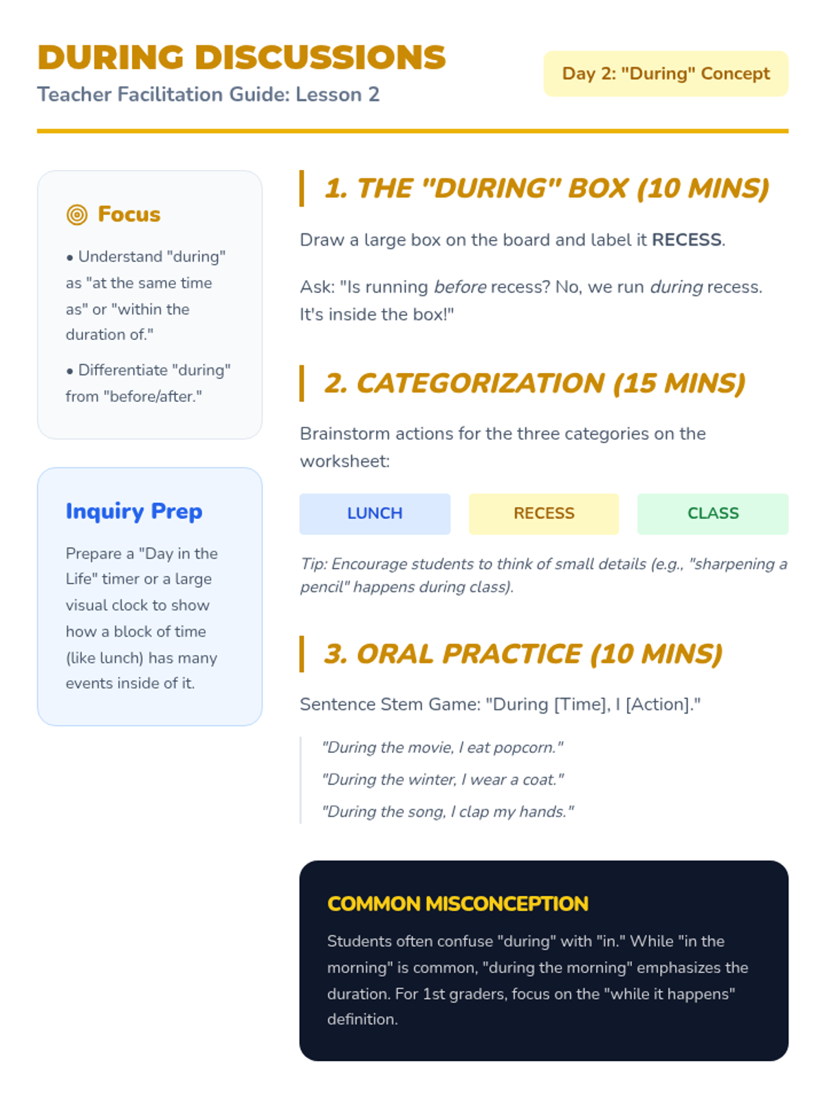 A 1st-grade sequence exploring temporal prepositions (before, after, during) through daily routines, story retelling, and timeline creation to master sequencing and time-based grammar.