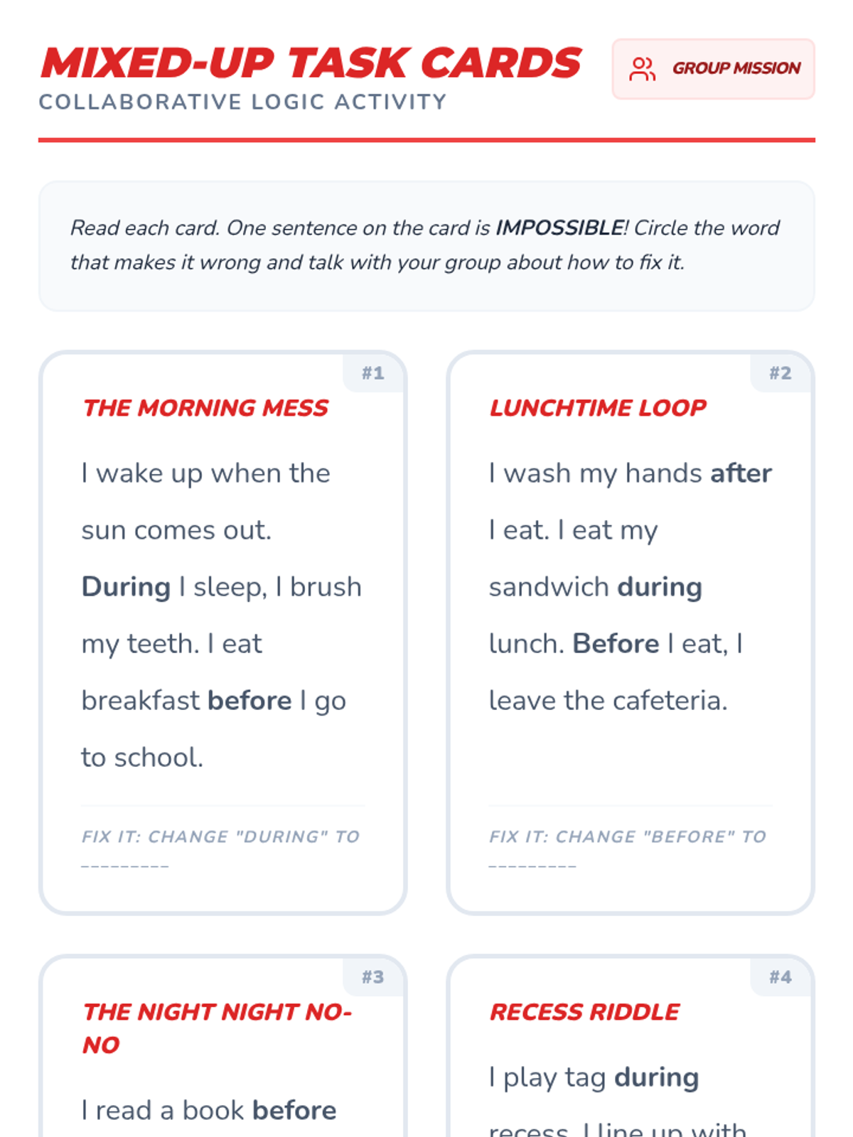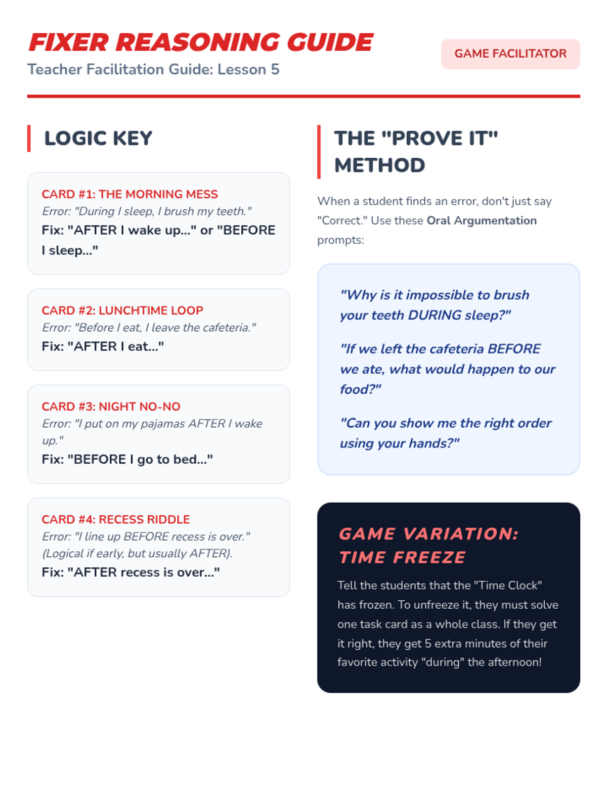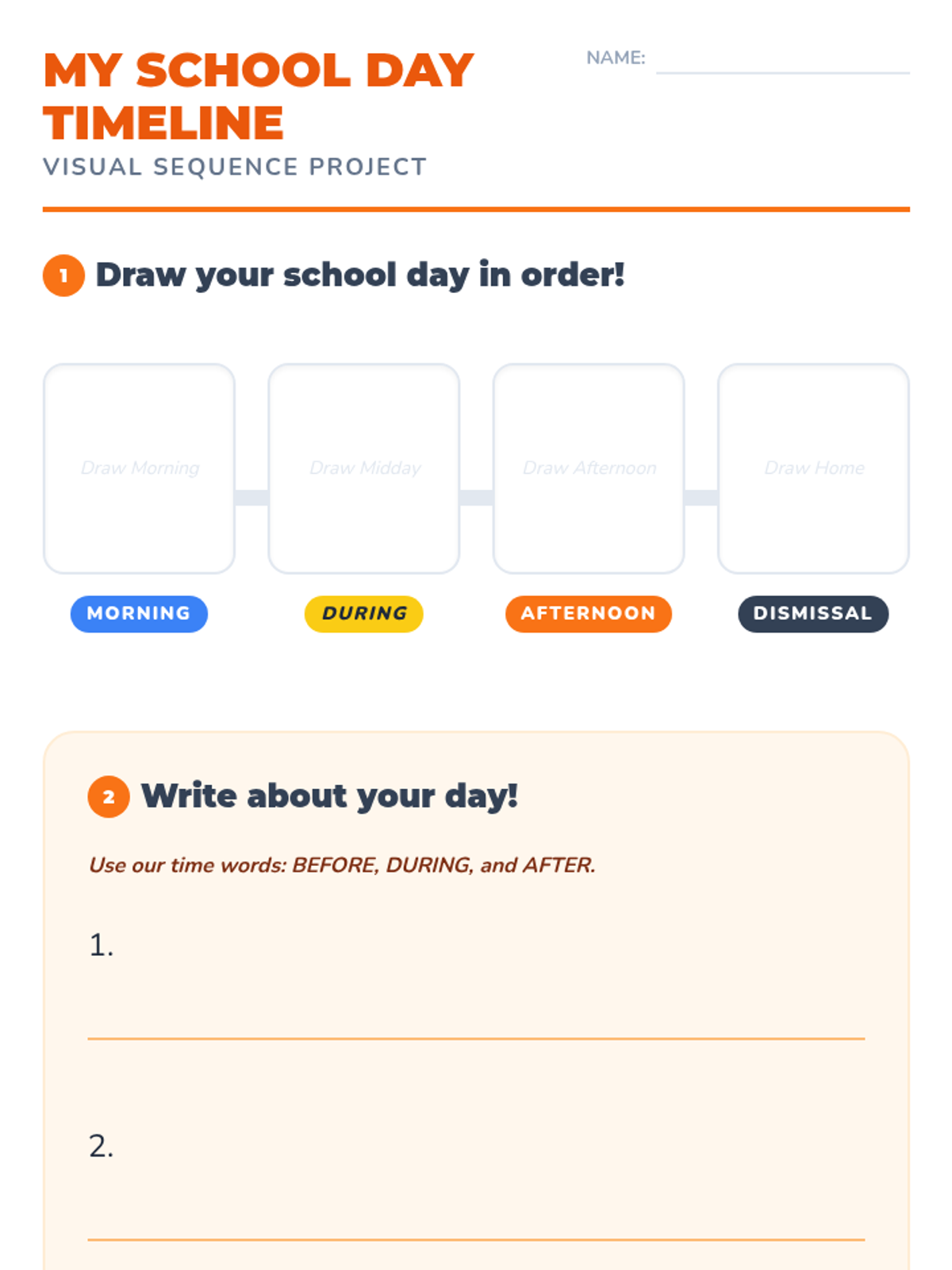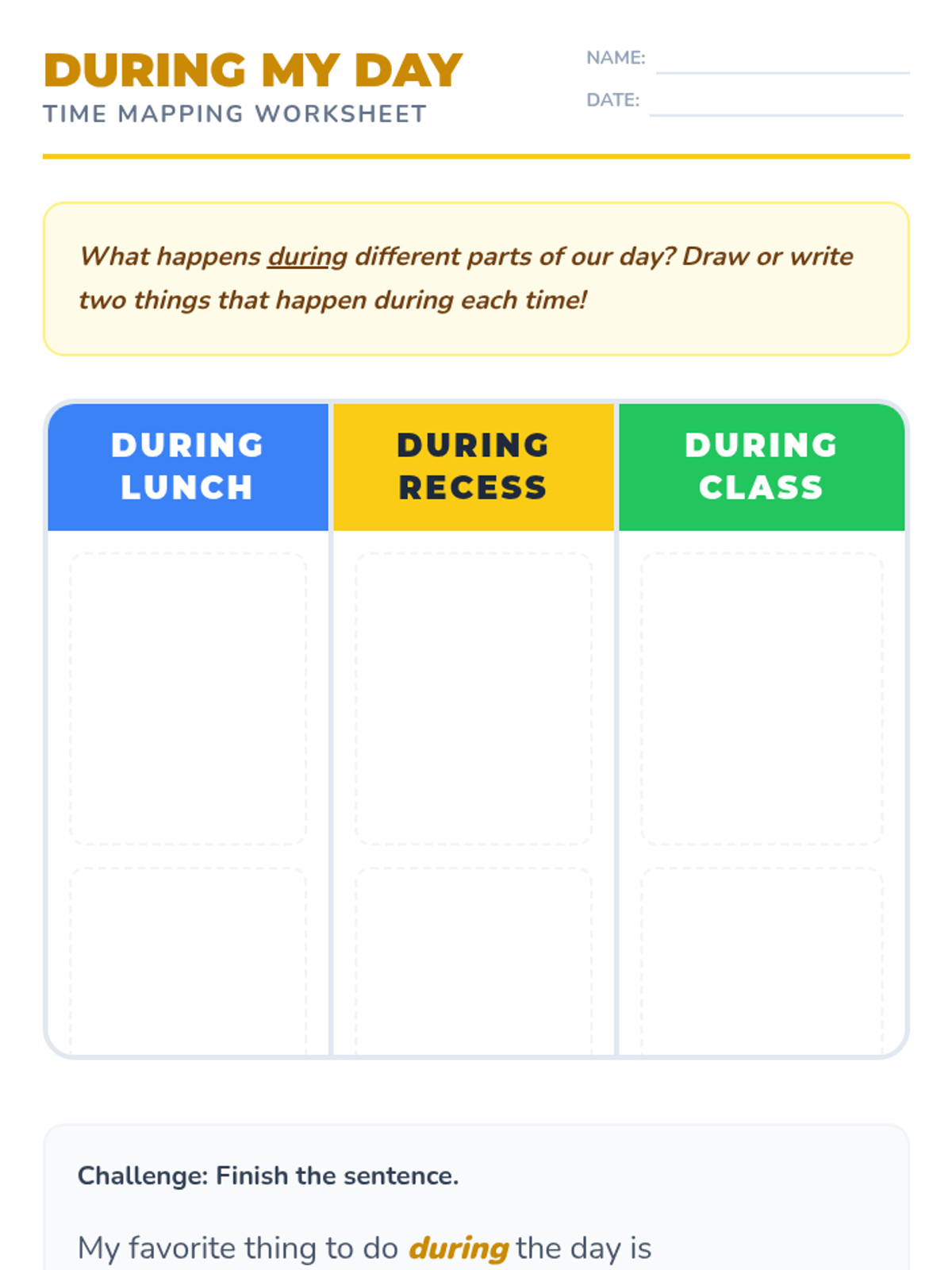 A 1st-grade sequence exploring temporal prepositions (before, after, during) through daily routines, story retelling, and timeline creation to master sequencing and time-based grammar.