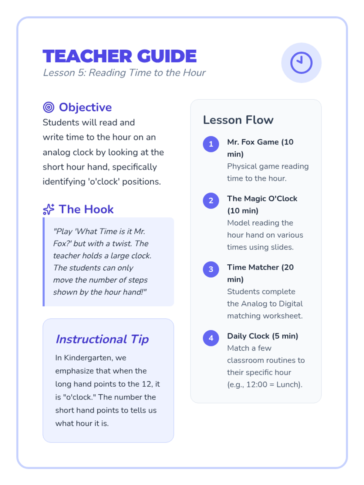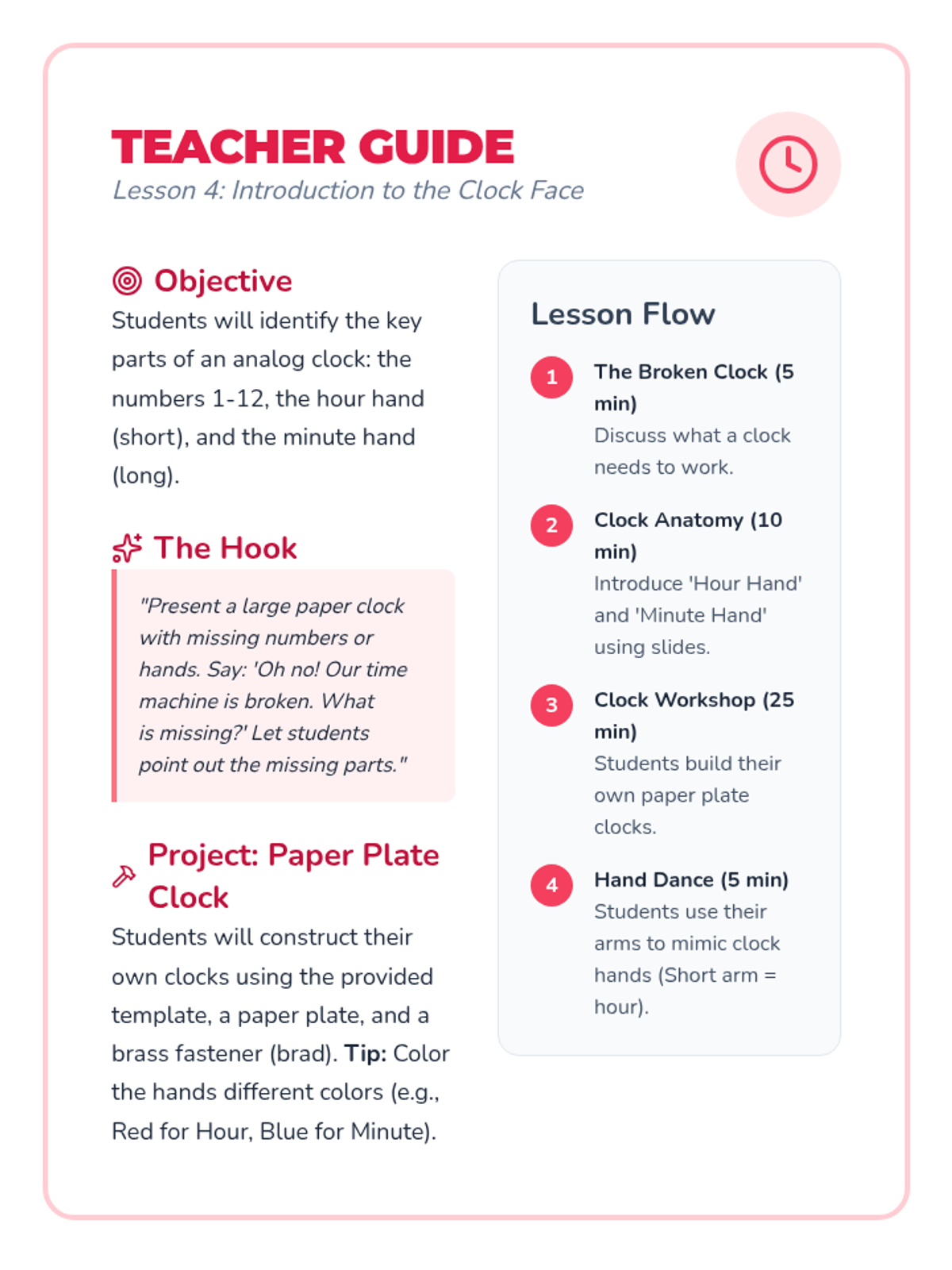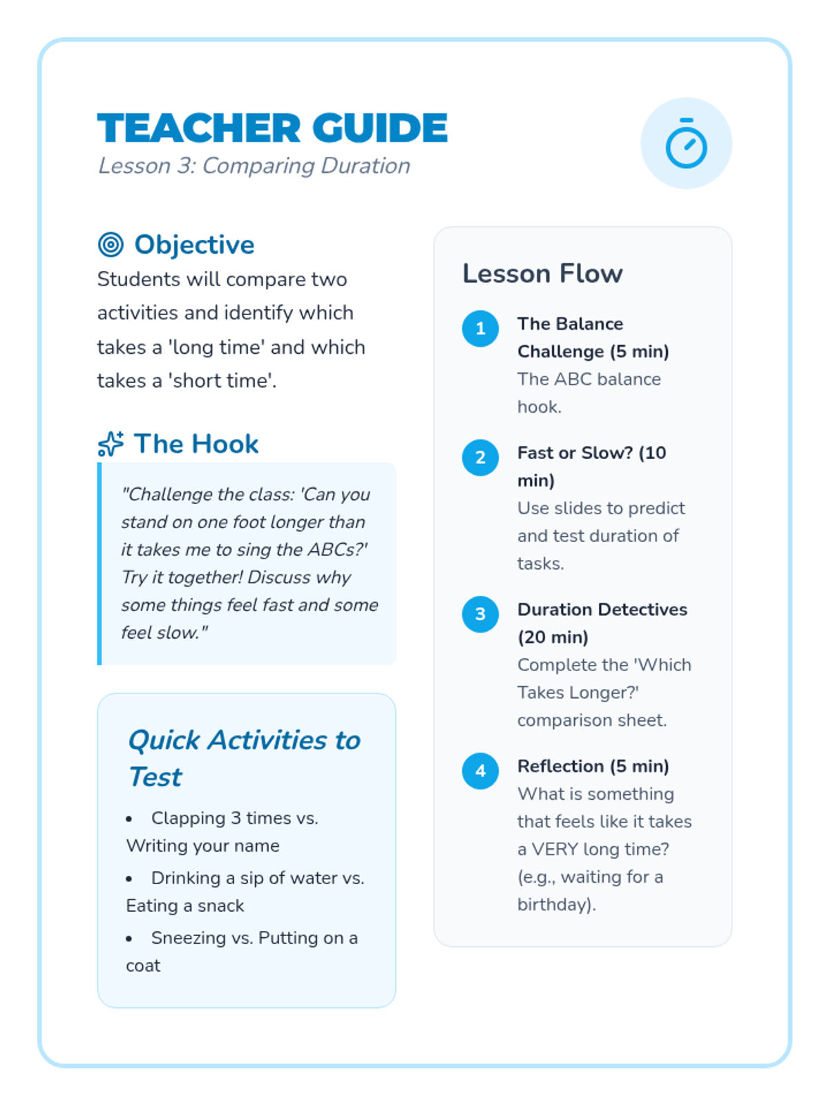 A comprehensive introduction to time for Kindergarten students, covering daily cycles, sequencing, duration, and basic clock reading using the 'Time Travelers' theme.