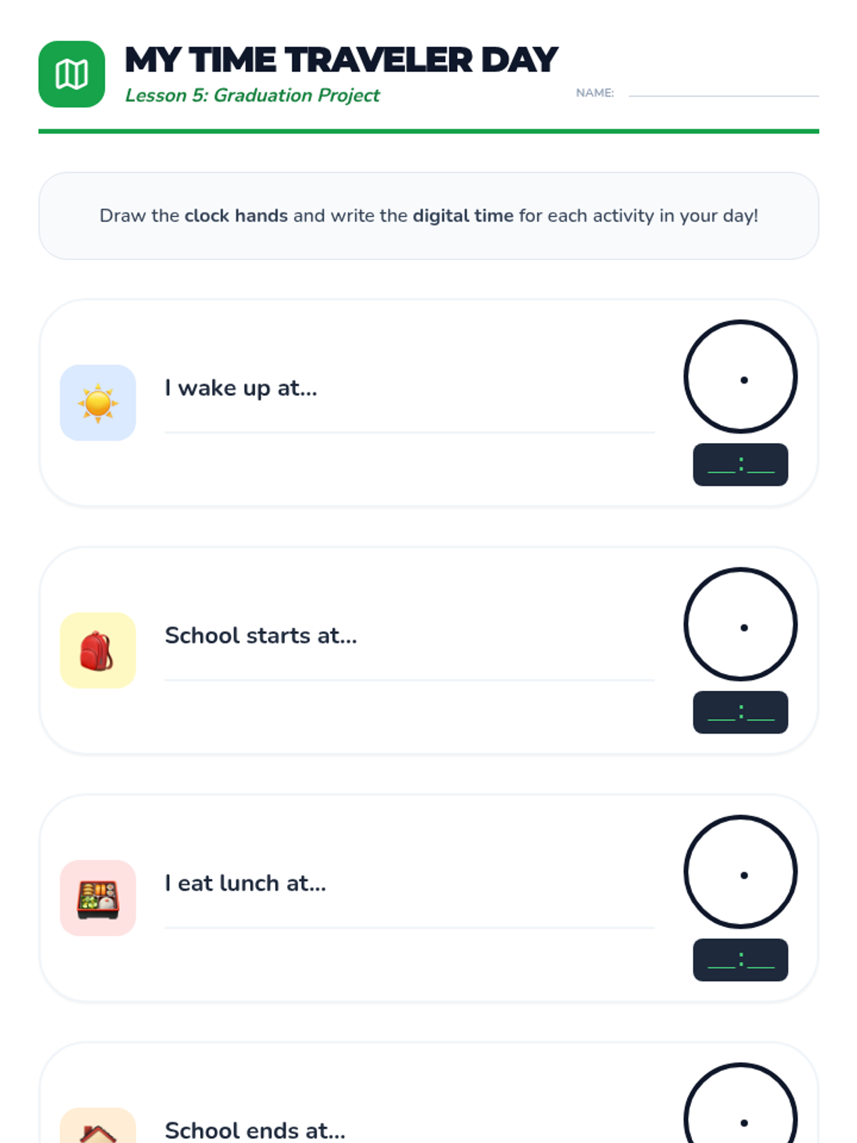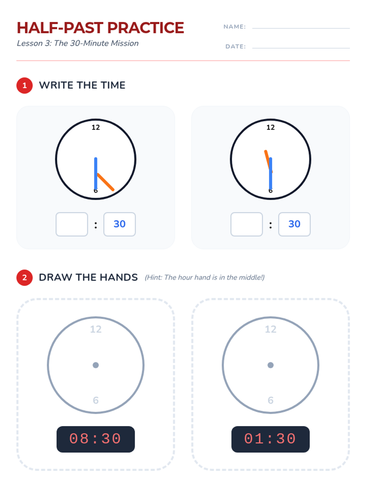 A comprehensive 1st Grade unit on telling time to the hour and half-hour using analog and digital clocks, connecting time-telling to daily routines.