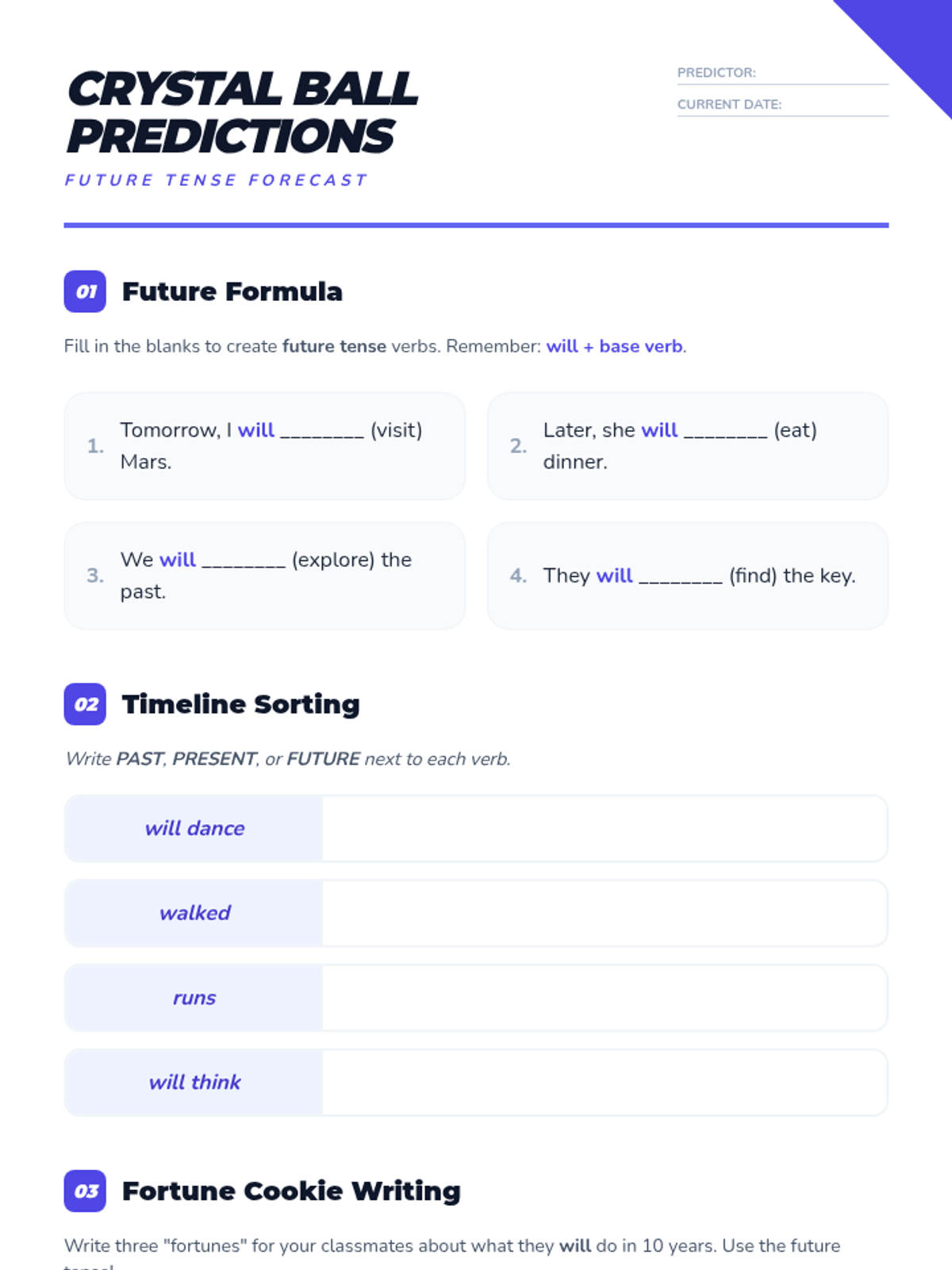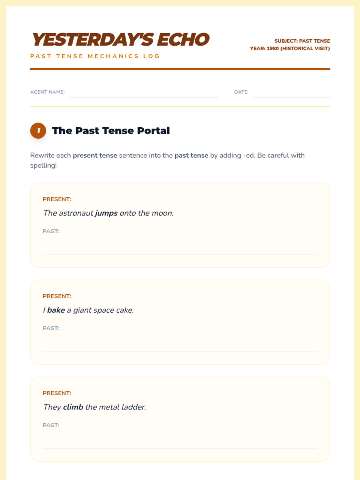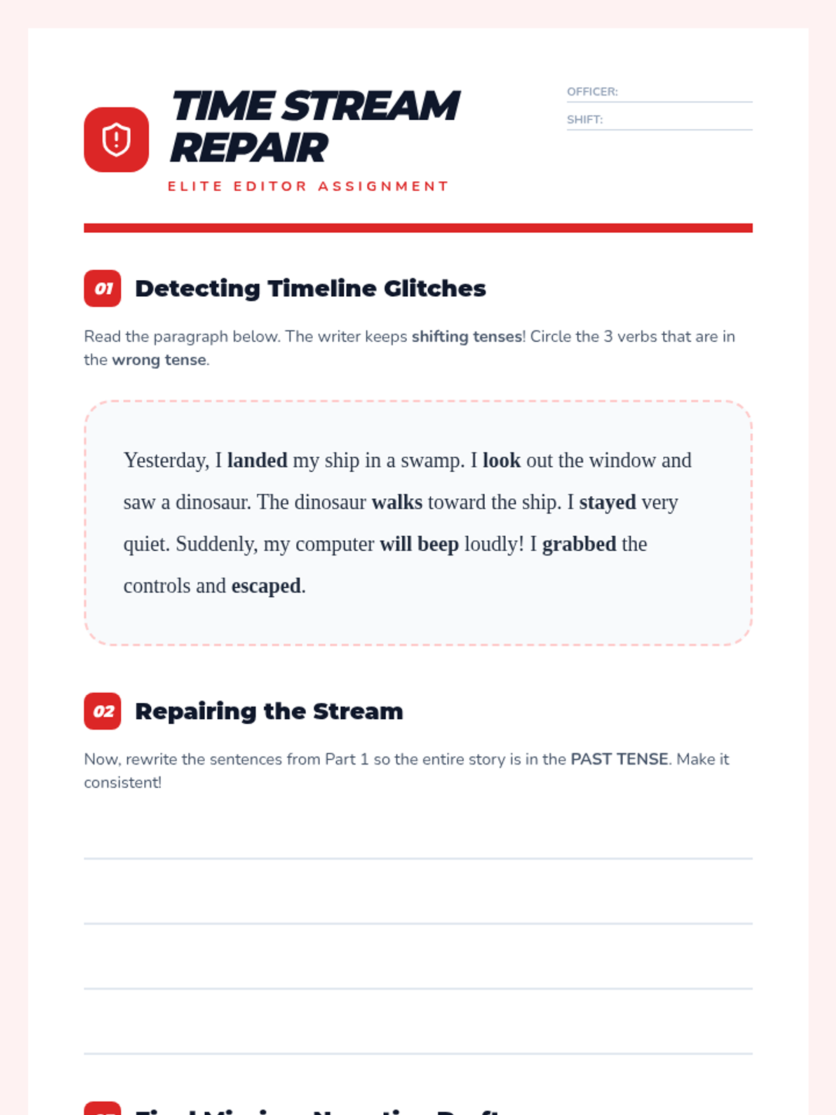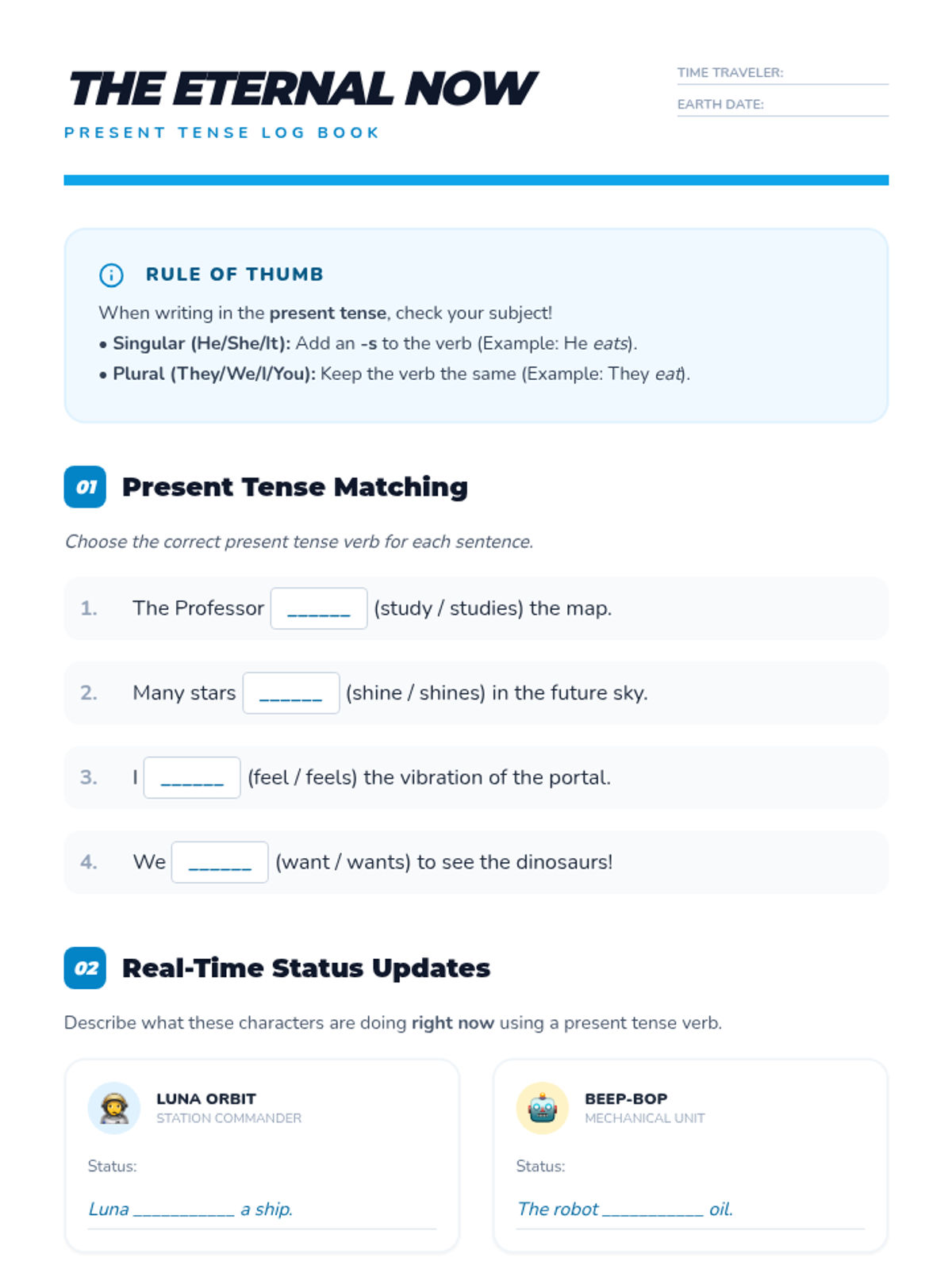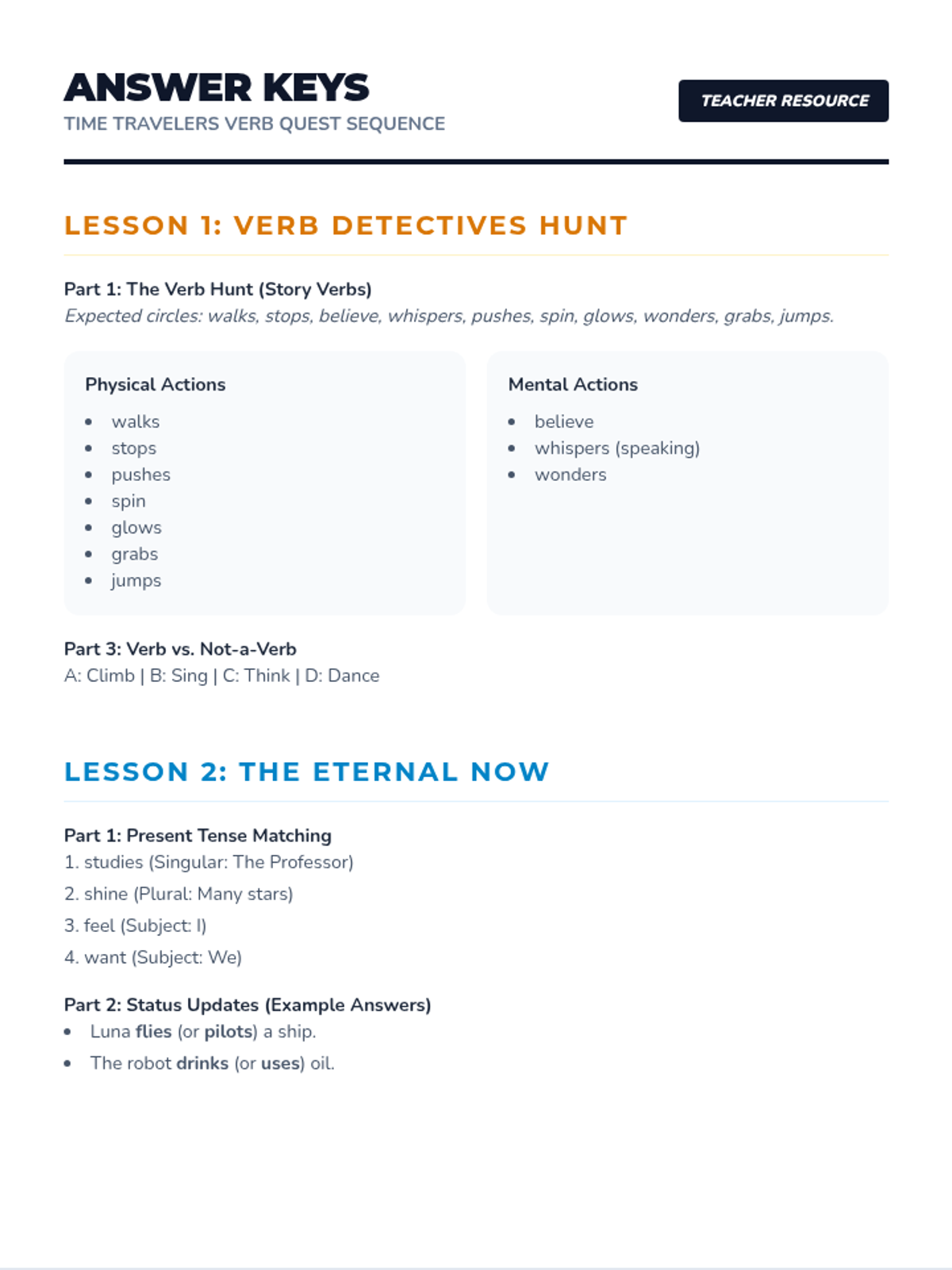 A comprehensive 3rd-grade grammar unit focusing on action verbs and the three simple tenses (past, present, and future) through the lens of a "Time Traveler" adventure. Students learn to identify actions, conjugate regular verbs, and maintain tense consistency in their writing.