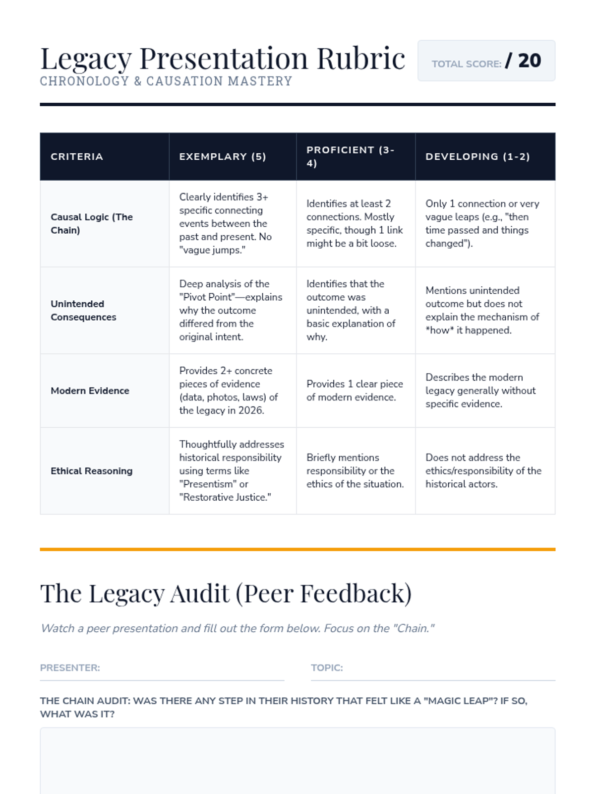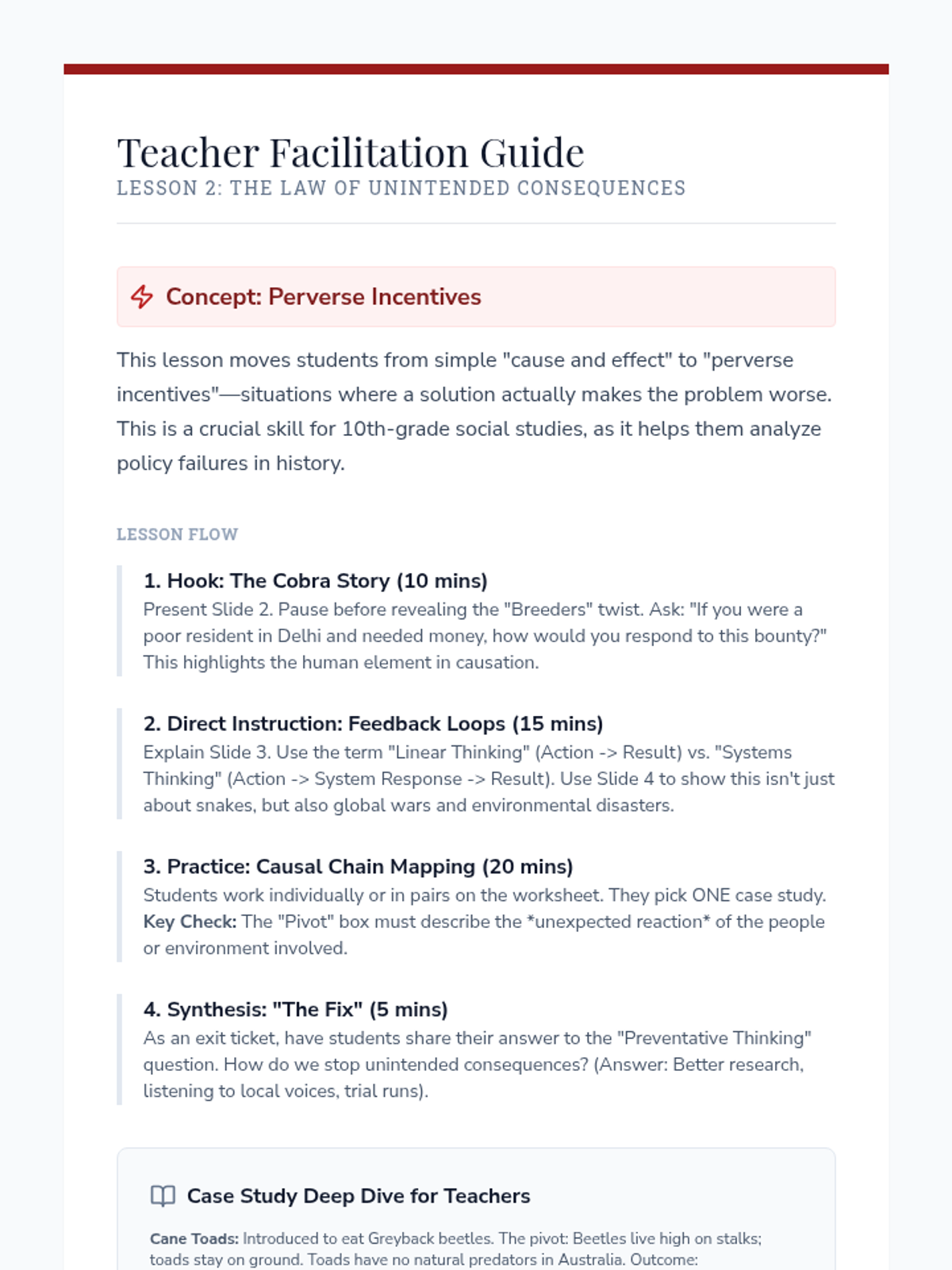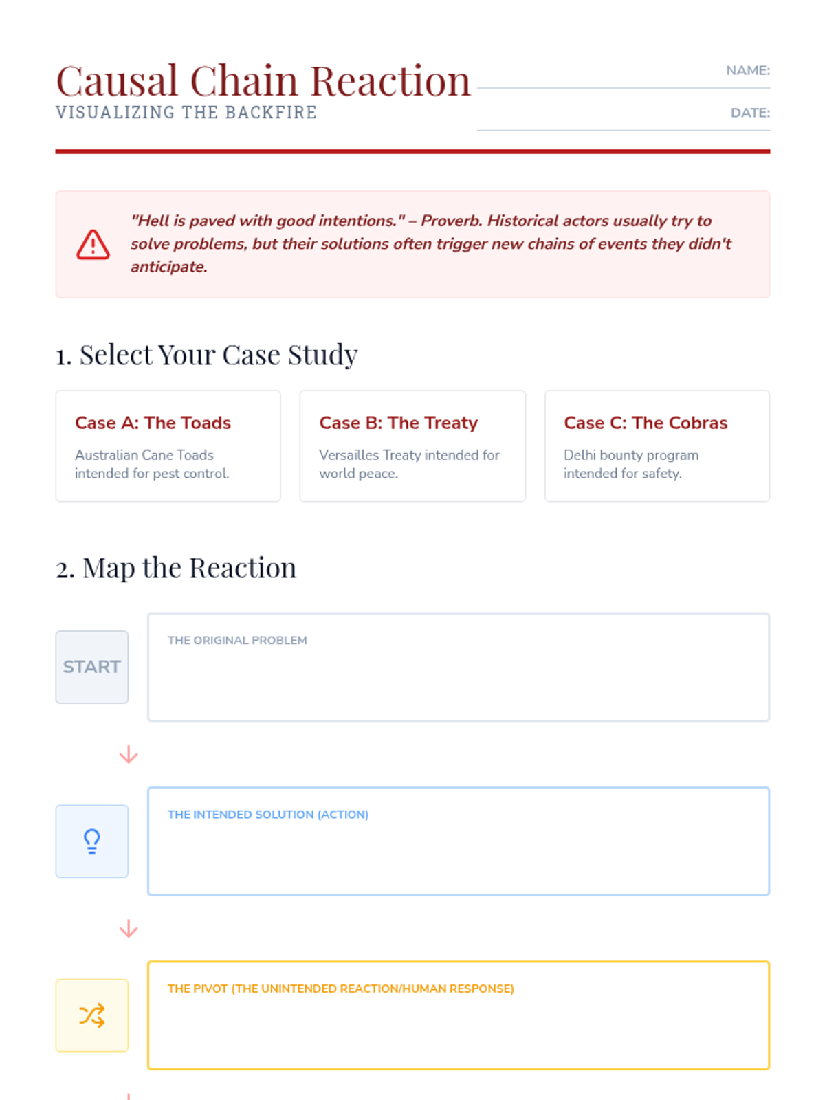 This sequence explores the relationship between historical events and their long-term legacies. Students investigate how immediate intentions often lead to complex, unintended consequences over decades and centuries, moving from simple causal chains to complex feedback loops and ethical evaluations of historical responsibility.