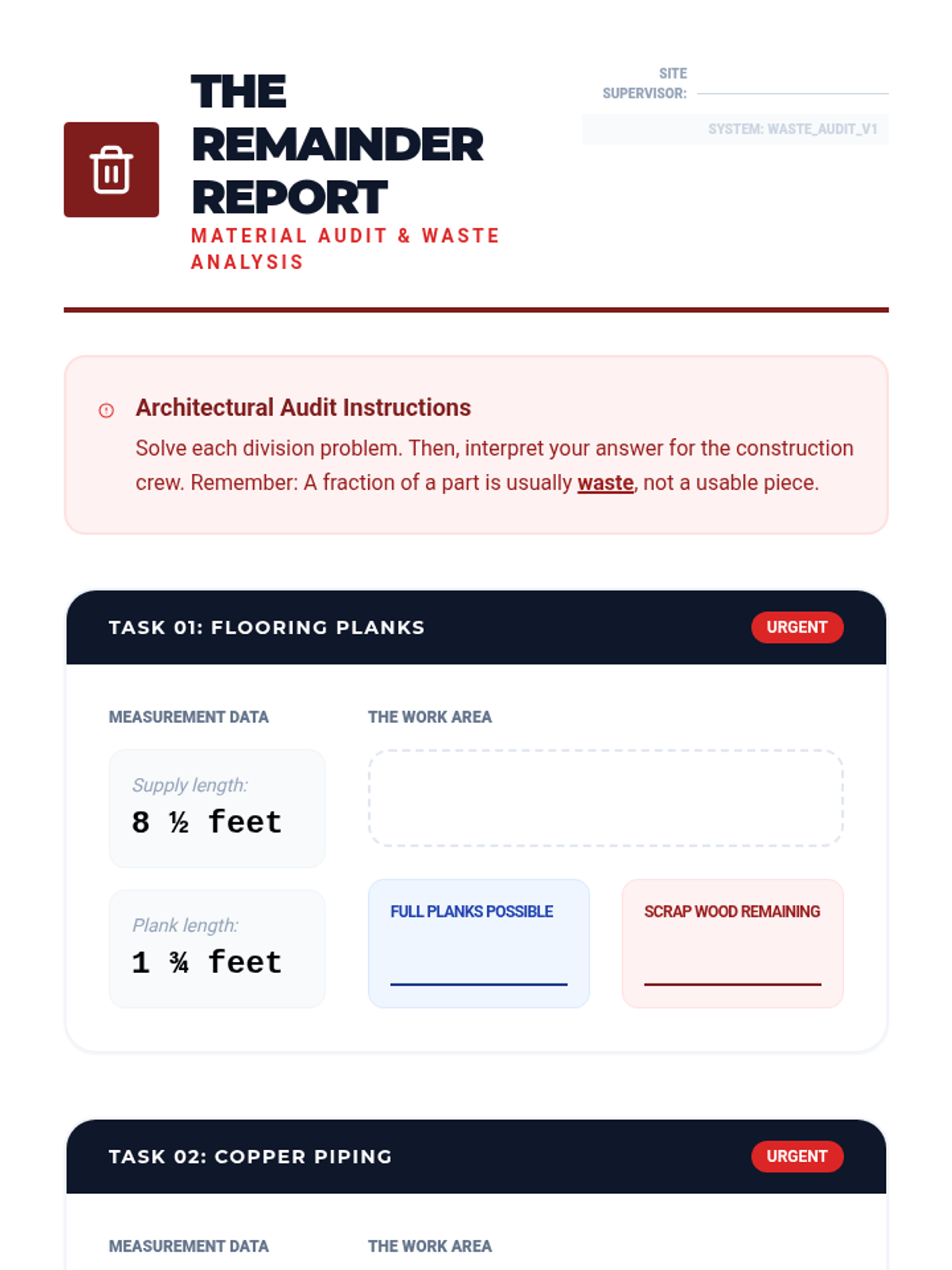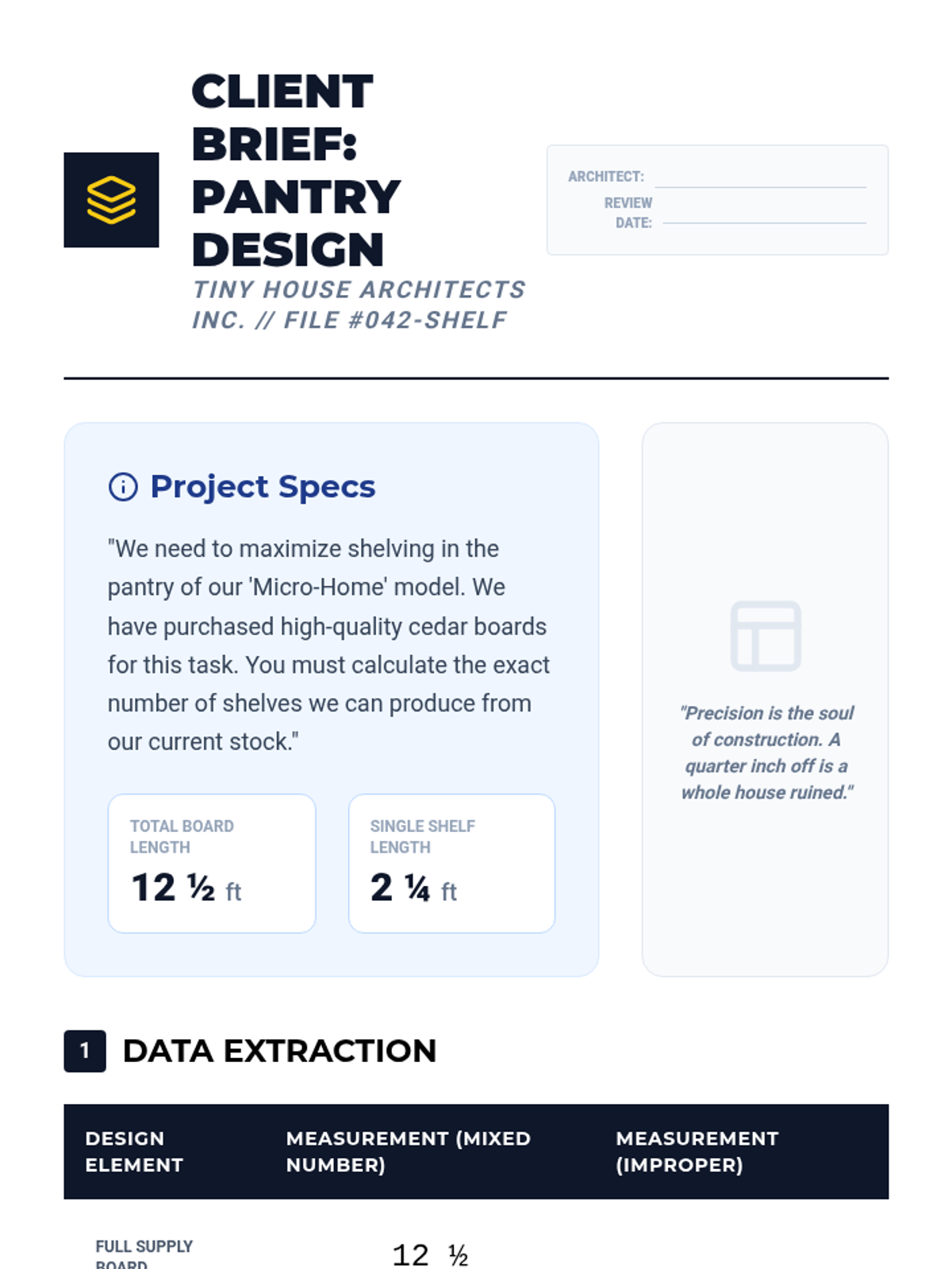 A project-based math sequence where students apply mixed number division to design a Tiny House, focusing on conversion, algorithms, and real-world interpretation of remainders.