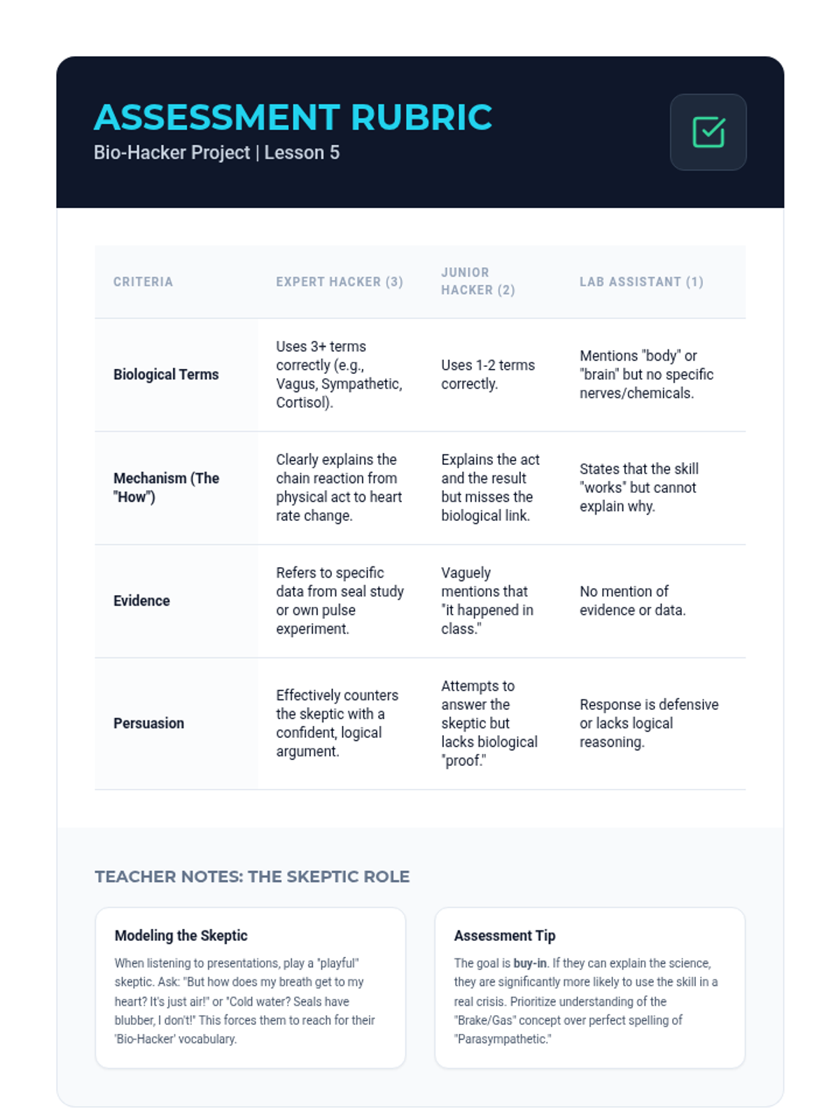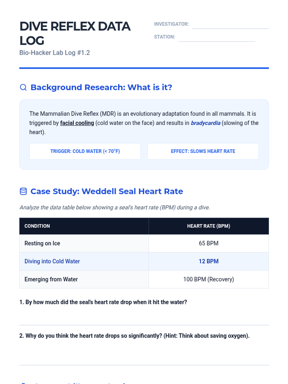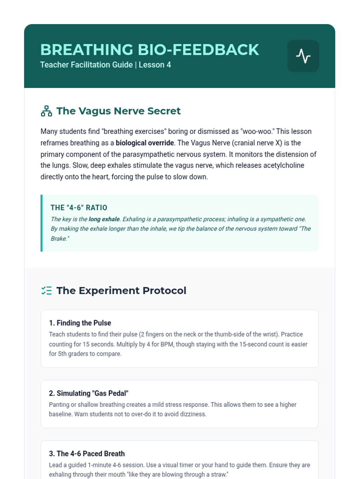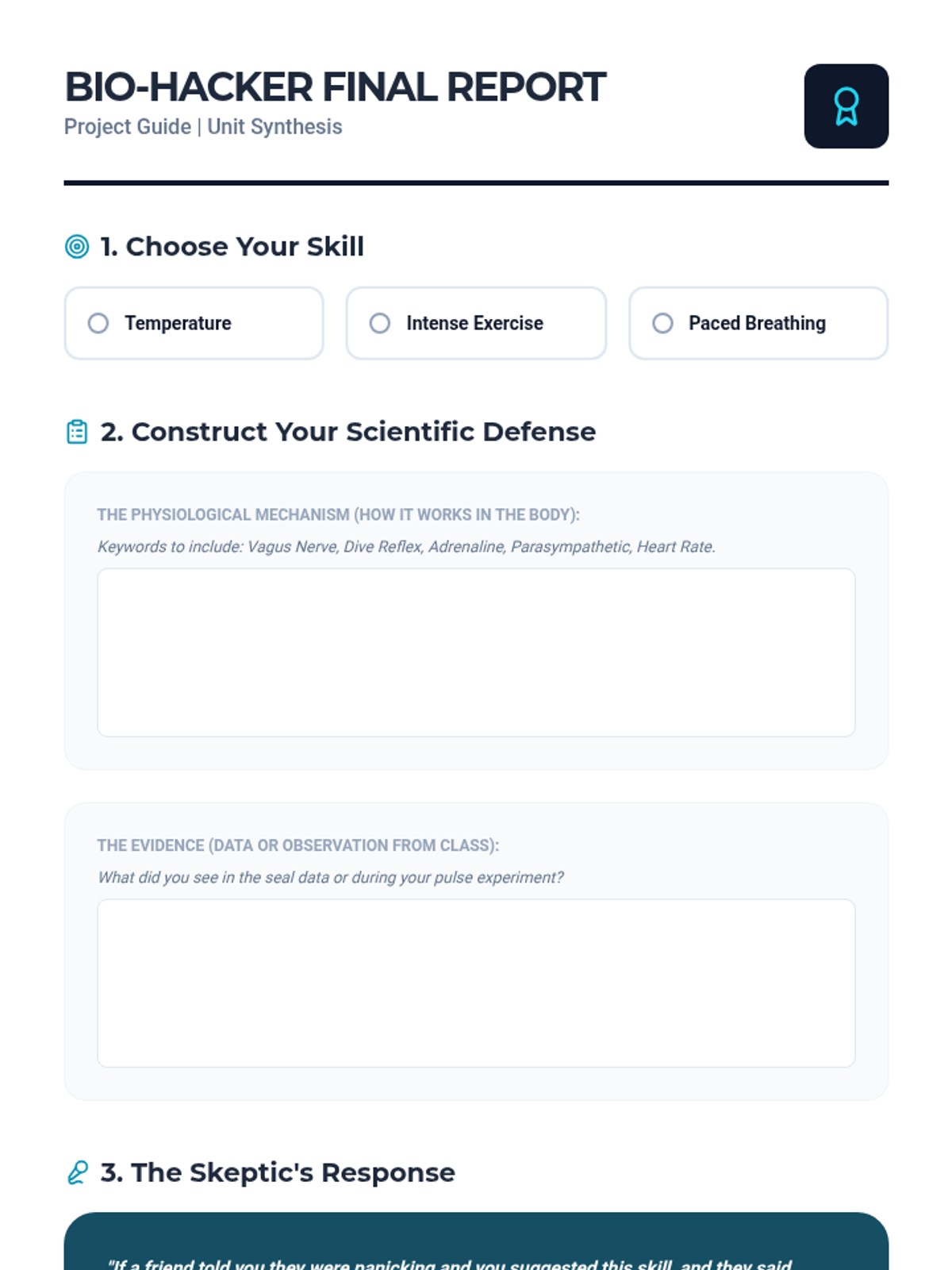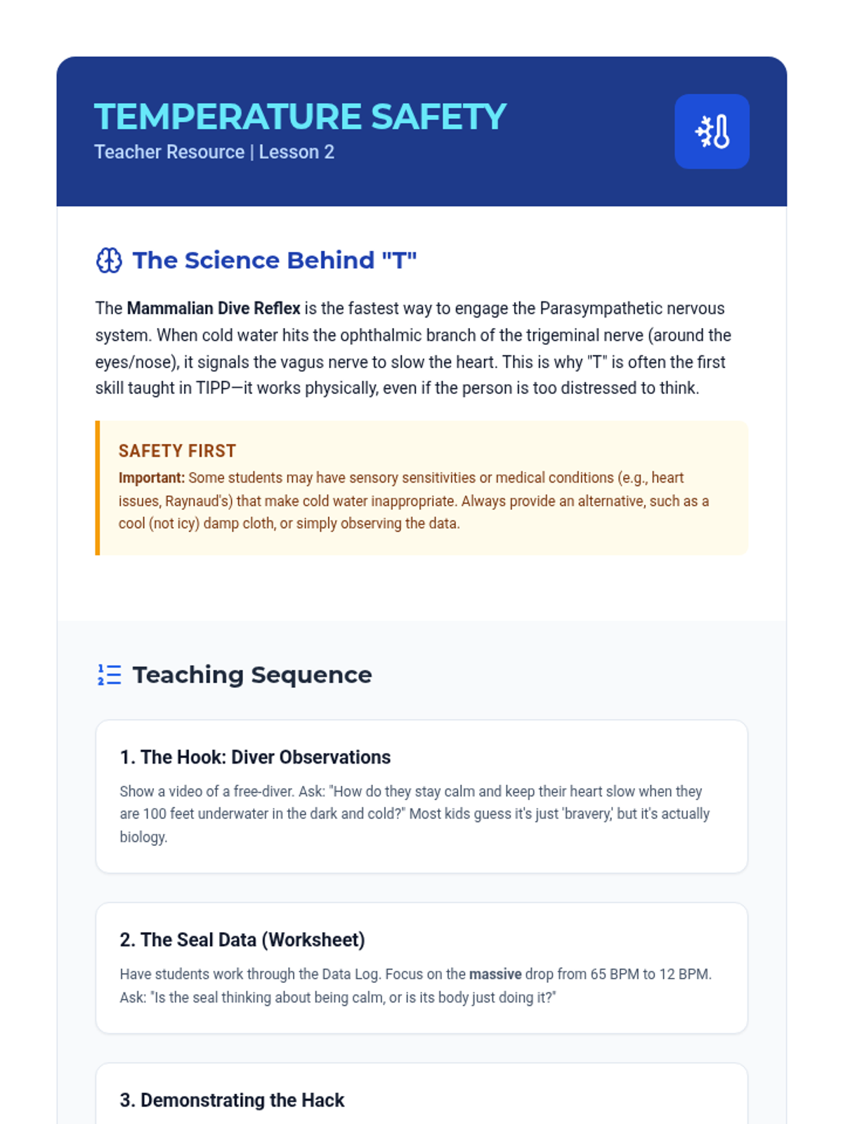 This inquiry-based sequence explores the biological 'why' behind TIPP skills, reframing them as 'bio-hacks' for the nervous system. Students investigate the autonomic nervous system, the Mammalian Dive Reflex, and the chemistry of stress to understand how physical interventions can regulate emotional states.