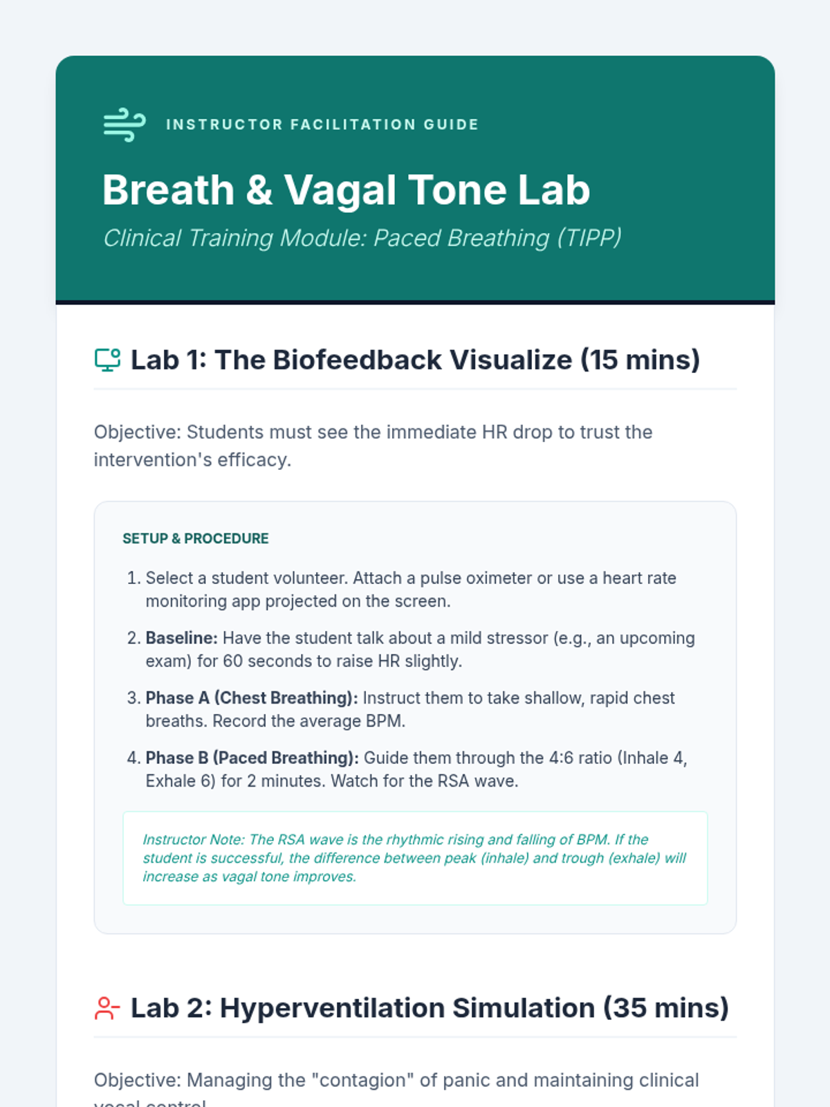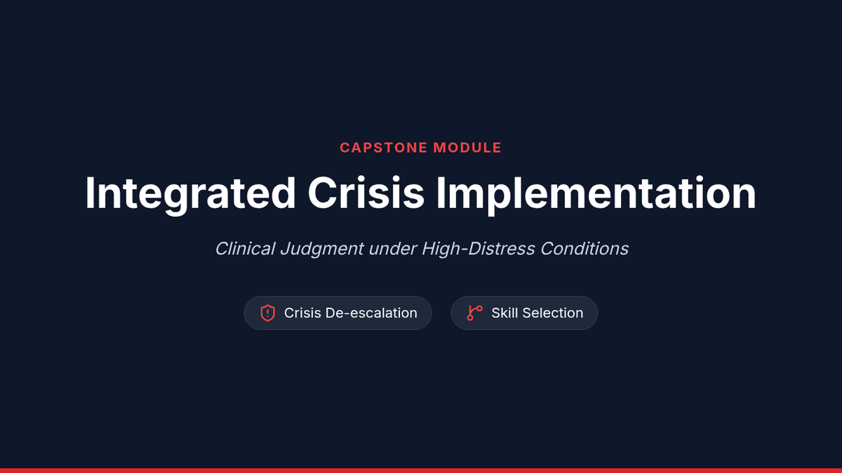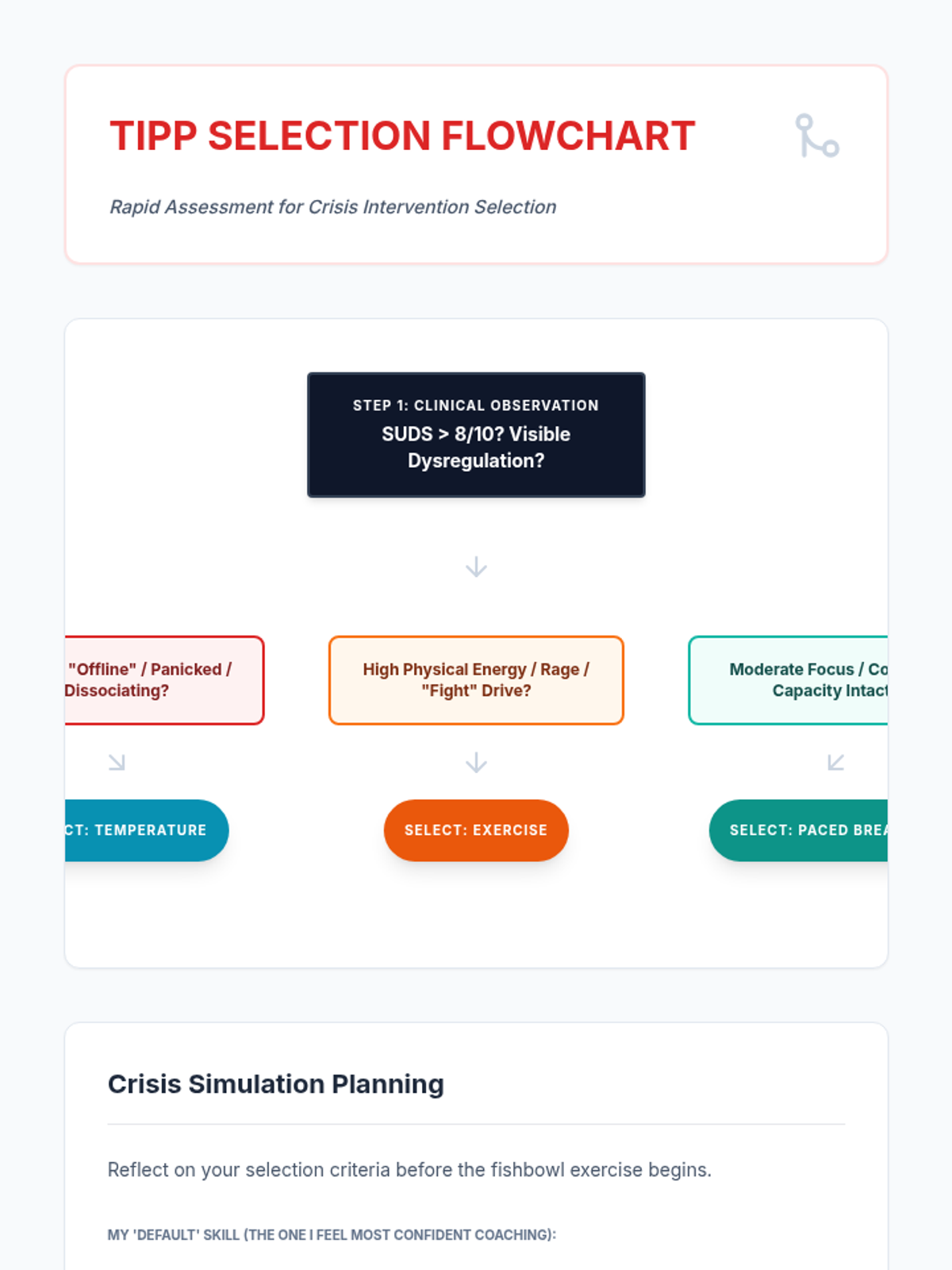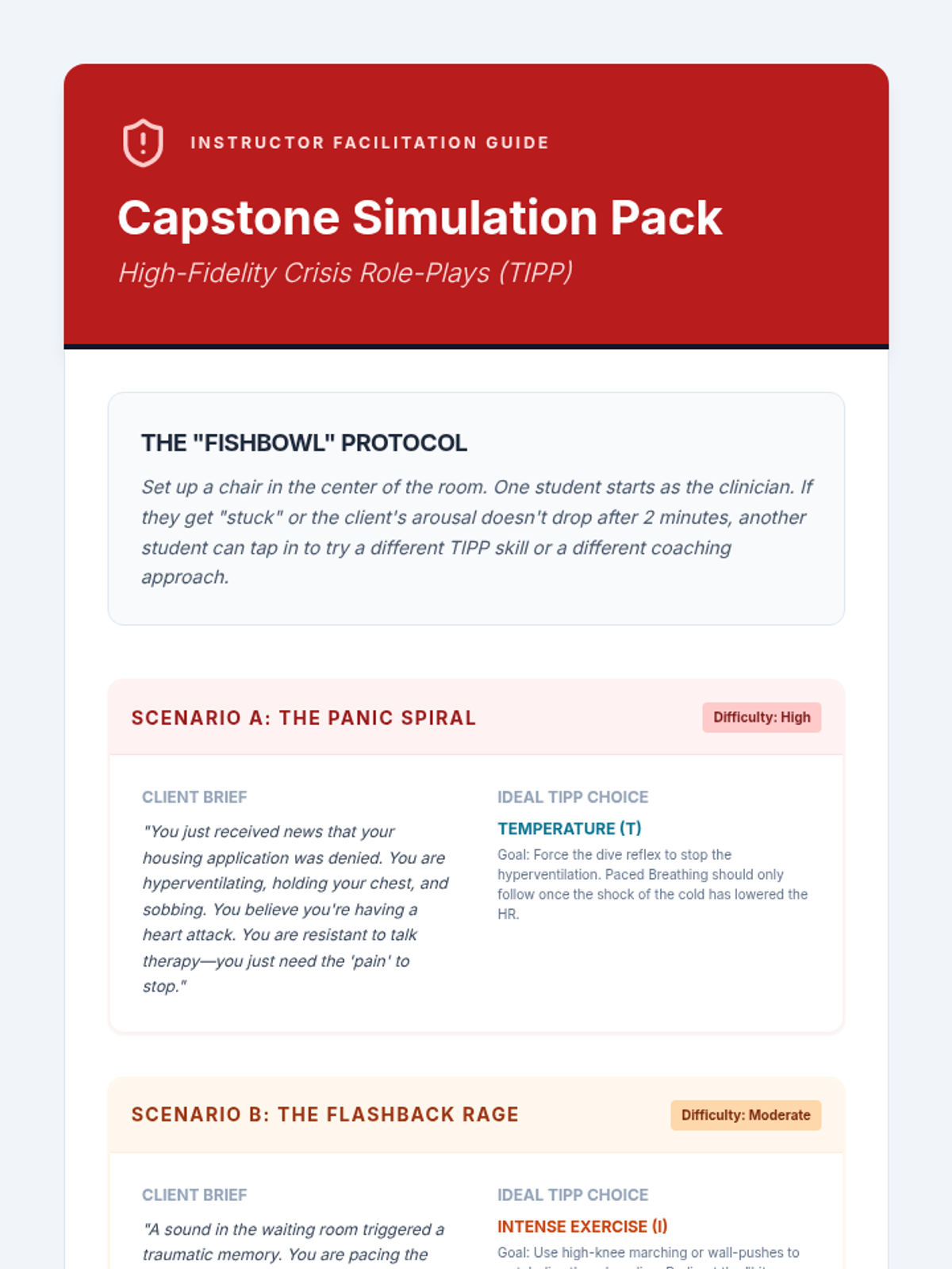 An advanced clinical sequence for graduate-level counseling students, focusing on the neurobiological mechanisms and practical application of TIPP skills (Temperature, Intense exercise, Paced breathing, Paired muscle relaxation) for crisis intervention.