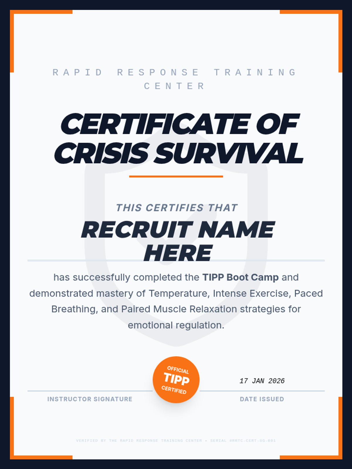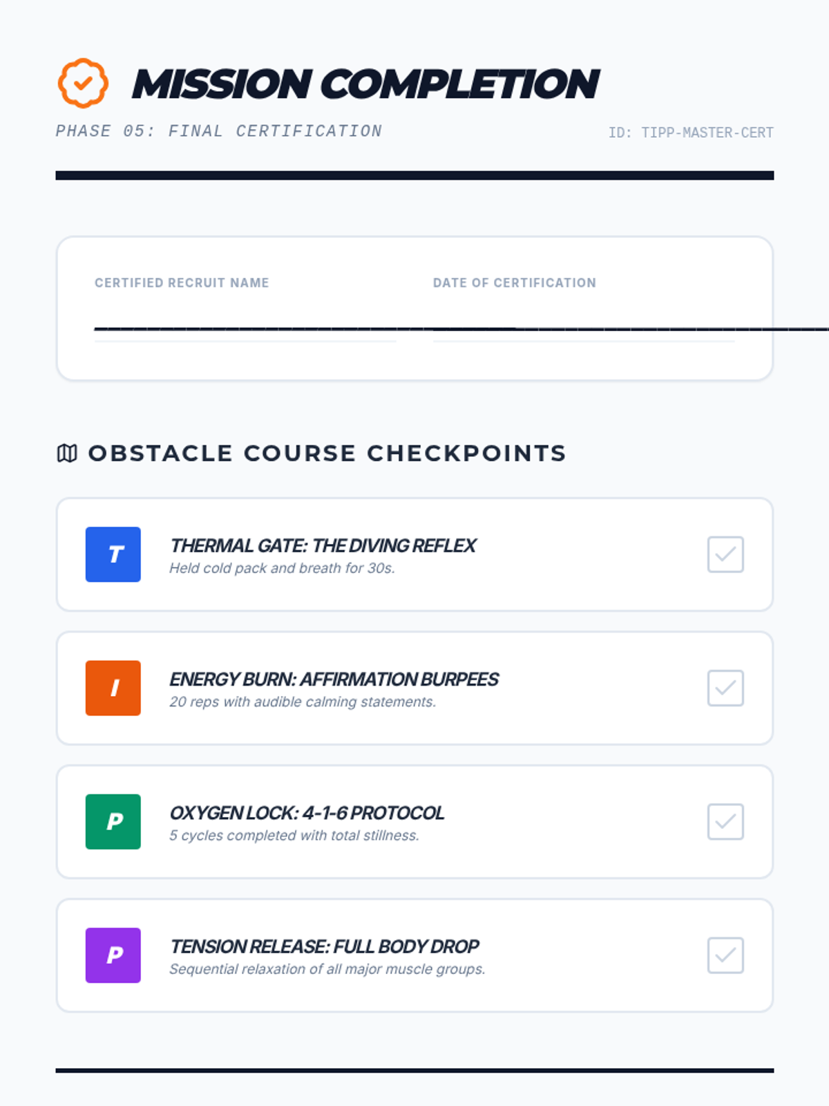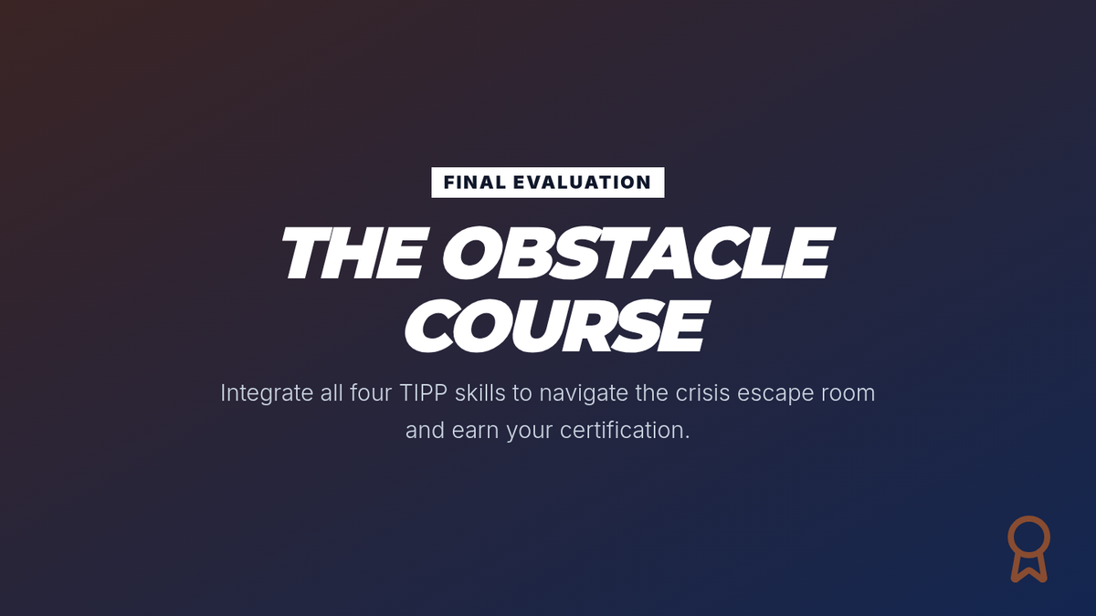 A gamified, mastery-based sequence designed to build automaticity with TIPP crisis survival skills. Students move through a 'Boot Camp' style curriculum, mastering Temperature, Intense Exercise, Paced Breathing, and Paired Muscle Relaxation through rapid-fire drills and simulations.