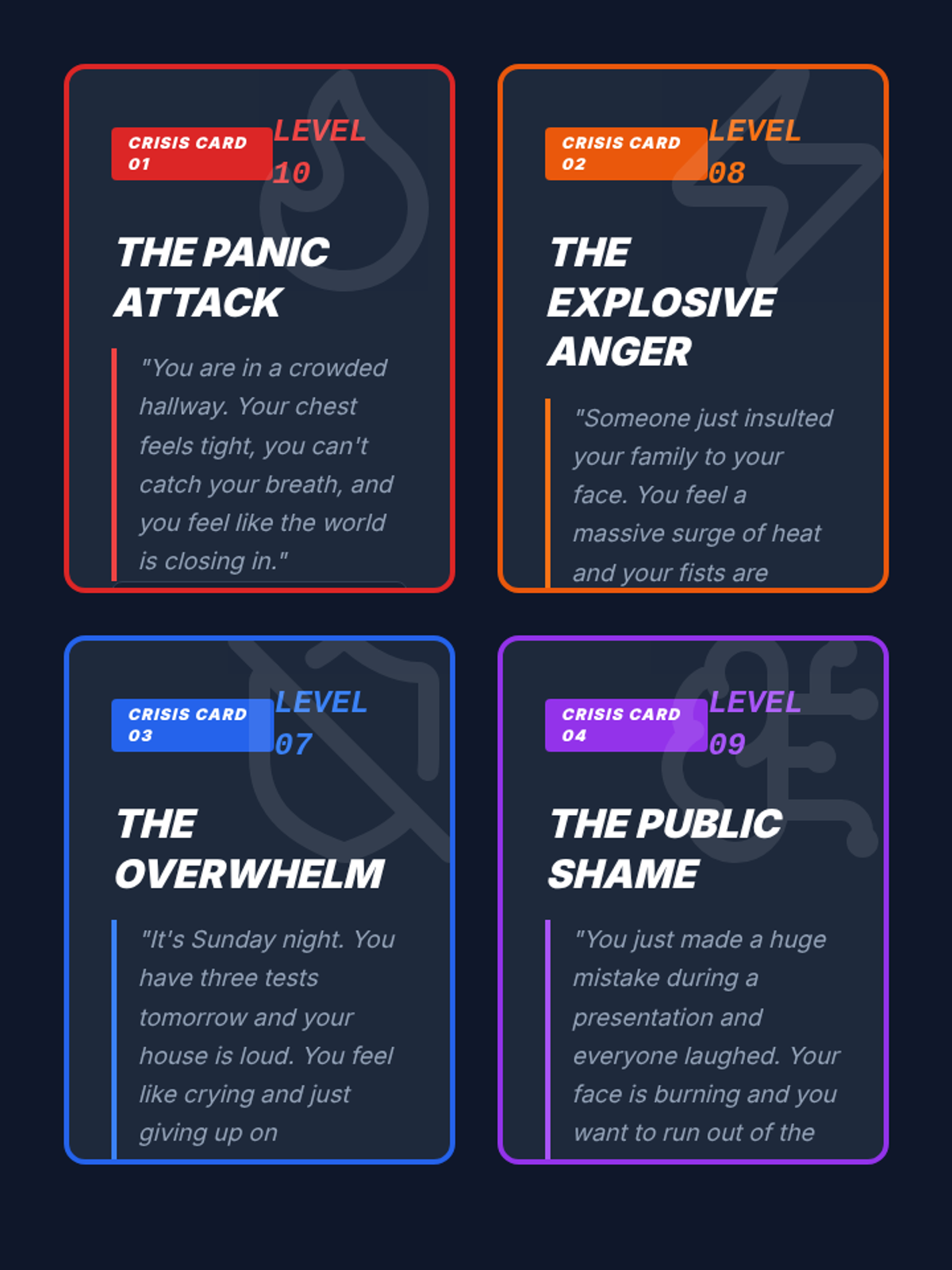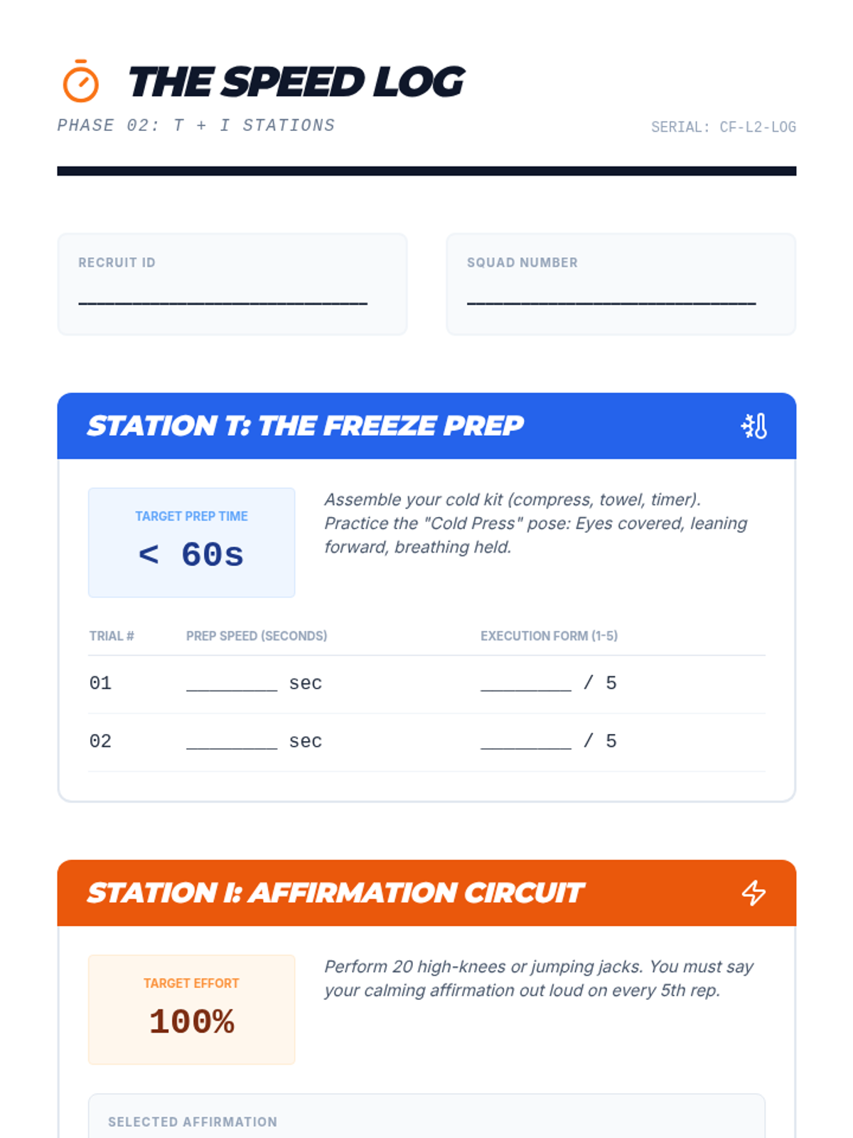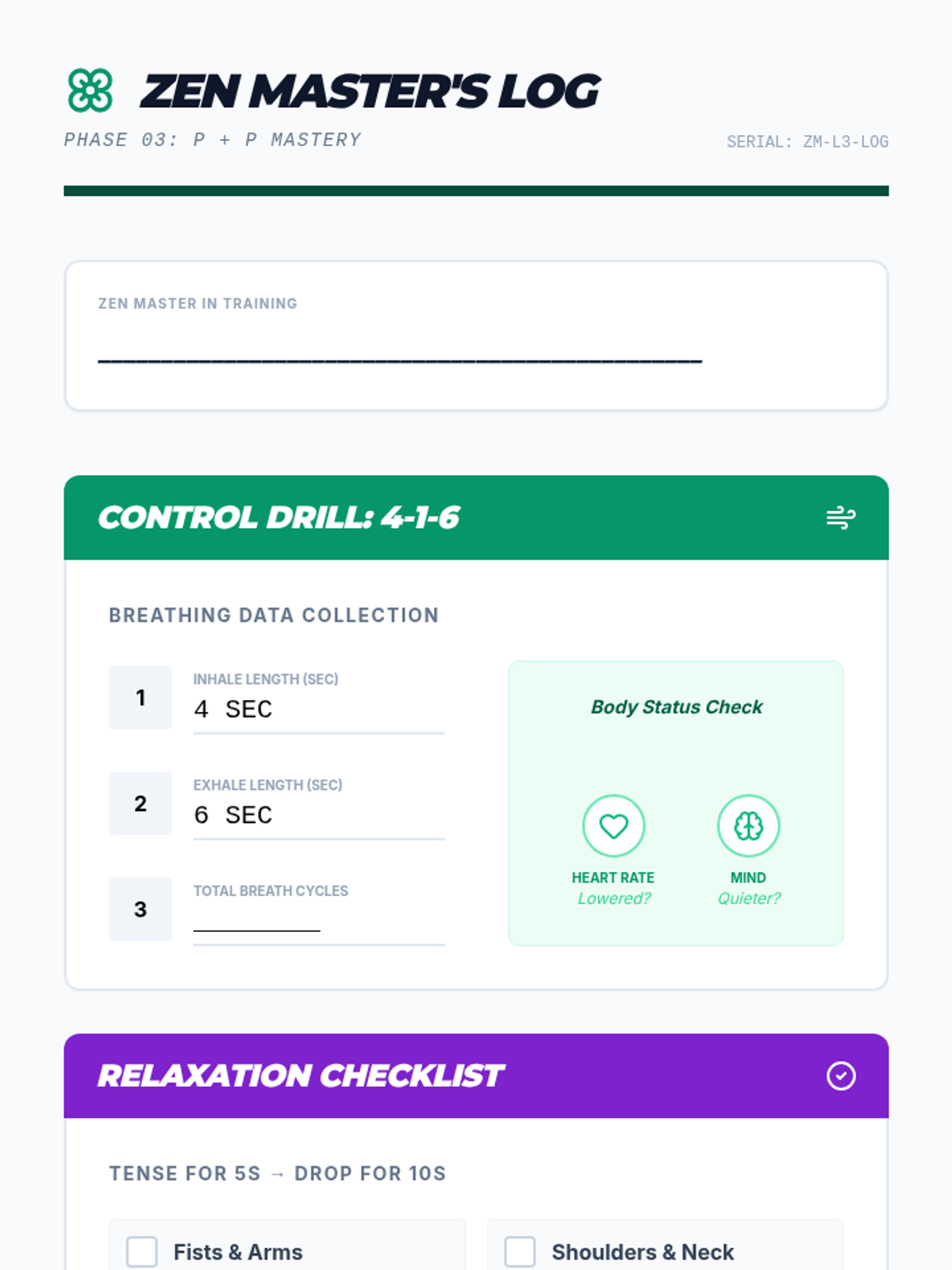 A gamified, mastery-based sequence designed to build automaticity with TIPP crisis survival skills. Students move through a 'Boot Camp' style curriculum, mastering Temperature, Intense Exercise, Paced Breathing, and Paired Muscle Relaxation through rapid-fire drills and simulations.