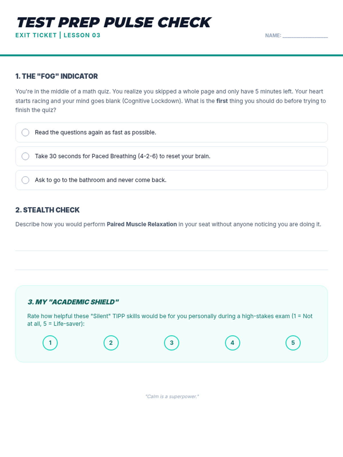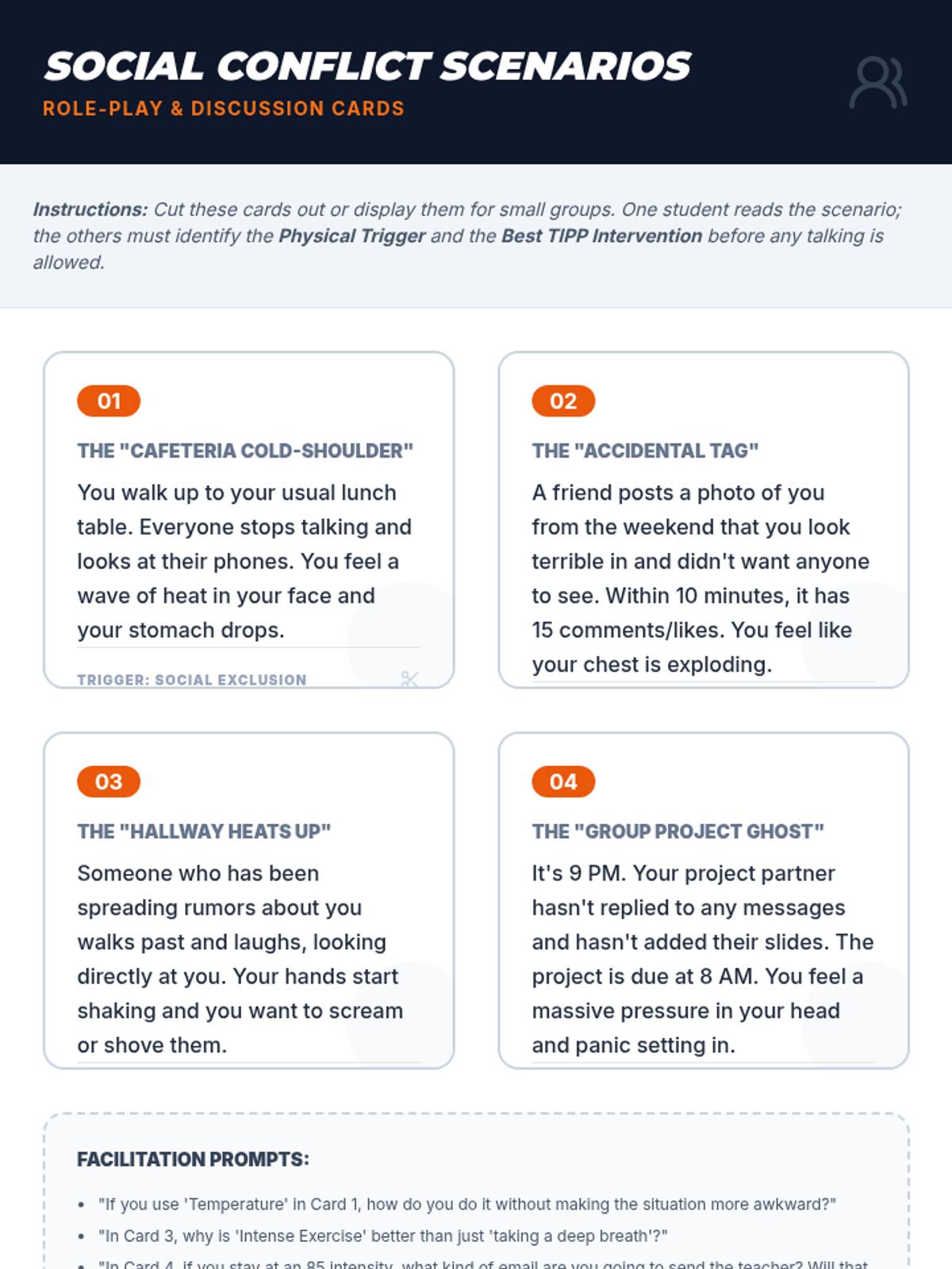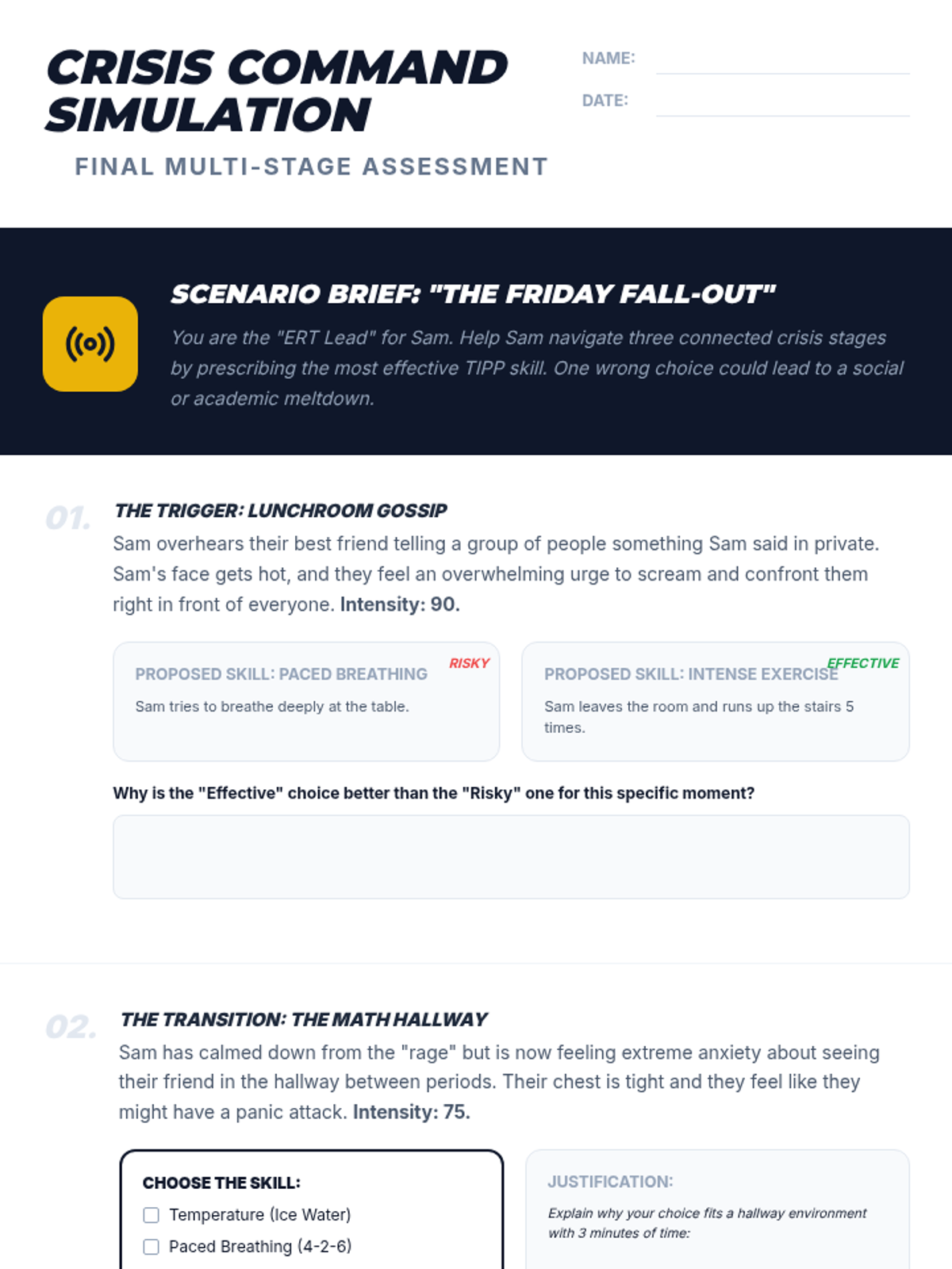 A 5-lesson sequence for 9th-grade students on Crisis Survival Skills (TIPP). Students learn to distinguish between general discomfort and true crisis situations, applying specific TIPP skills (Temperature, Intense Exercise, Paced Breathing, and Paired Muscle Relaxation) to real-world social, academic, and personal challenges through case studies and simulations.