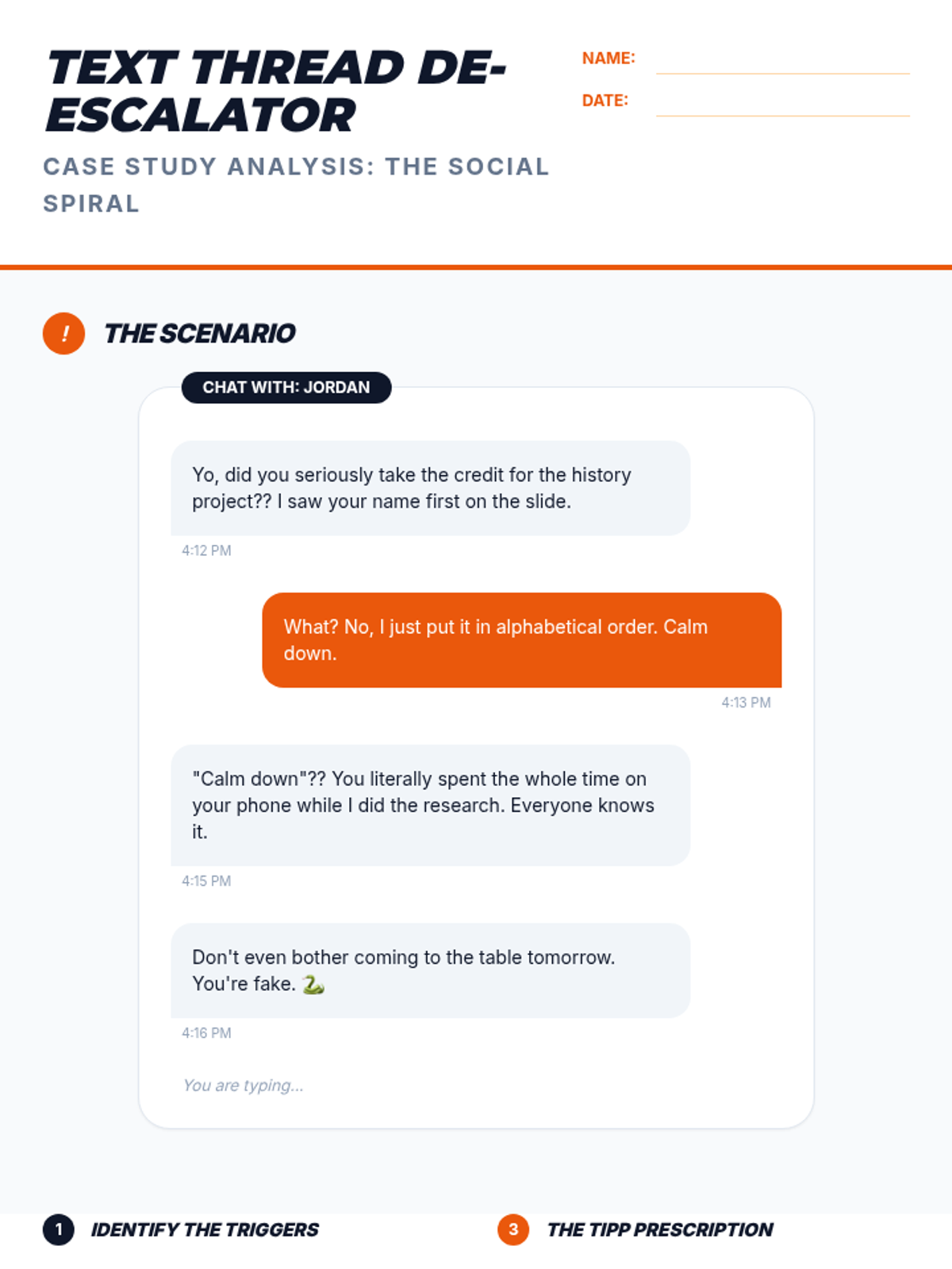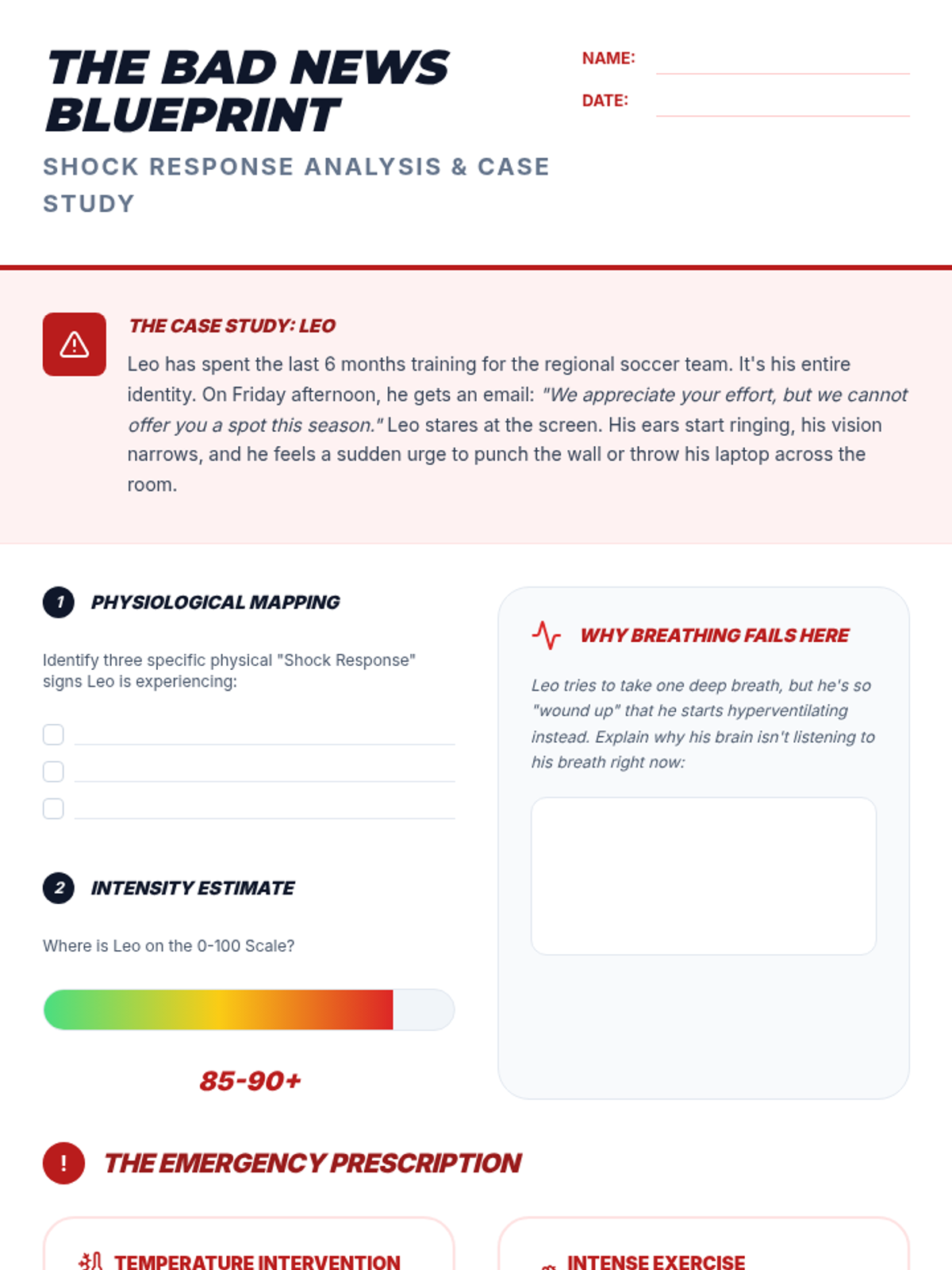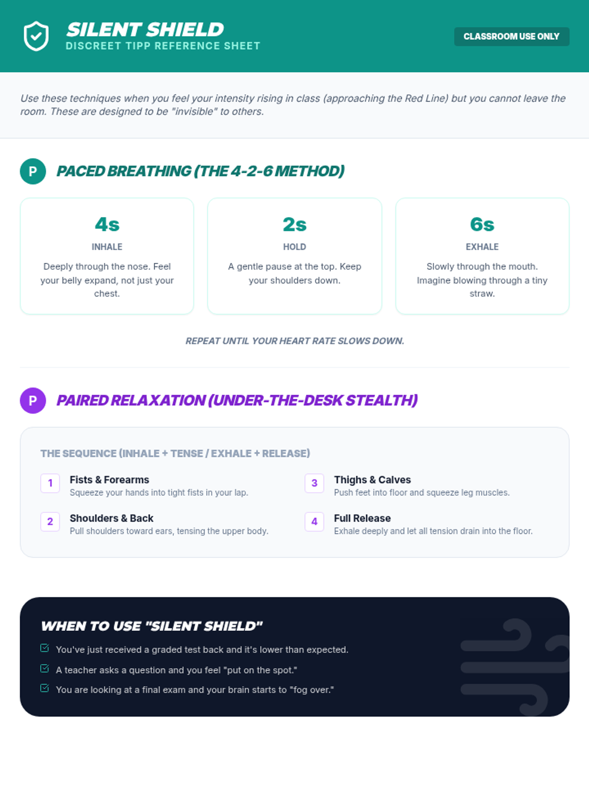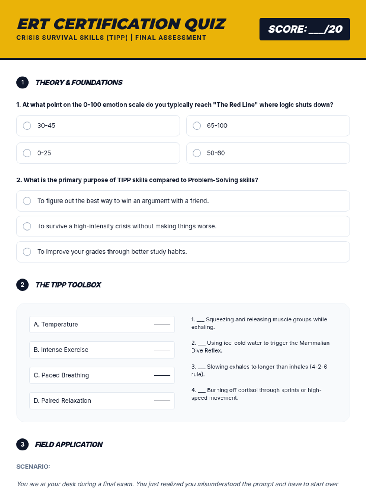 A 5-lesson sequence for 9th-grade students on Crisis Survival Skills (TIPP). Students learn to distinguish between general discomfort and true crisis situations, applying specific TIPP skills (Temperature, Intense Exercise, Paced Breathing, and Paired Muscle Relaxation) to real-world social, academic, and personal challenges through case studies and simulations.