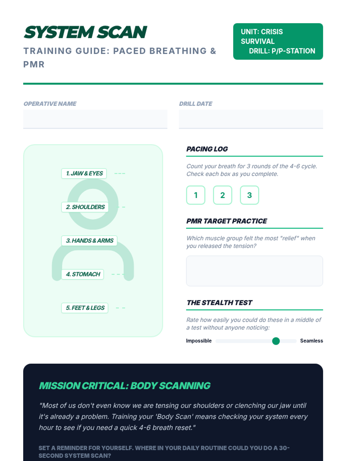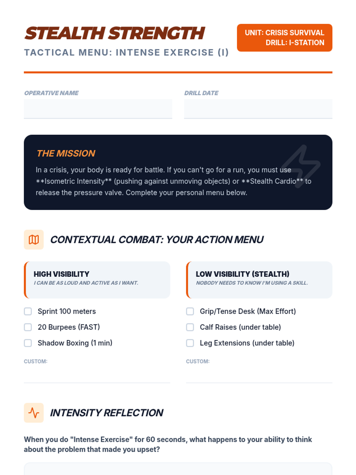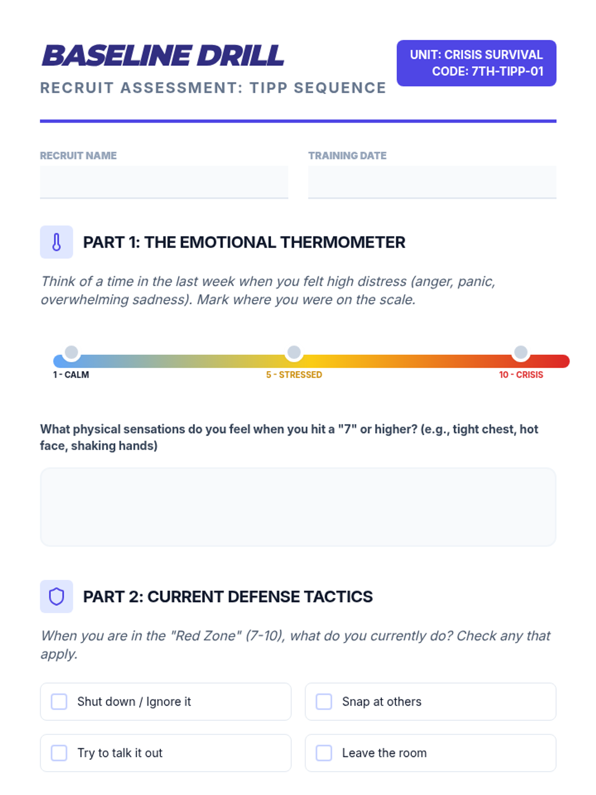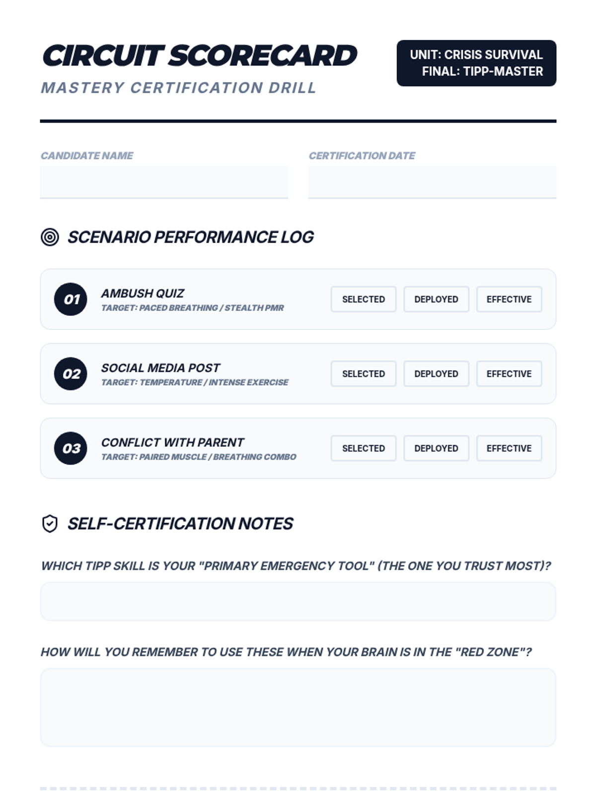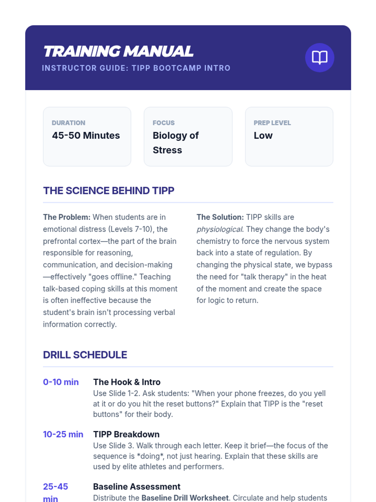 A comprehensive 5-lesson sequence for 7th graders to master TIPP (Temperature, Intense Exercise, Paced Breathing, Paired Muscle Relaxation) skills using a high-energy athletic training and workshop approach. Students treat emotional regulation as a physical skill, building muscle memory through stations and drills.