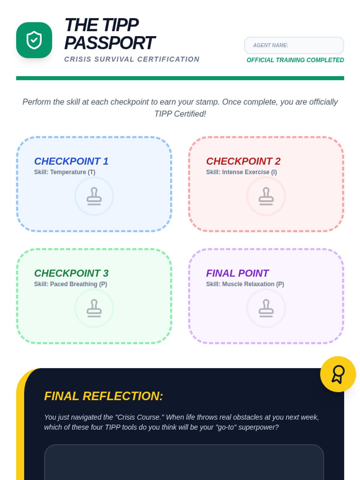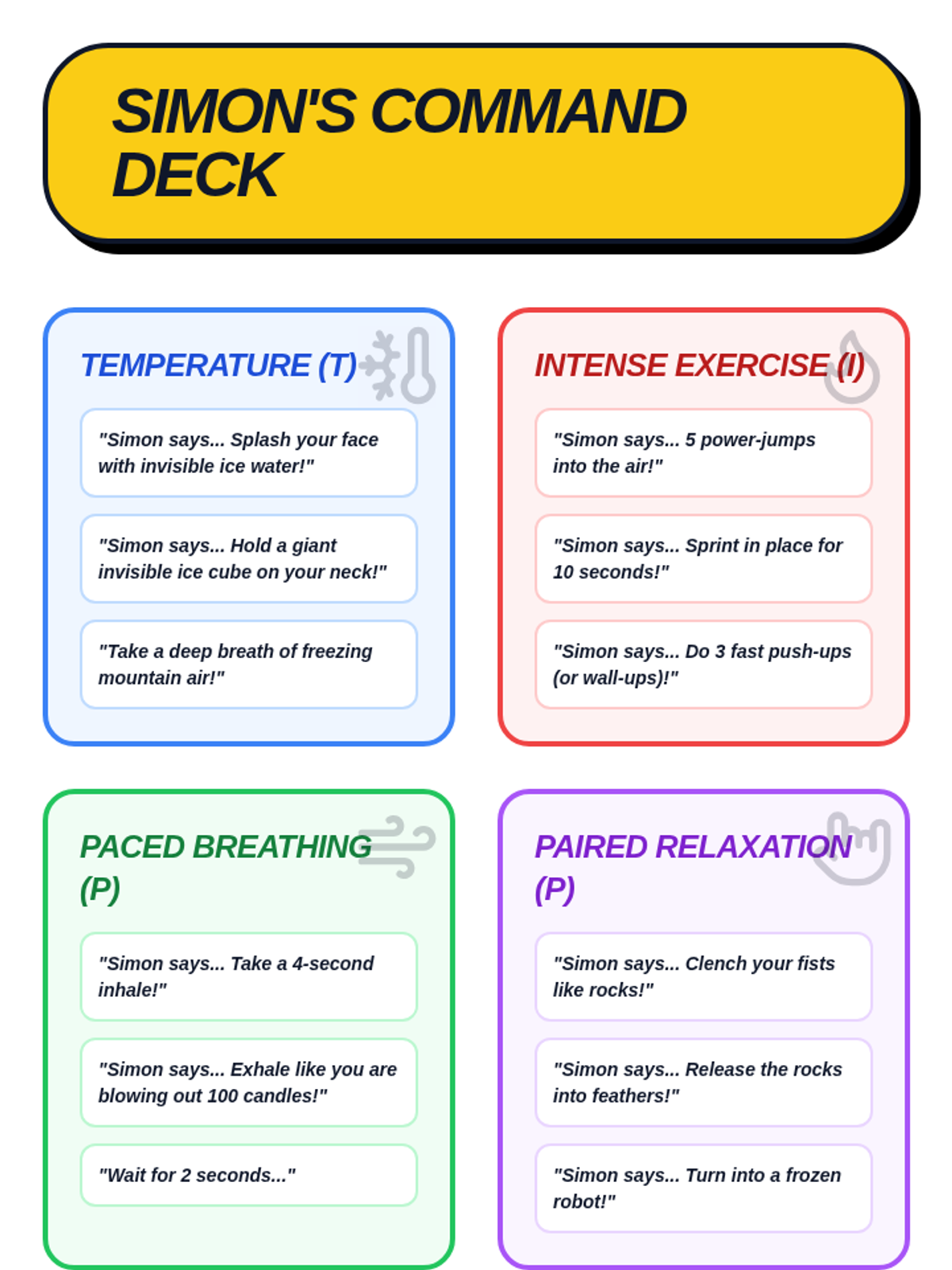A high-energy, game-based sequence designed to teach 5th-grade students TIPP crisis survival skills through active movement and physical practice to build muscle memory for emotional regulation.