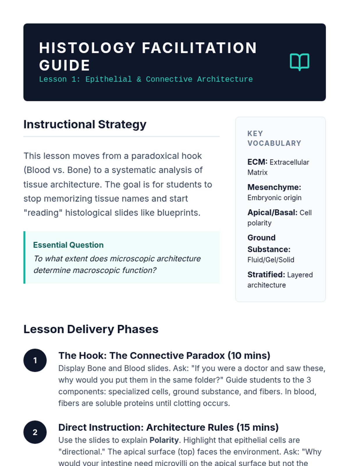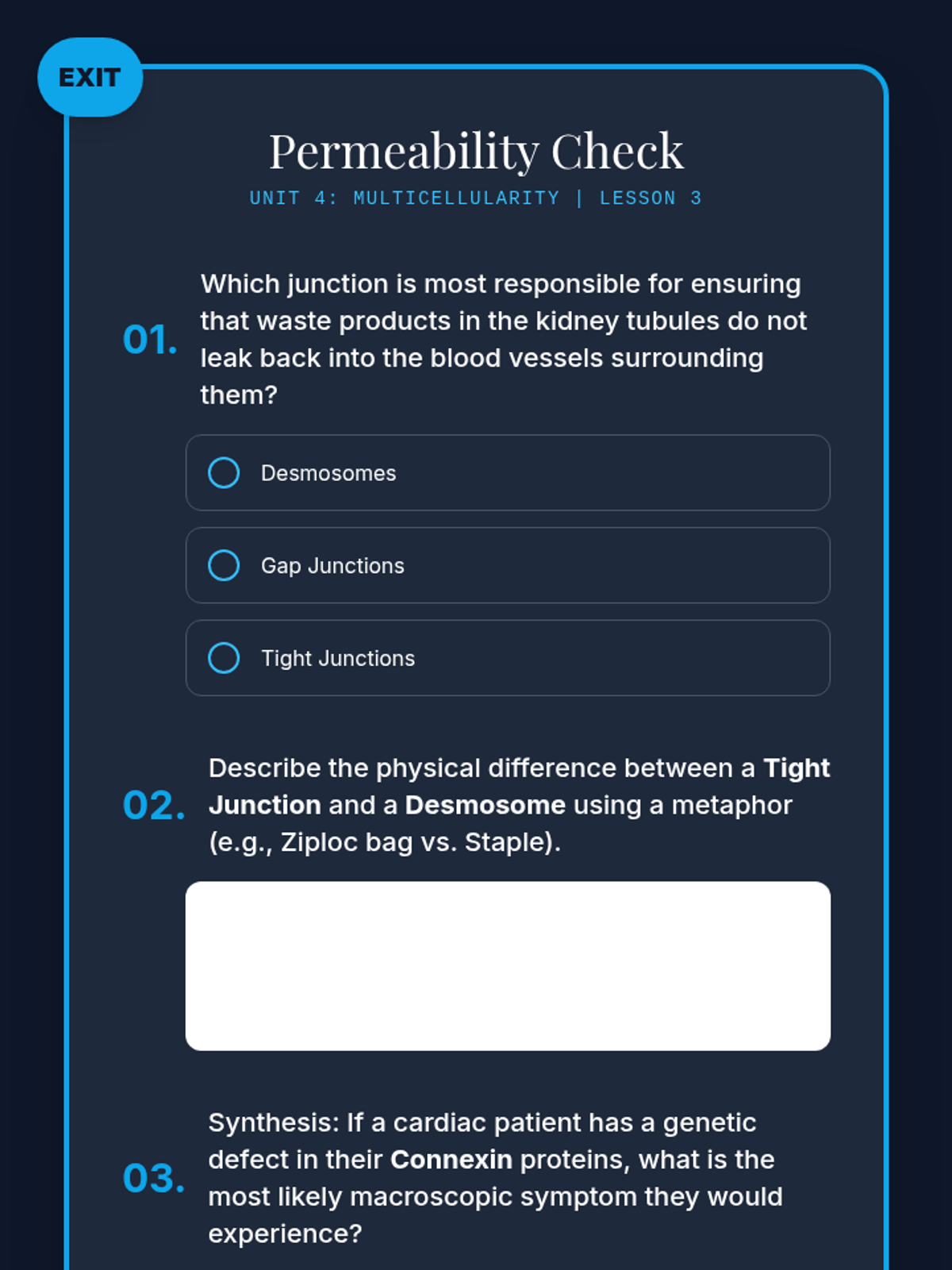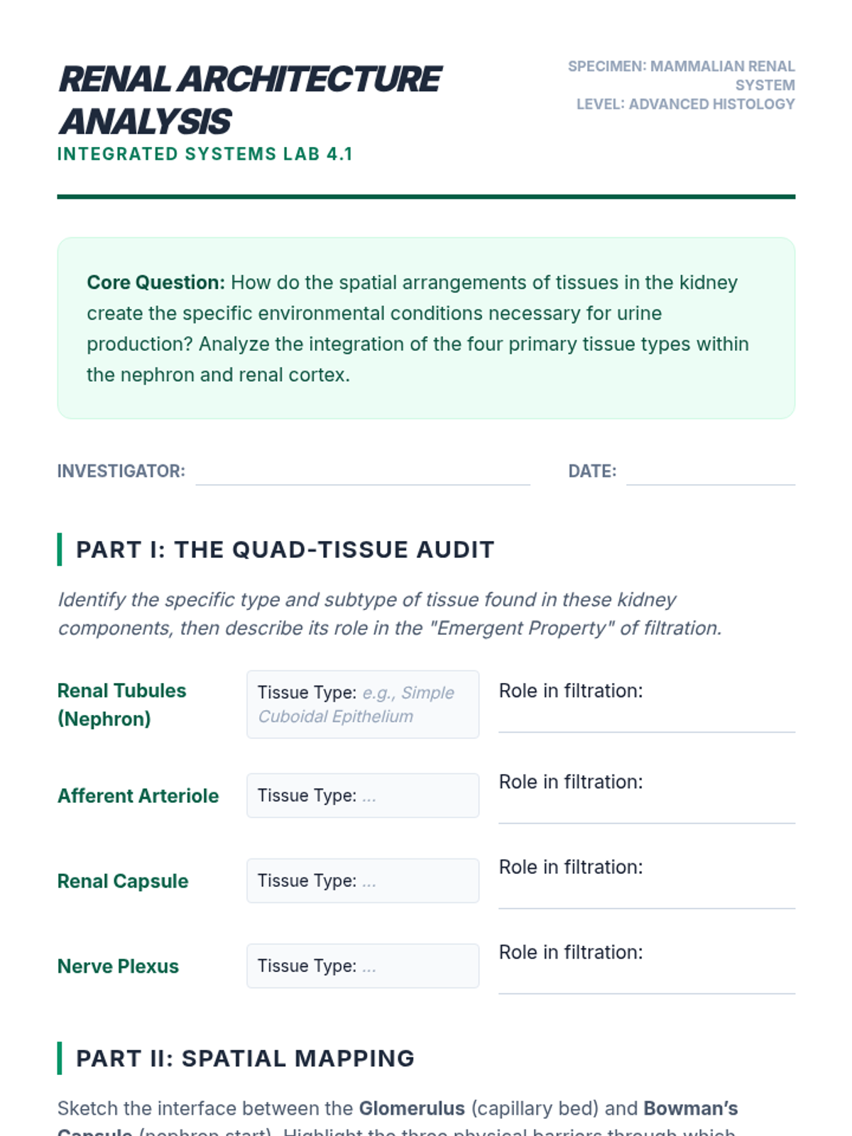 An advanced biology sequence for 12th graders exploring the hierarchical organization of multicellular organisms. Students analyze how specialized cells form tissues and organs, culminating in a bioengineering project to design artificial tissue scaffolds.