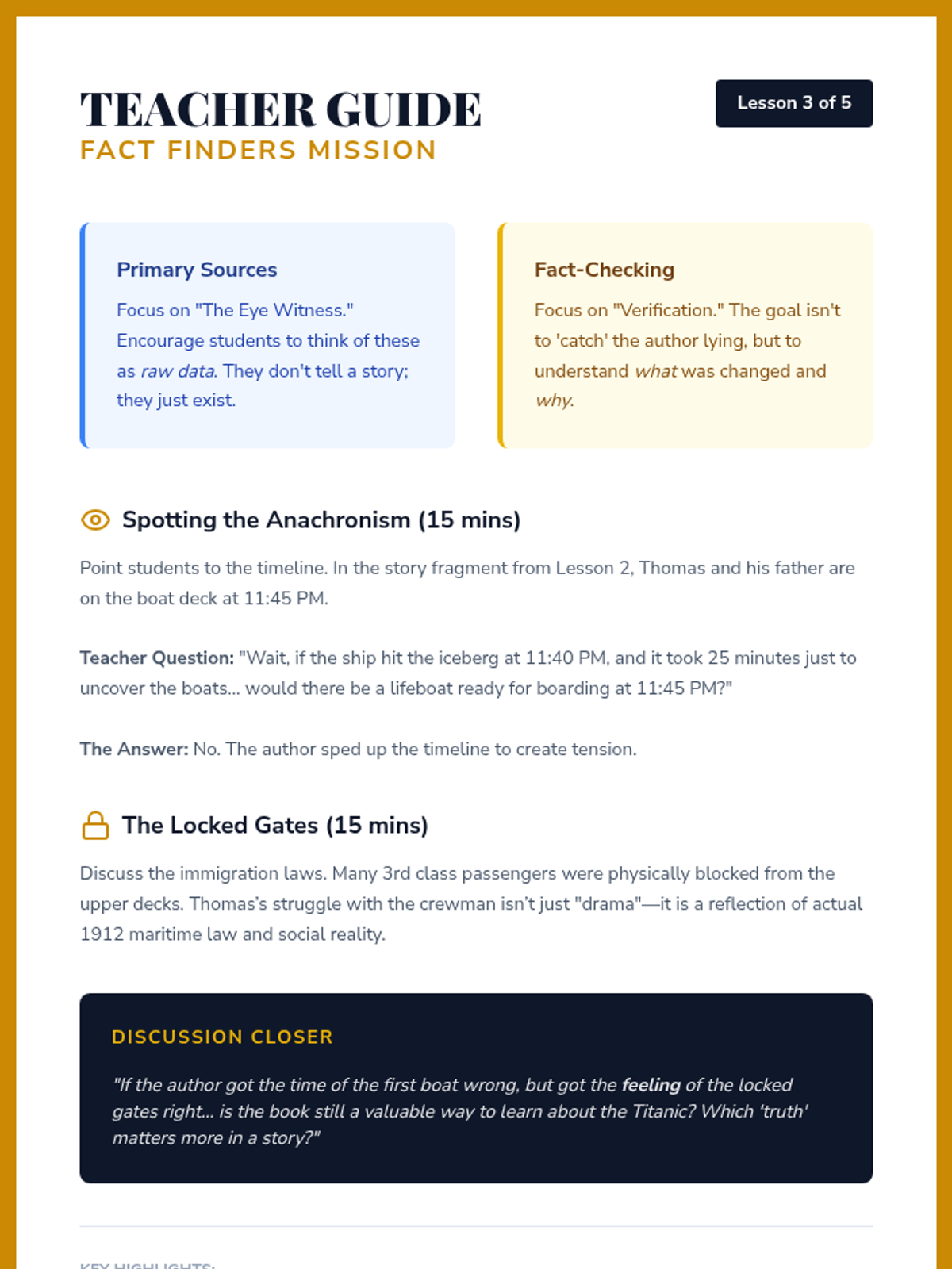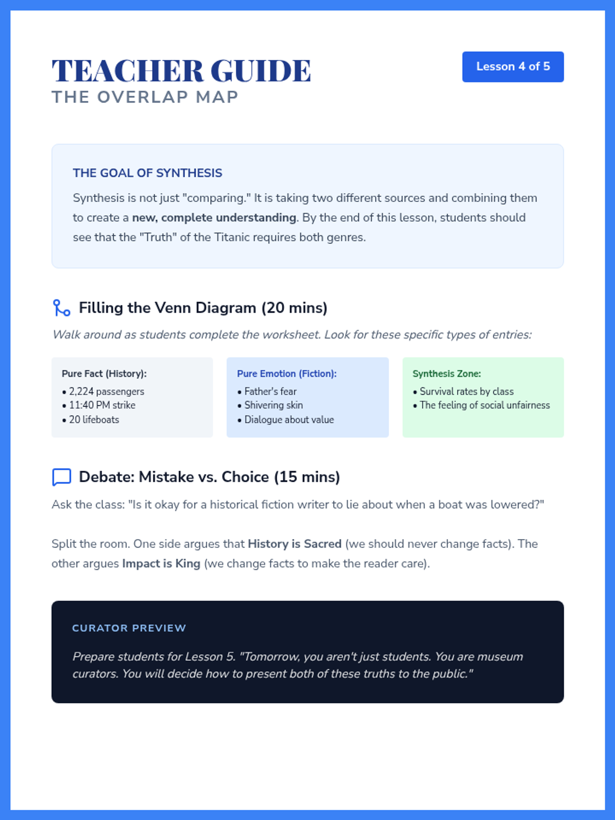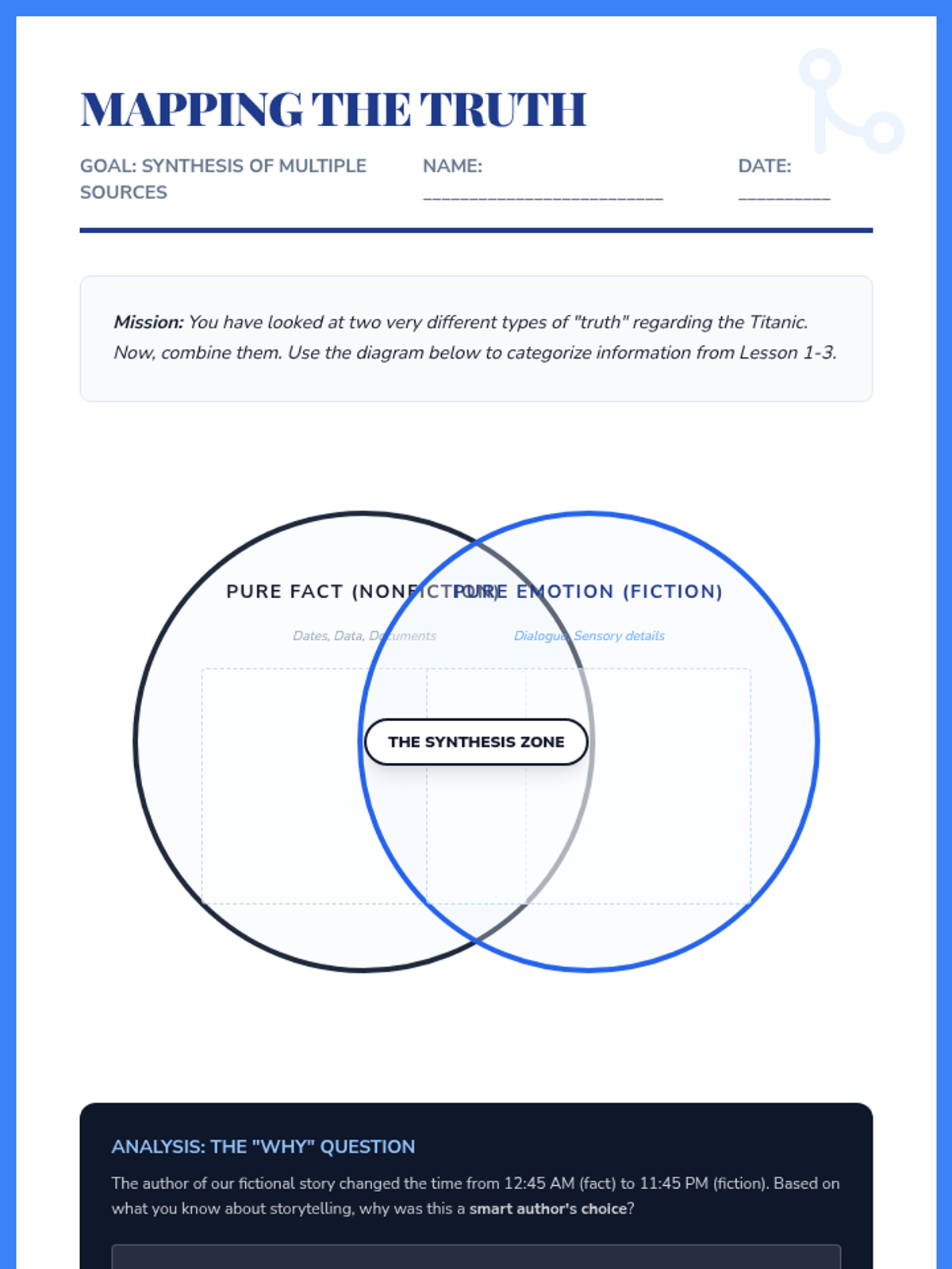 A 6th-grade ELA sequence that explores the differences between historical fiction and informational texts using the Titanic as a central case study. Students learn to synthesize information, identify genre-specific structures, and understand how authors use different genres to convey 'emotional truth' versus 'historical fact.'
