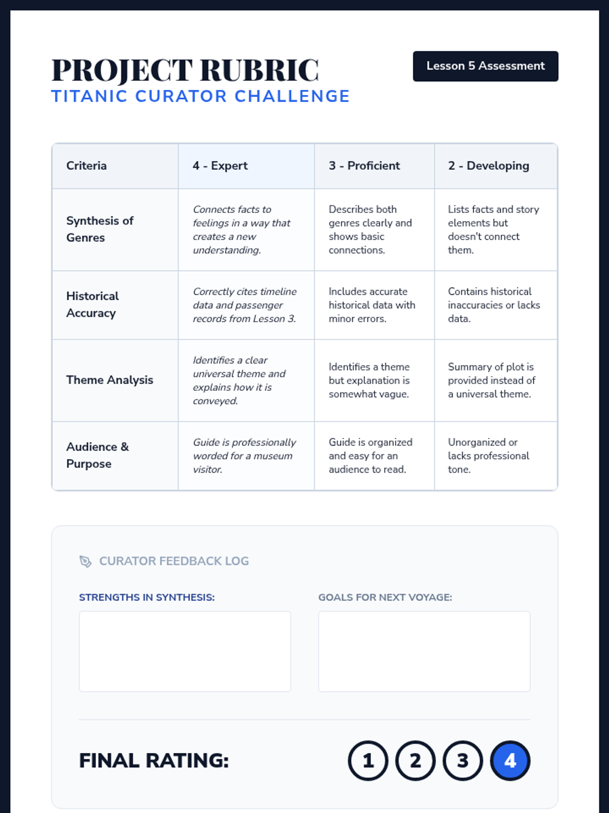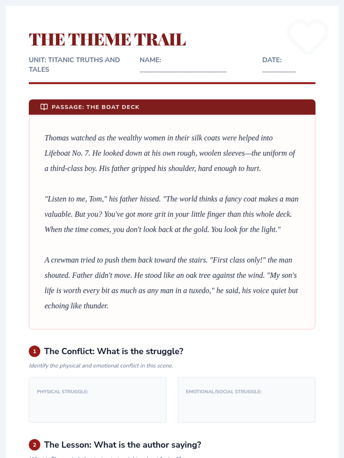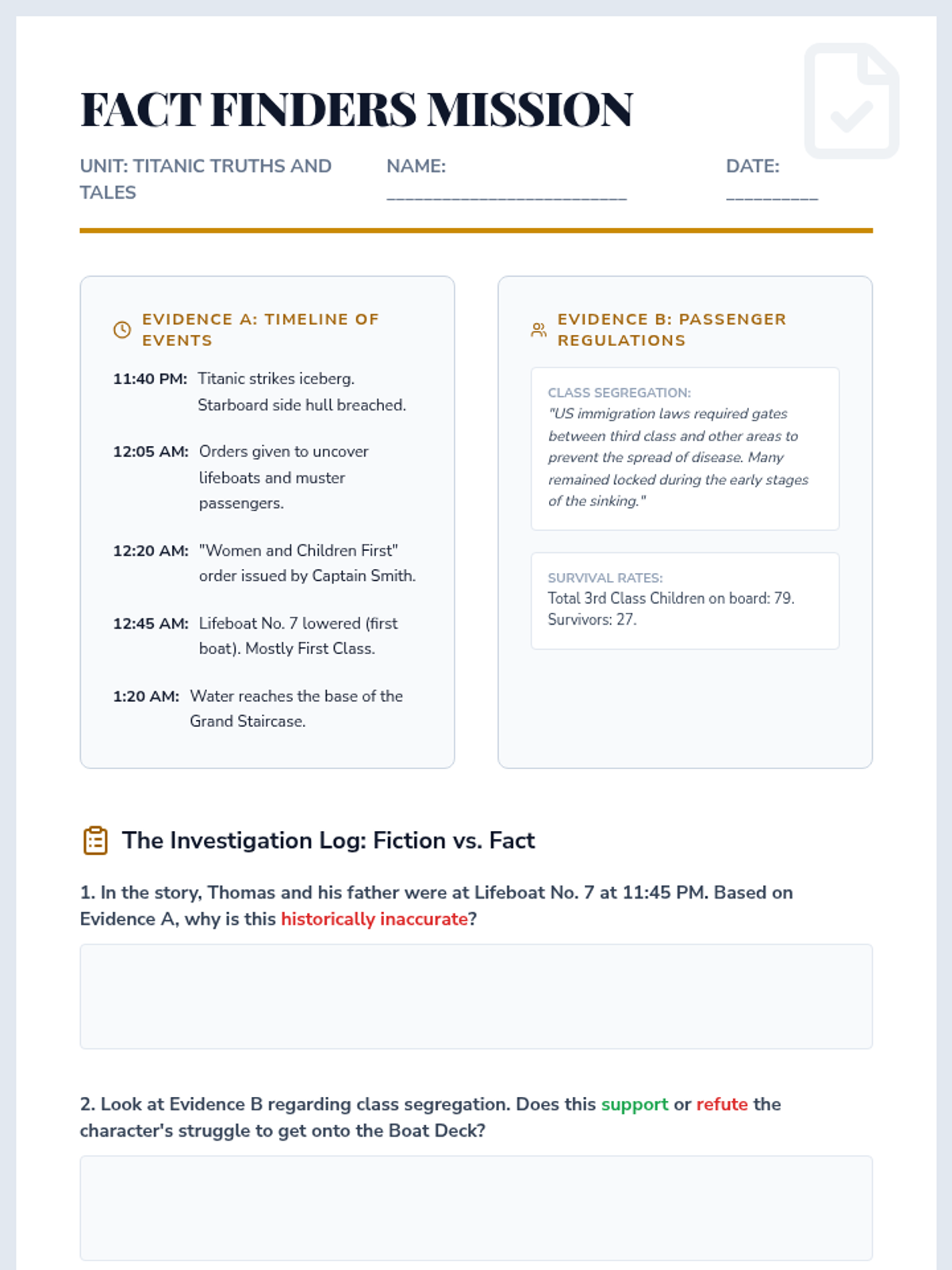 A 6th-grade ELA sequence that explores the differences between historical fiction and informational texts using the Titanic as a central case study. Students learn to synthesize information, identify genre-specific structures, and understand how authors use different genres to convey 'emotional truth' versus 'historical fact.'