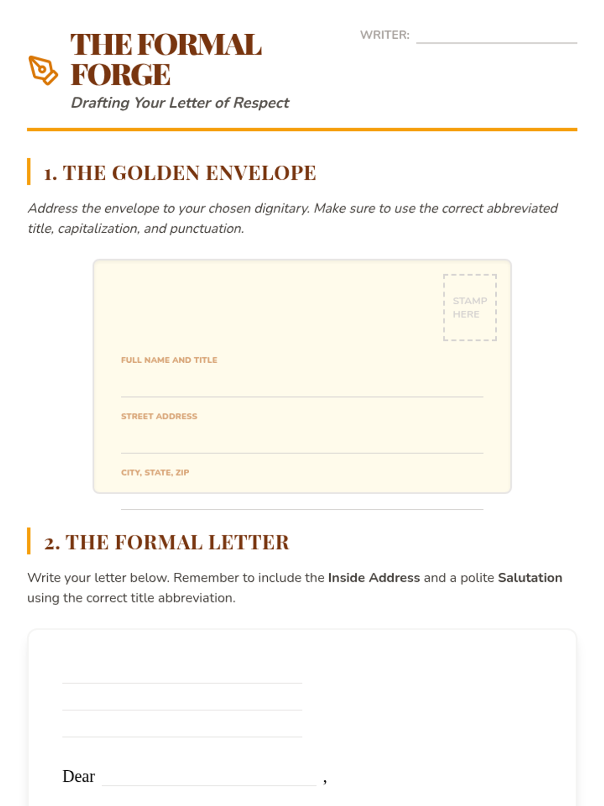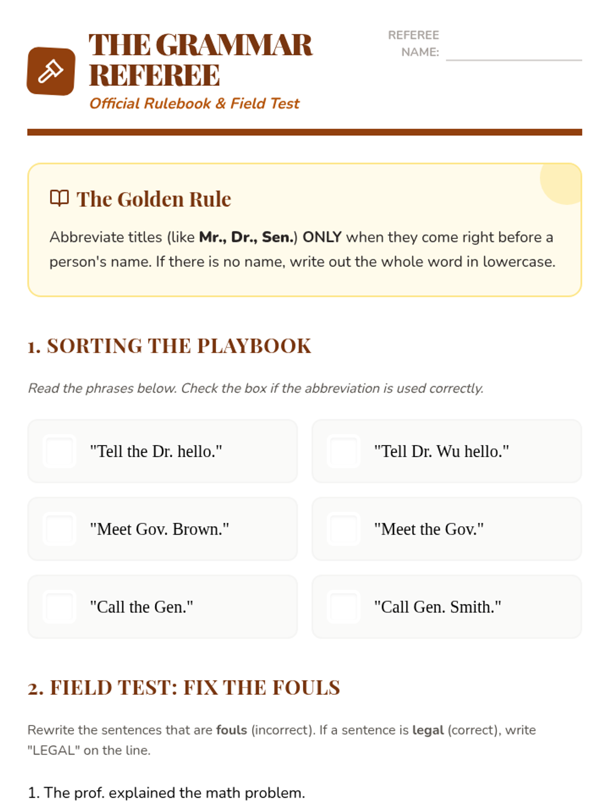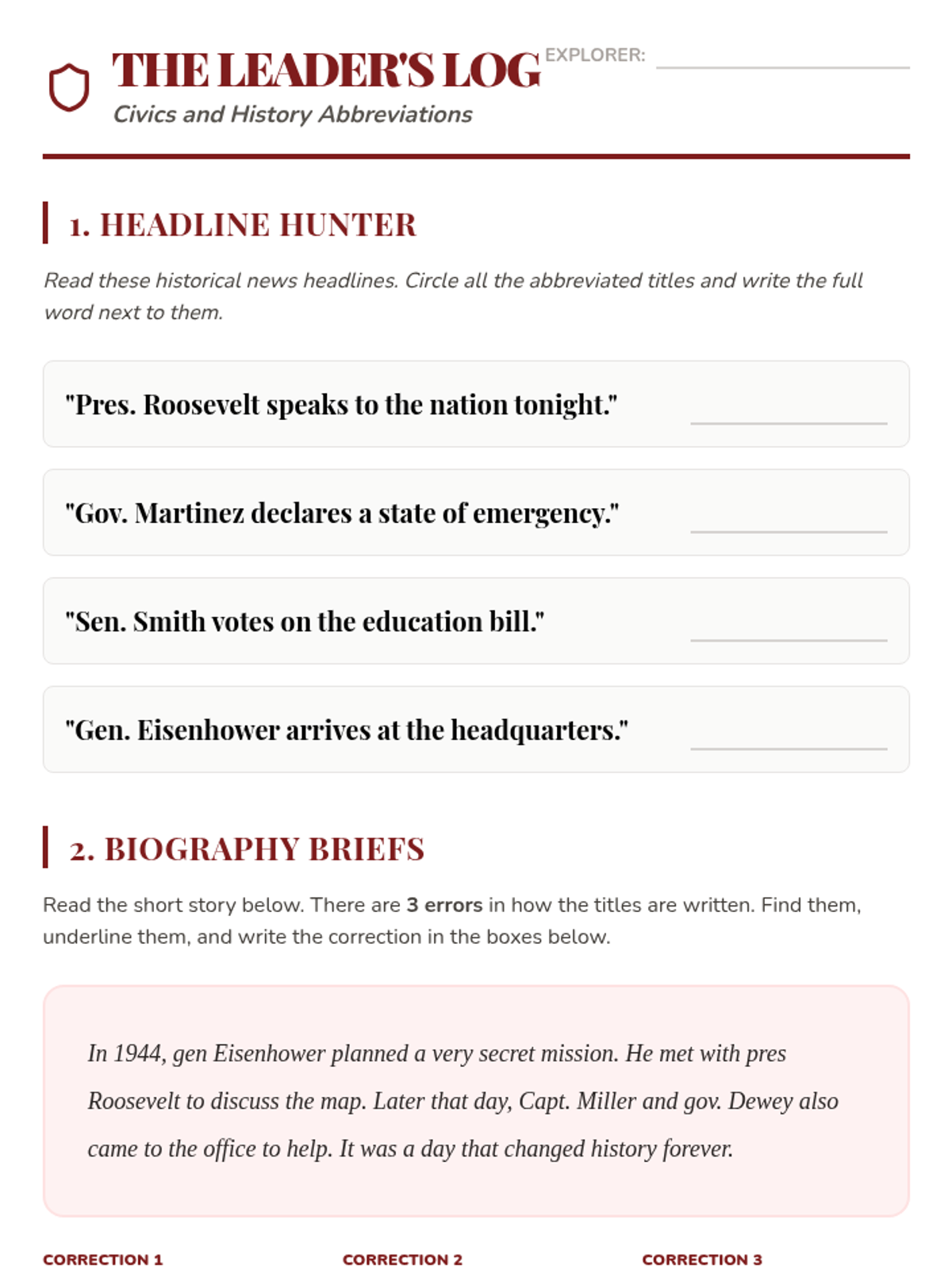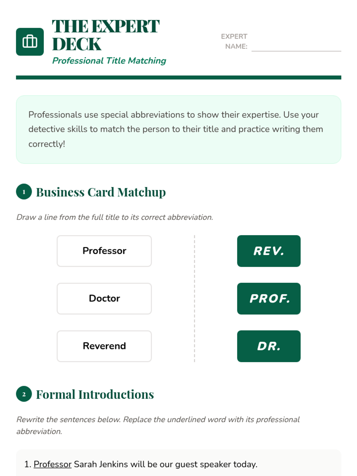 This sequence explores the social and formal rules of abbreviating titles for people. Using a case-study approach, students analyze formal letters, biographies, and business cards to understand how titles like Mr., Dr., and Gov. establish identity and respect. Students practice identifying these titles and writing them with proper capitalization and punctuation. The sequence concludes with students writing a formal letter to a community leader.