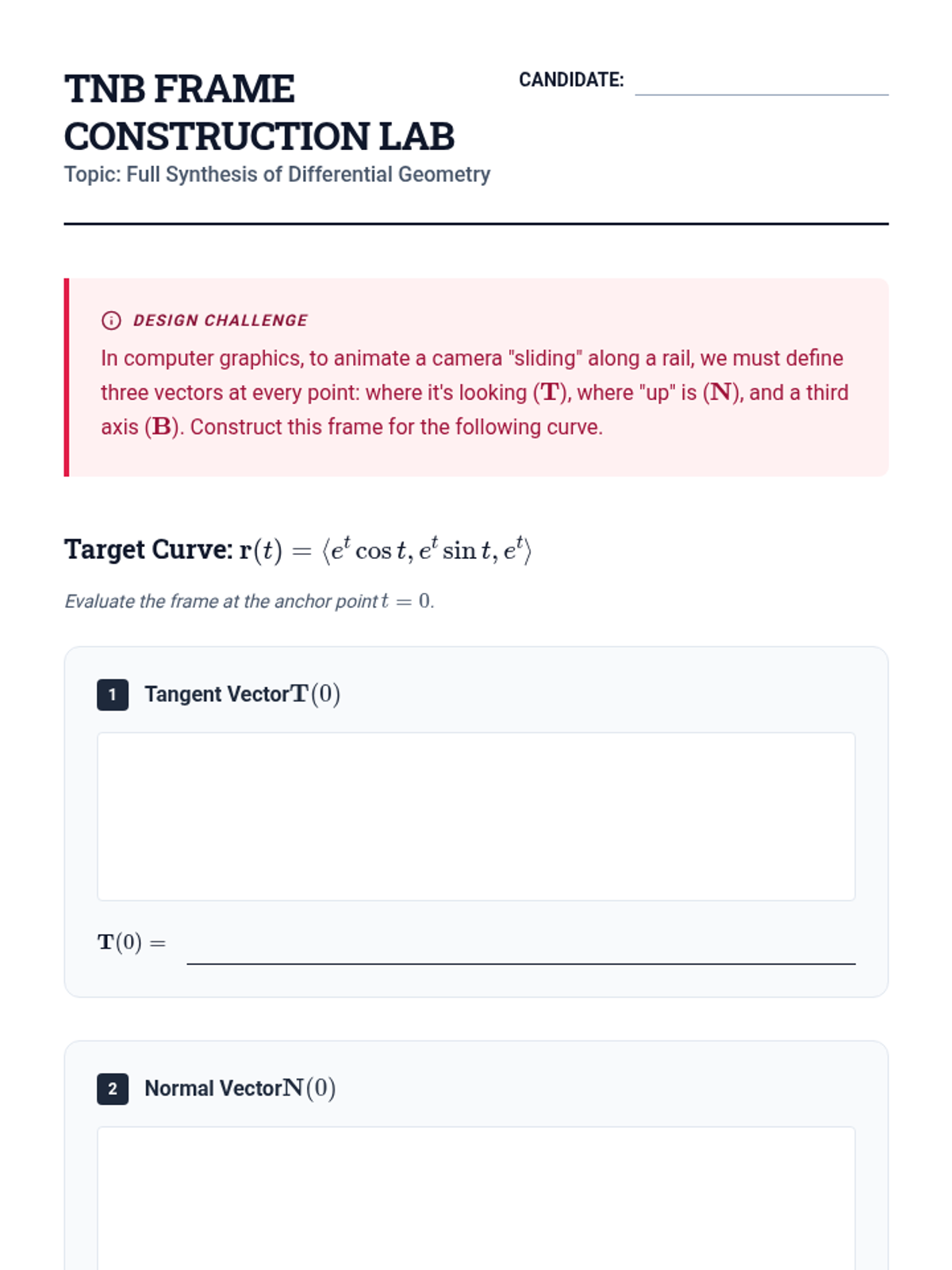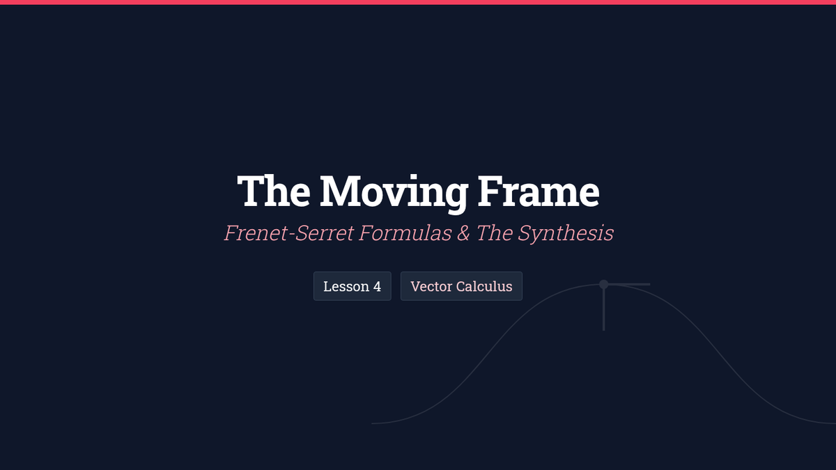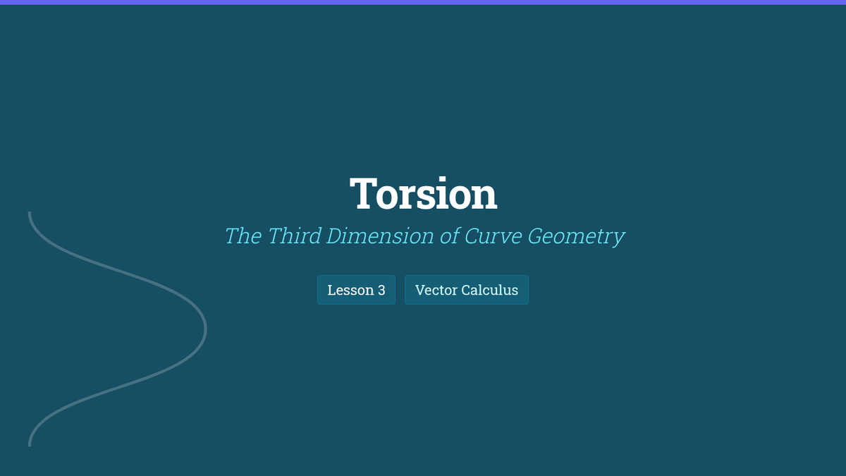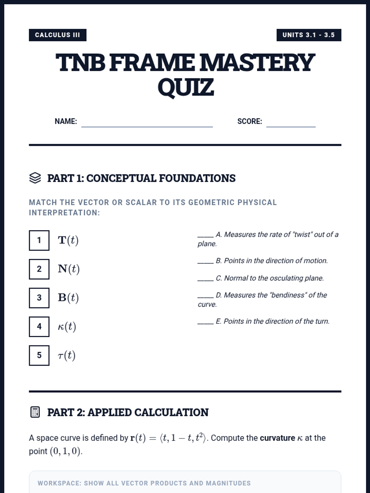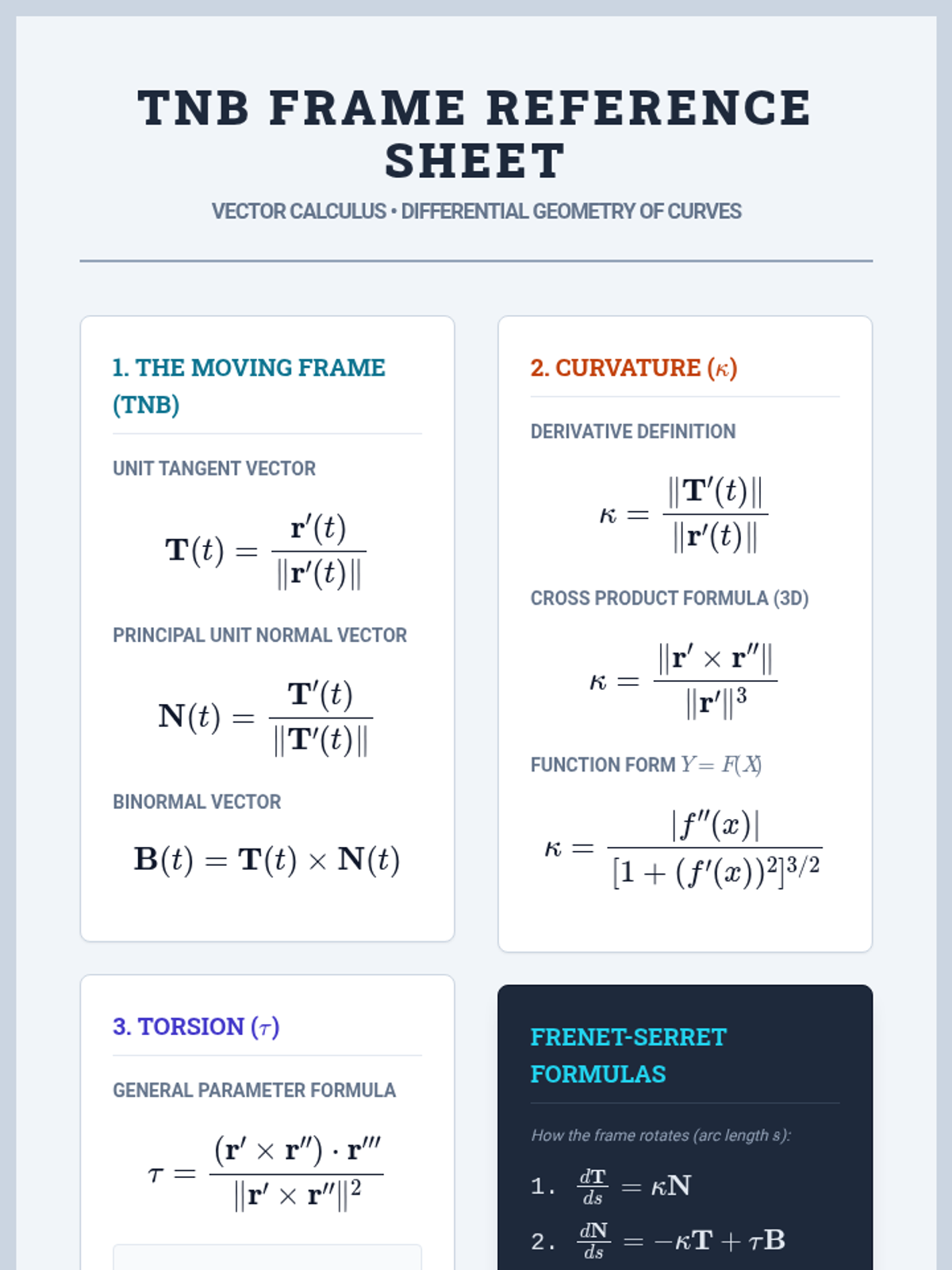 A comprehensive undergraduate-level sequence exploring the intrinsic geometry of space curves through the TNB (Tangent, Normal, Binormal) frame, curvature, and torsion. Students move from basic vector functions to advanced structural analysis of curves in 3D space.