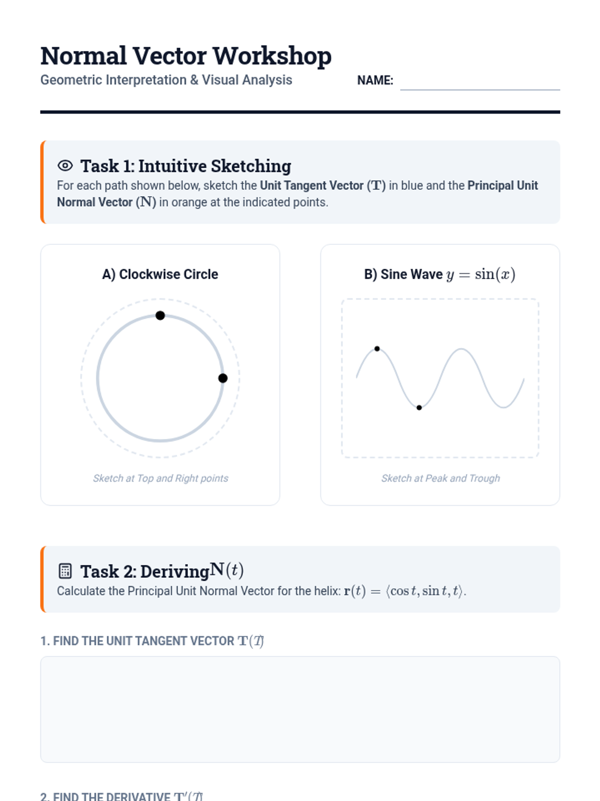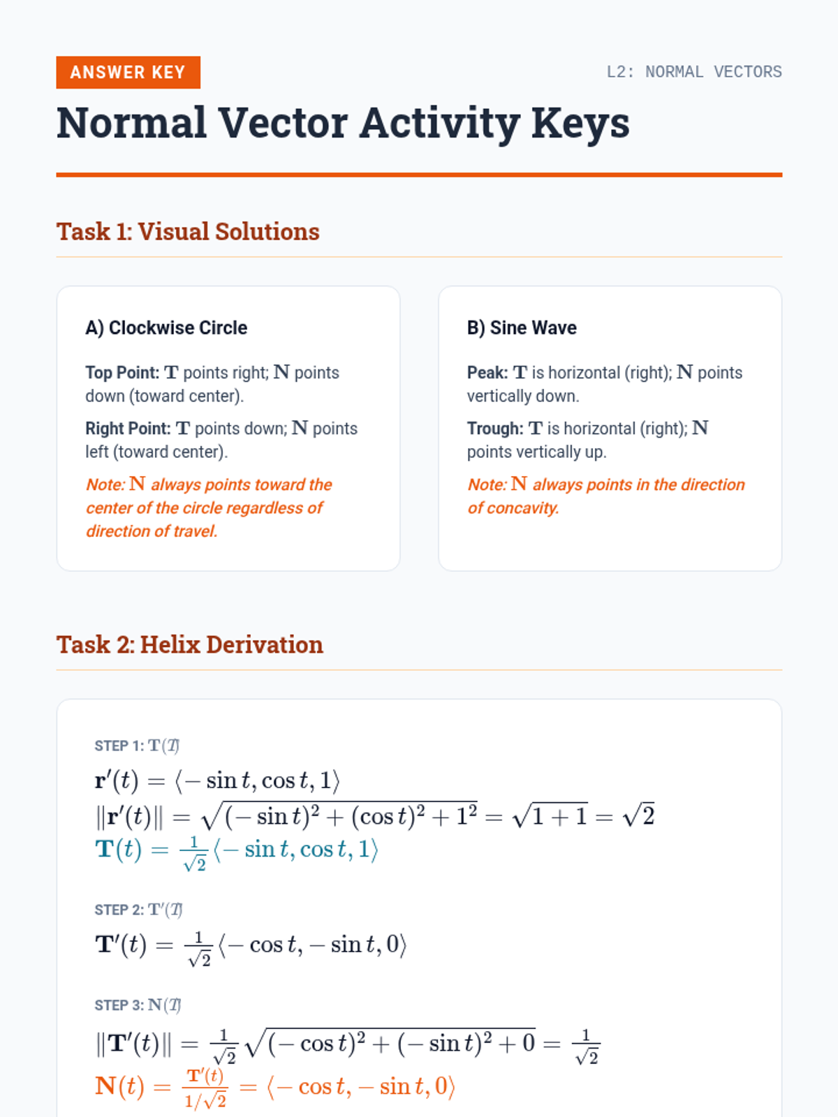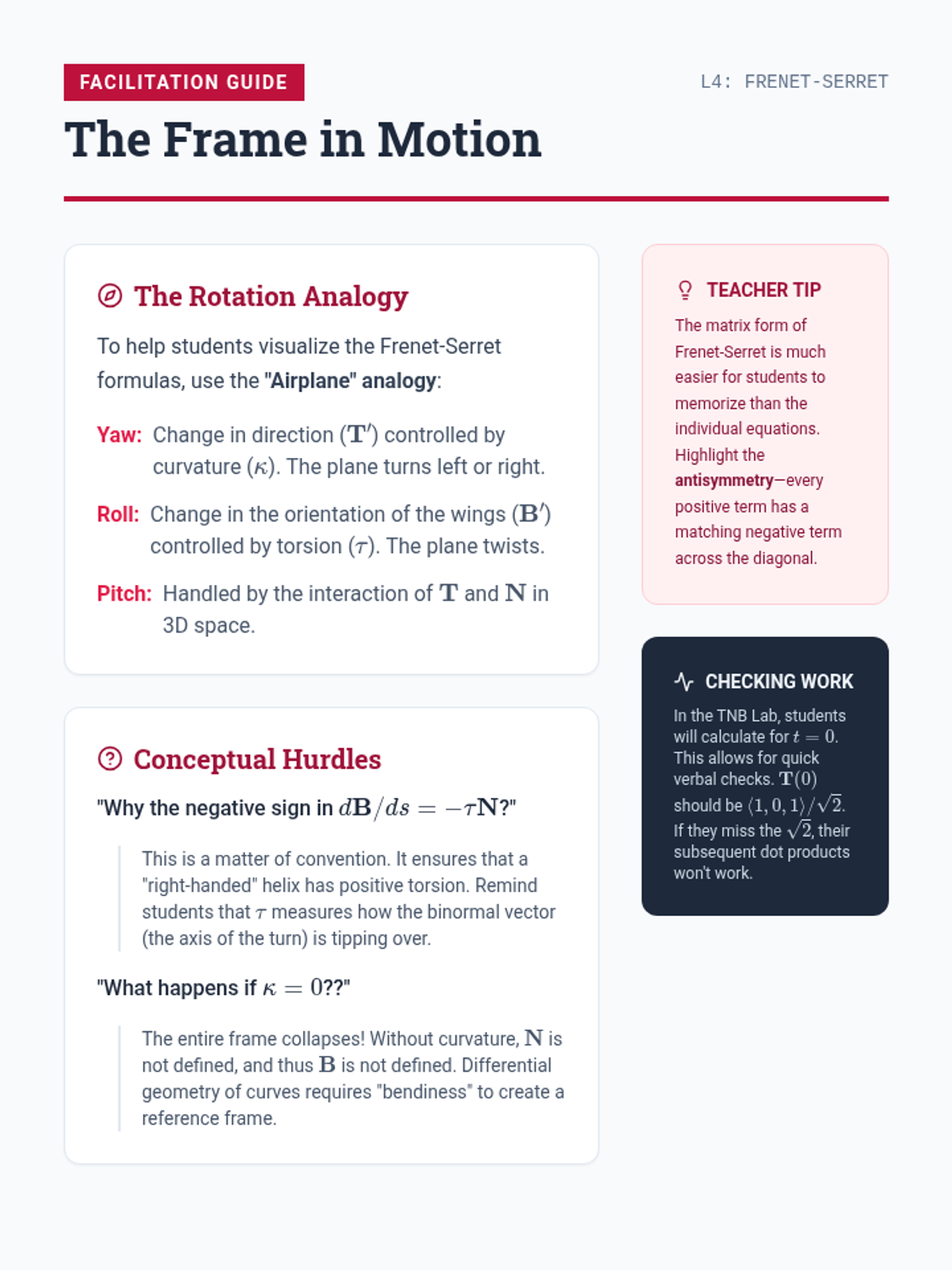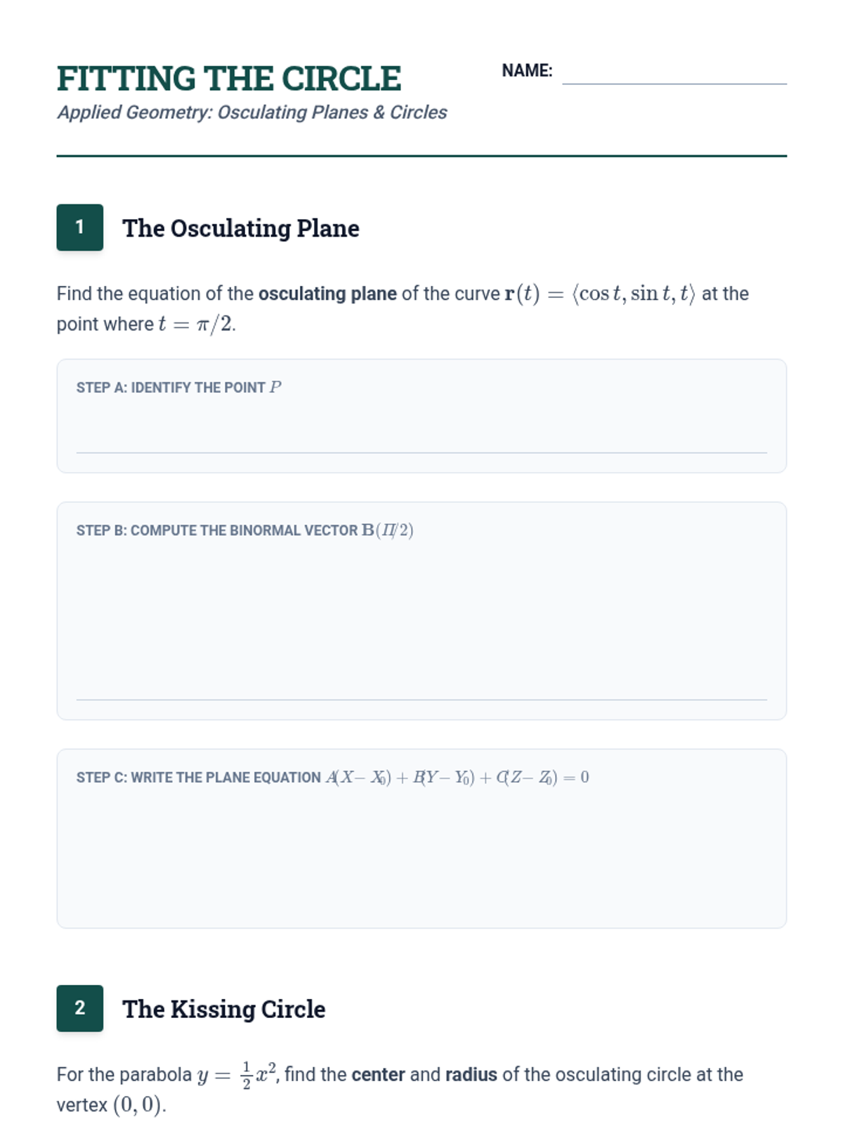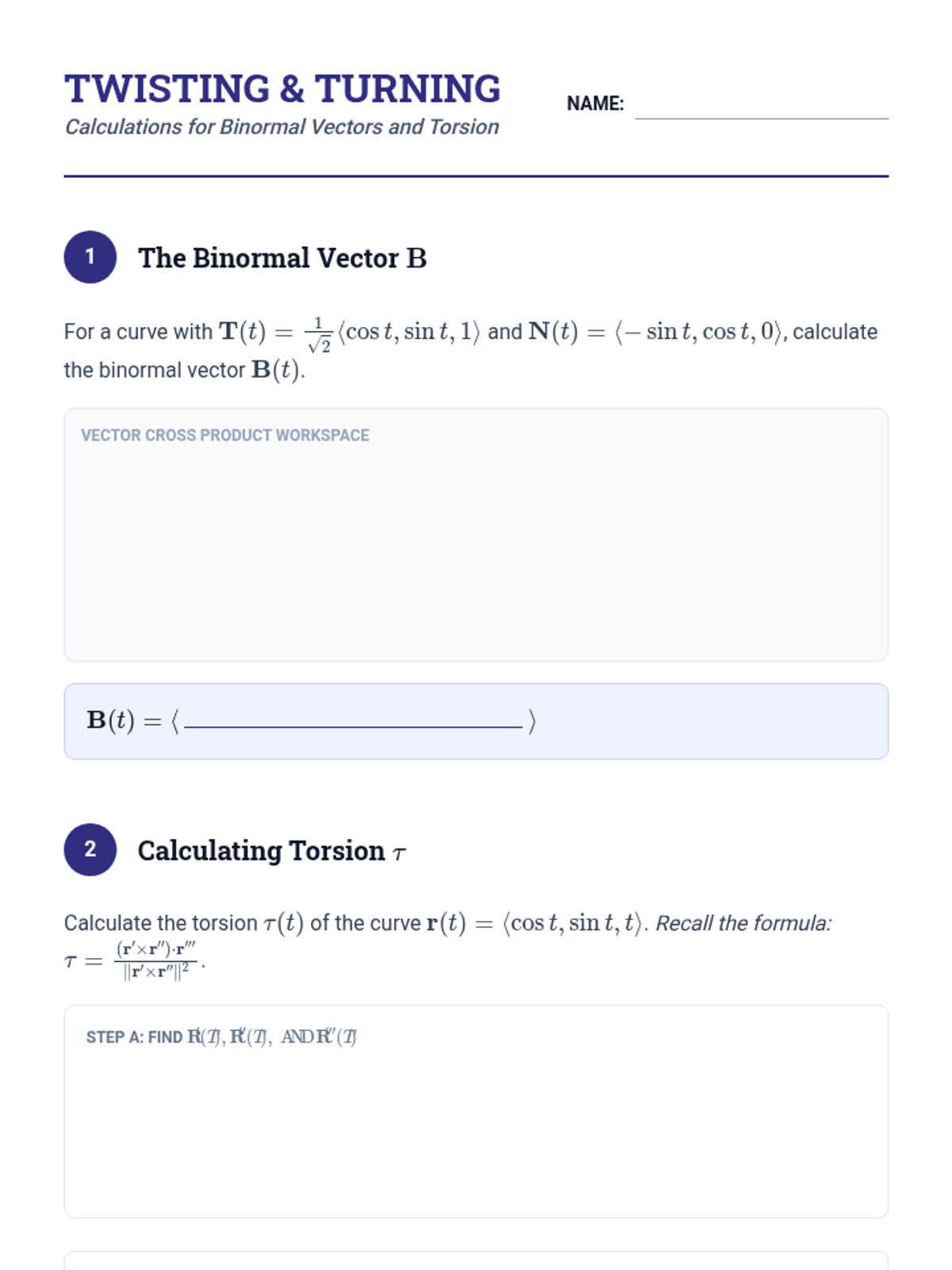 A comprehensive undergraduate-level sequence exploring the intrinsic geometry of space curves through the TNB (Tangent, Normal, Binormal) frame, curvature, and torsion. Students move from basic vector functions to advanced structural analysis of curves in 3D space.