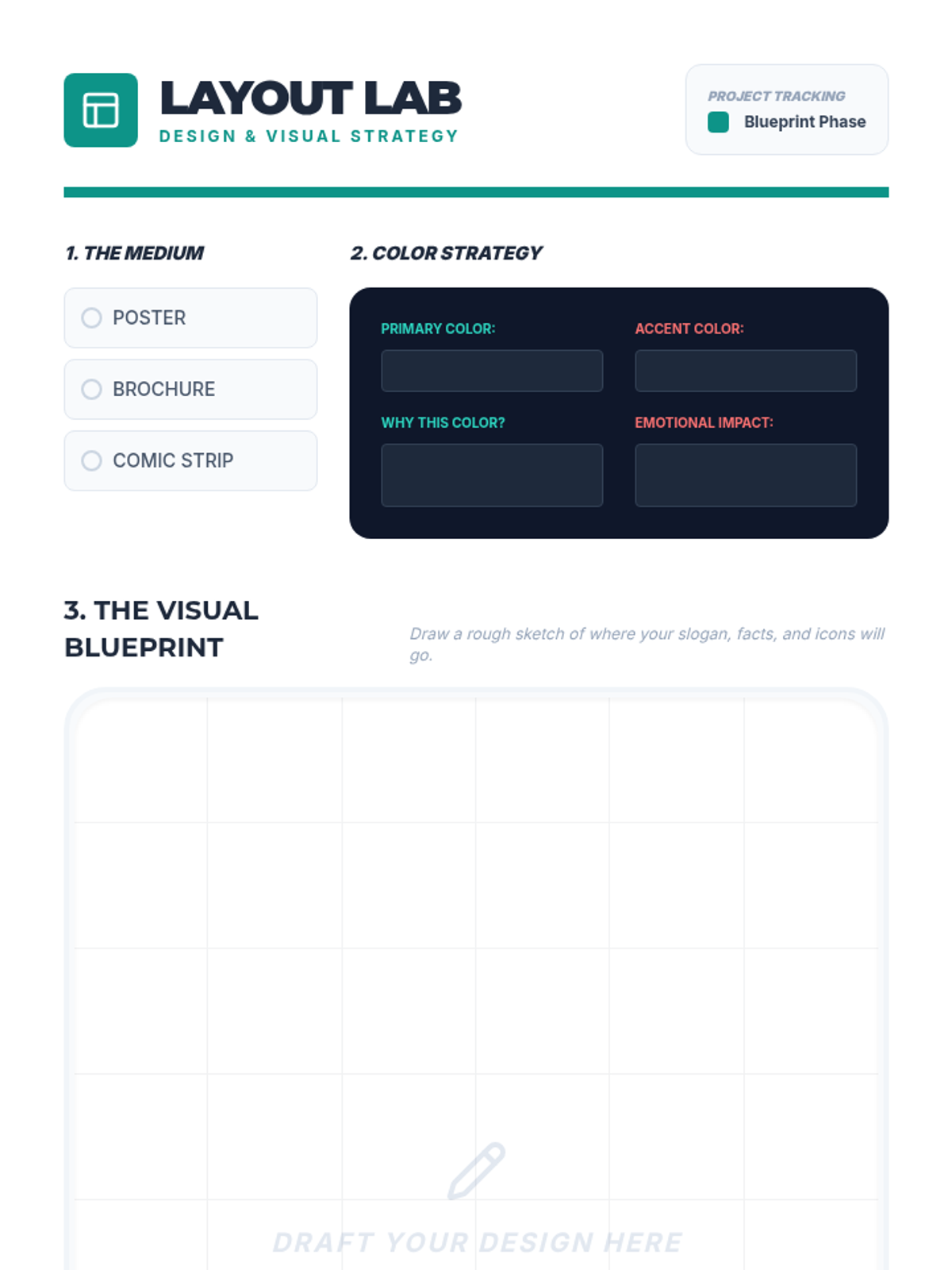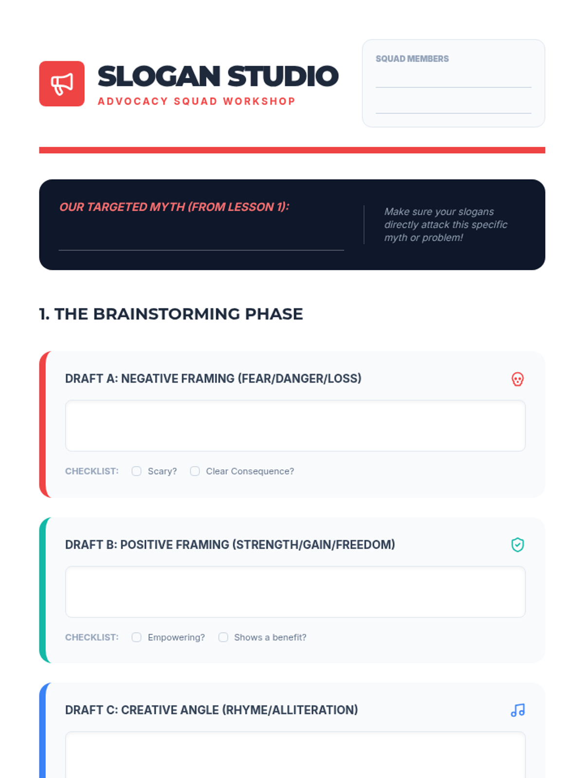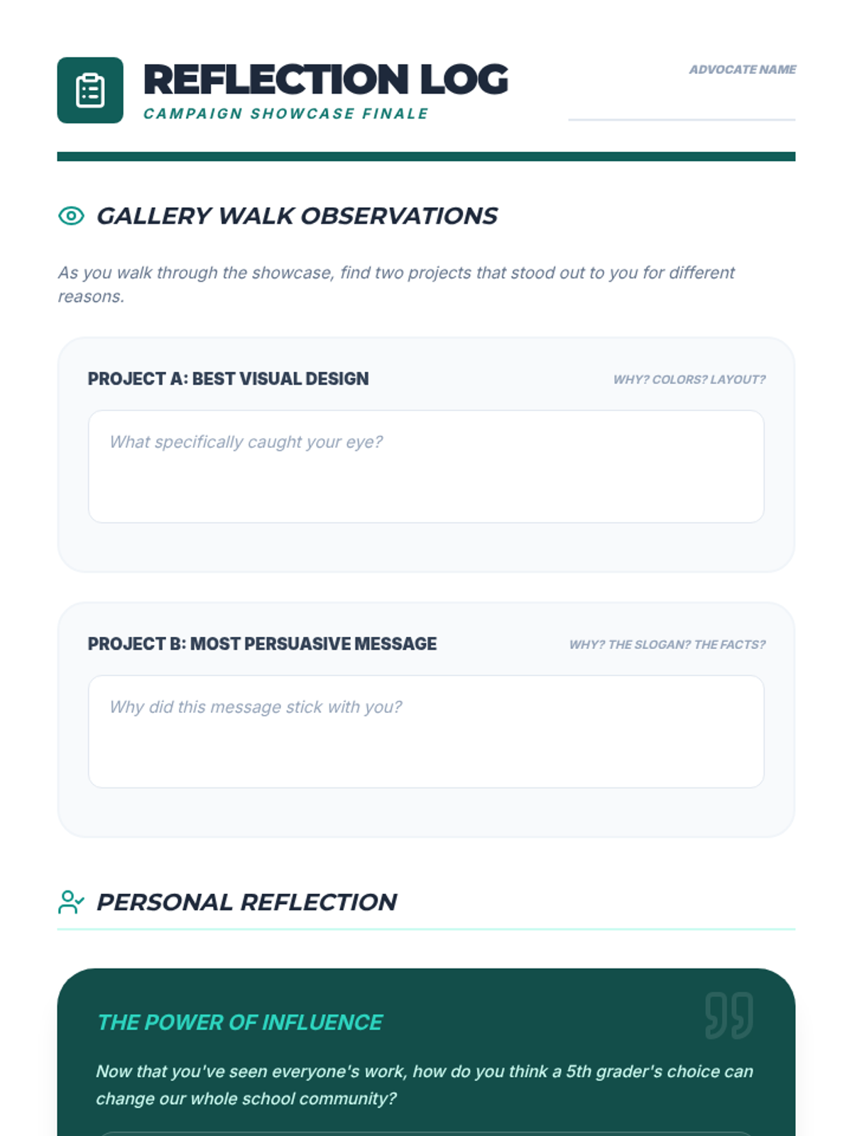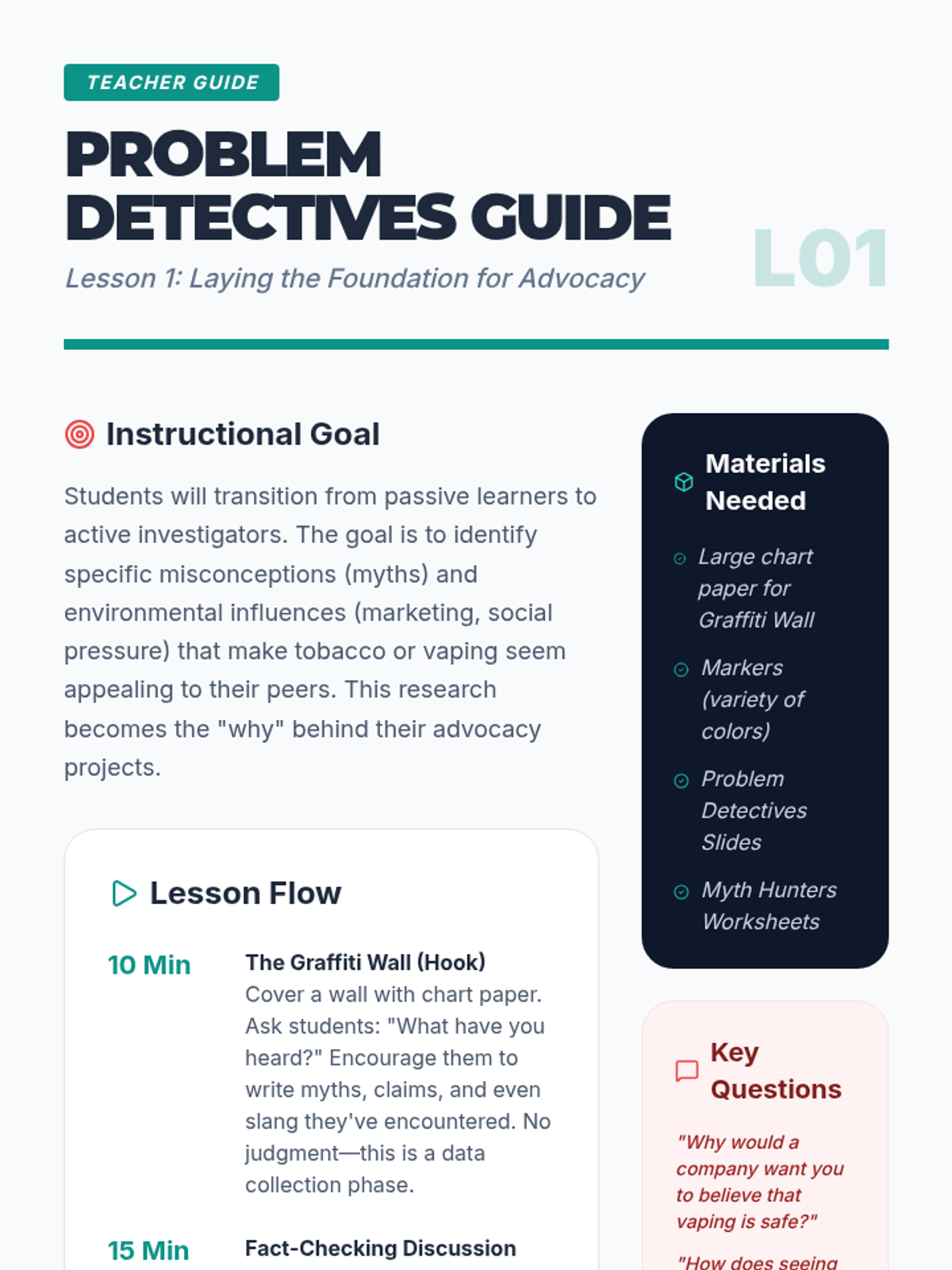 Students transition from learners to leaders by designing a public health advocacy campaign for their school community. Starting with identifying specific peer needs and misconceptions about tobacco and vaping, they craft persuasive slogans and visual media to promote a tobacco-free lifestyle, culminating in a community showcase.