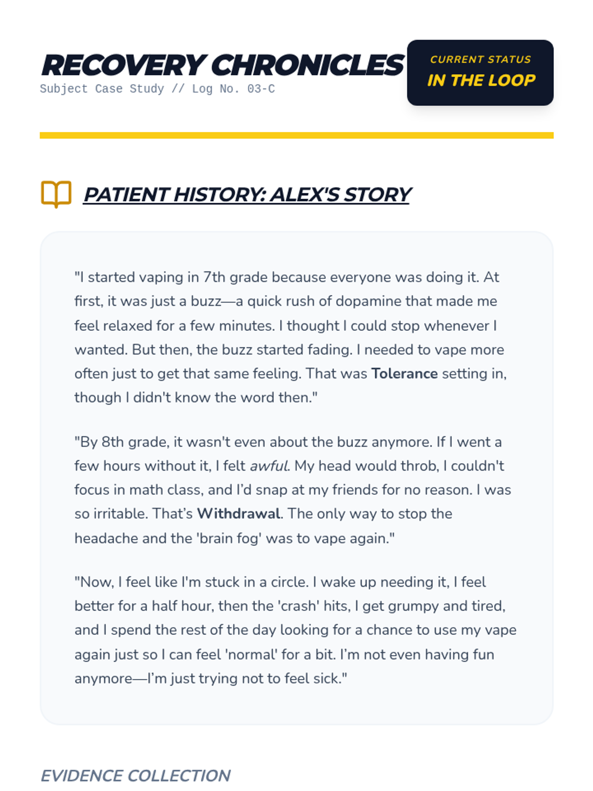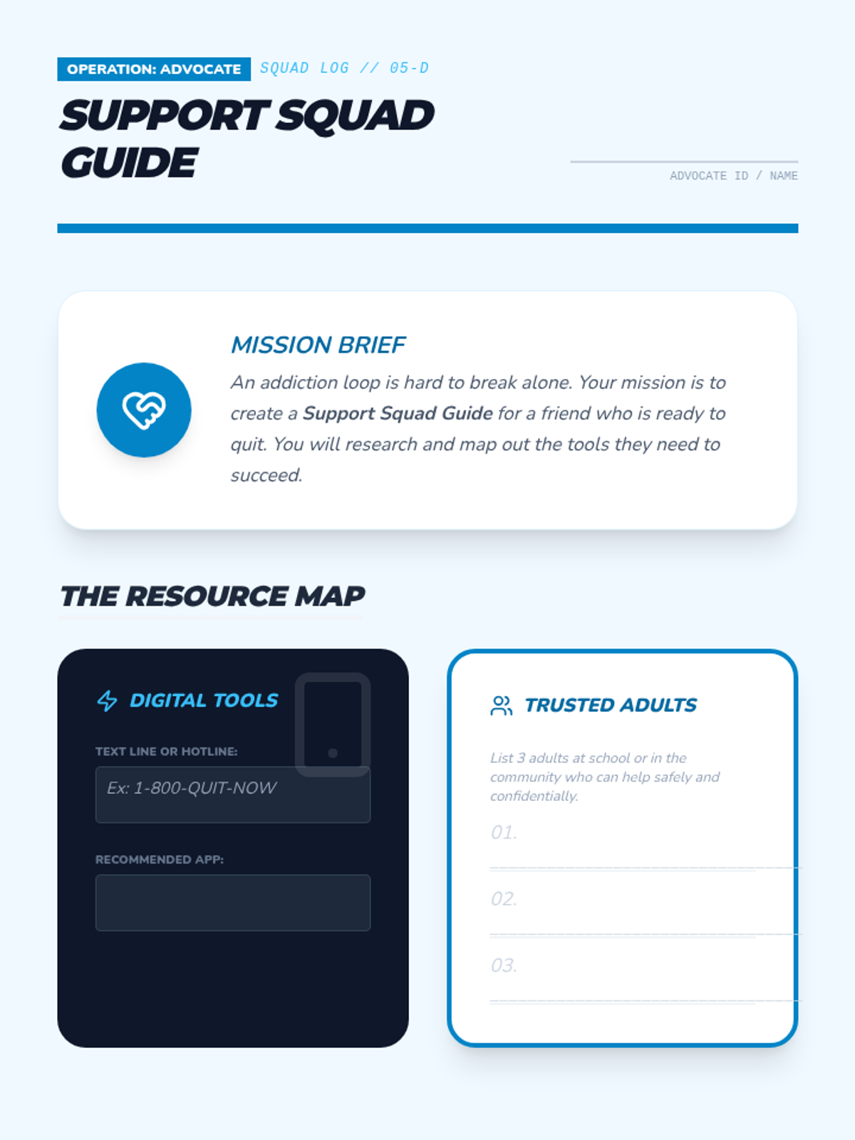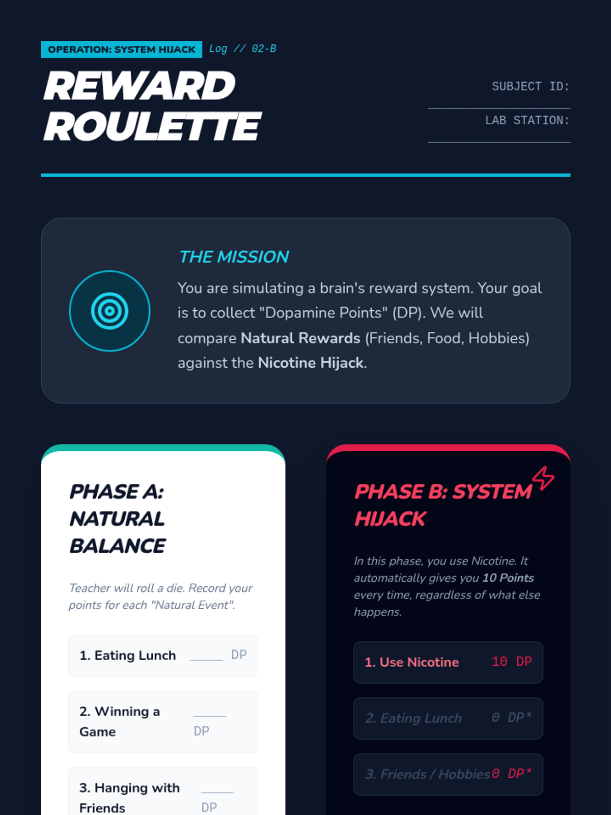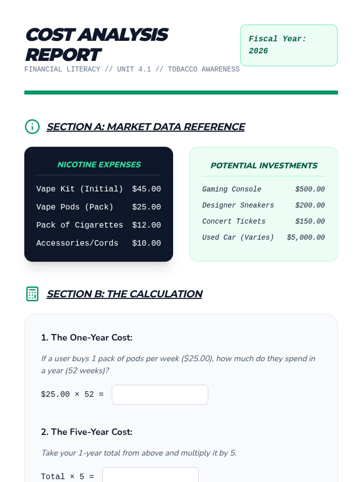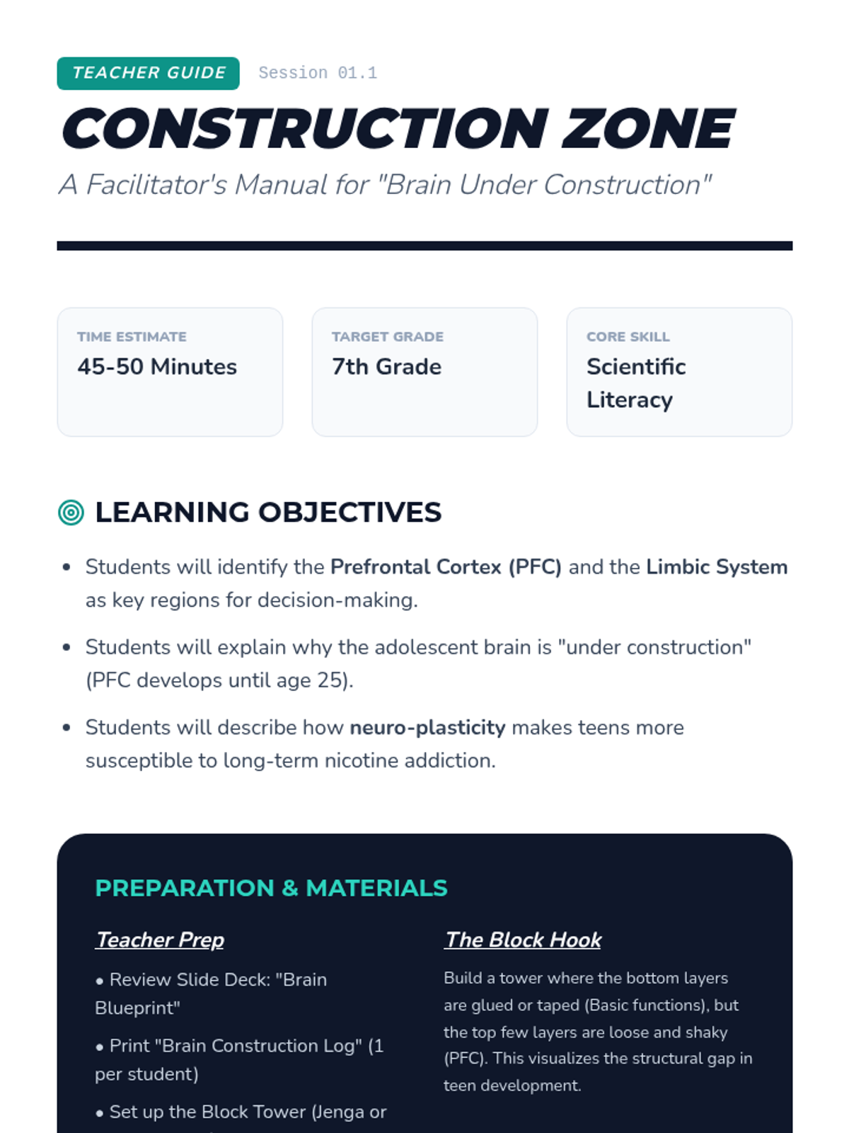 A comprehensive 5-lesson unit for 7th-grade students exploring the neuroscience of nicotine addiction, the adolescent brain's vulnerability, the financial costs of tobacco use, and the resources available for cessation and support.