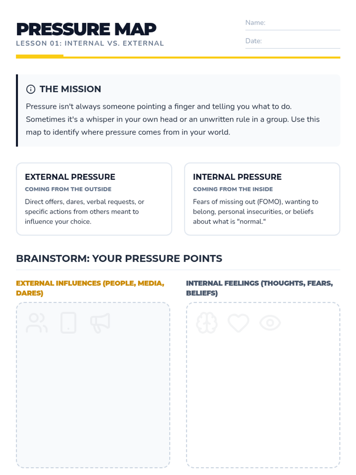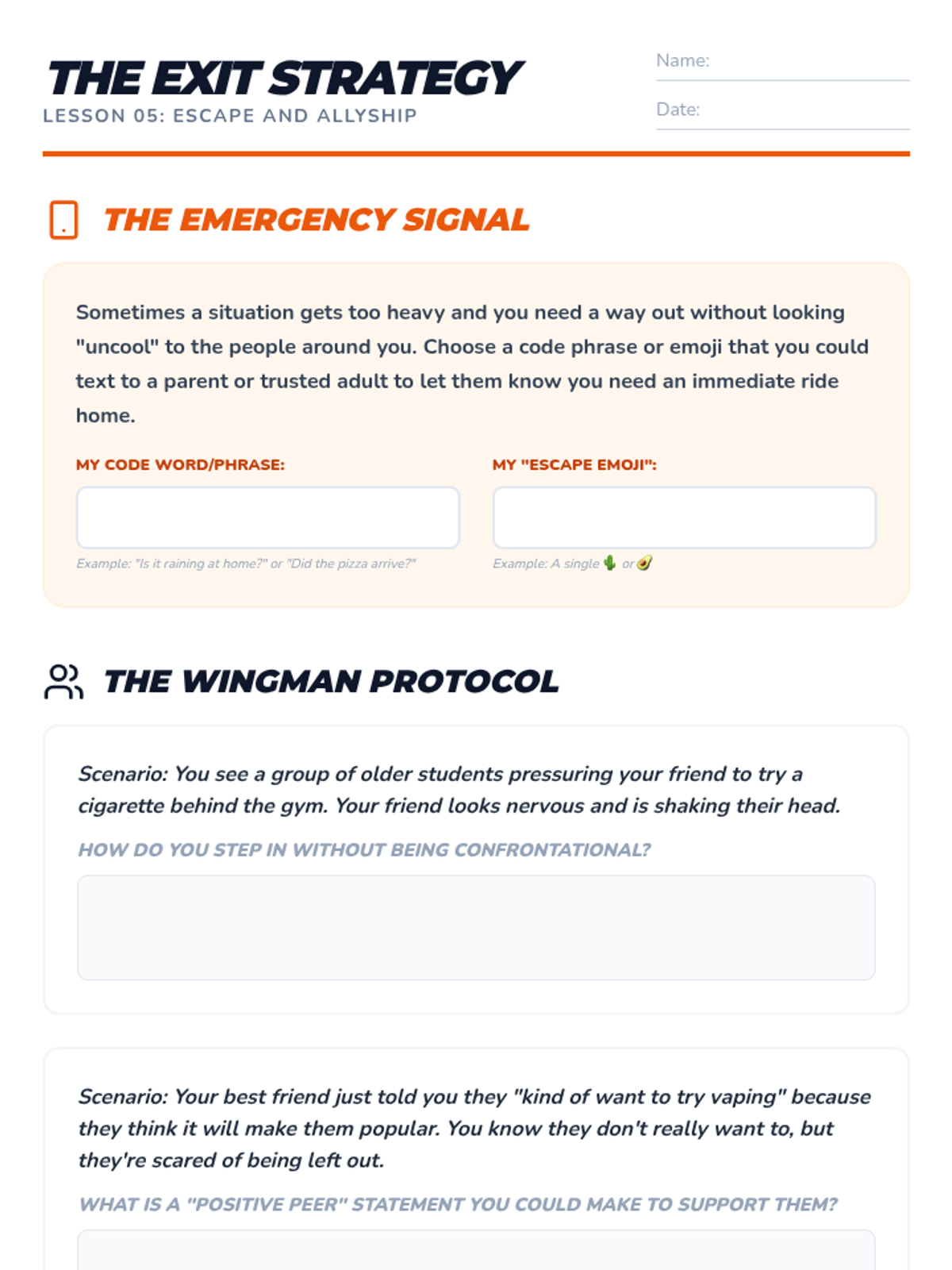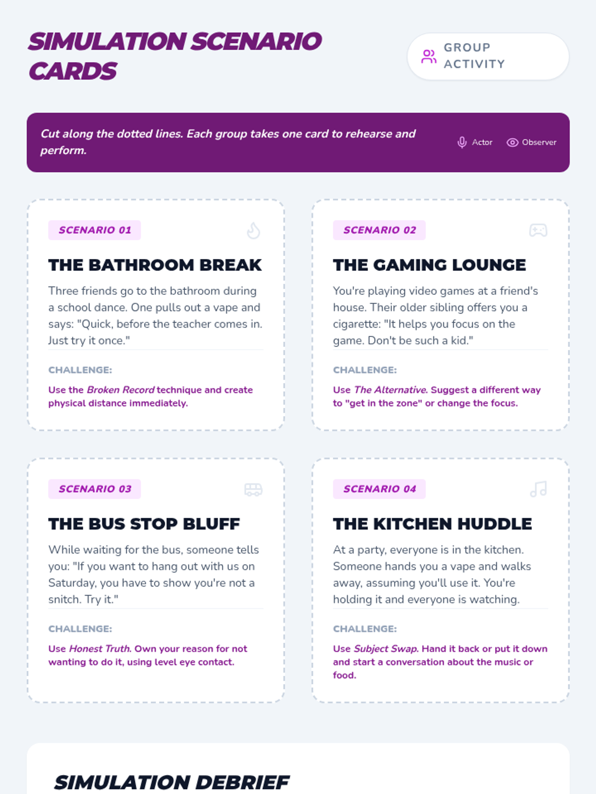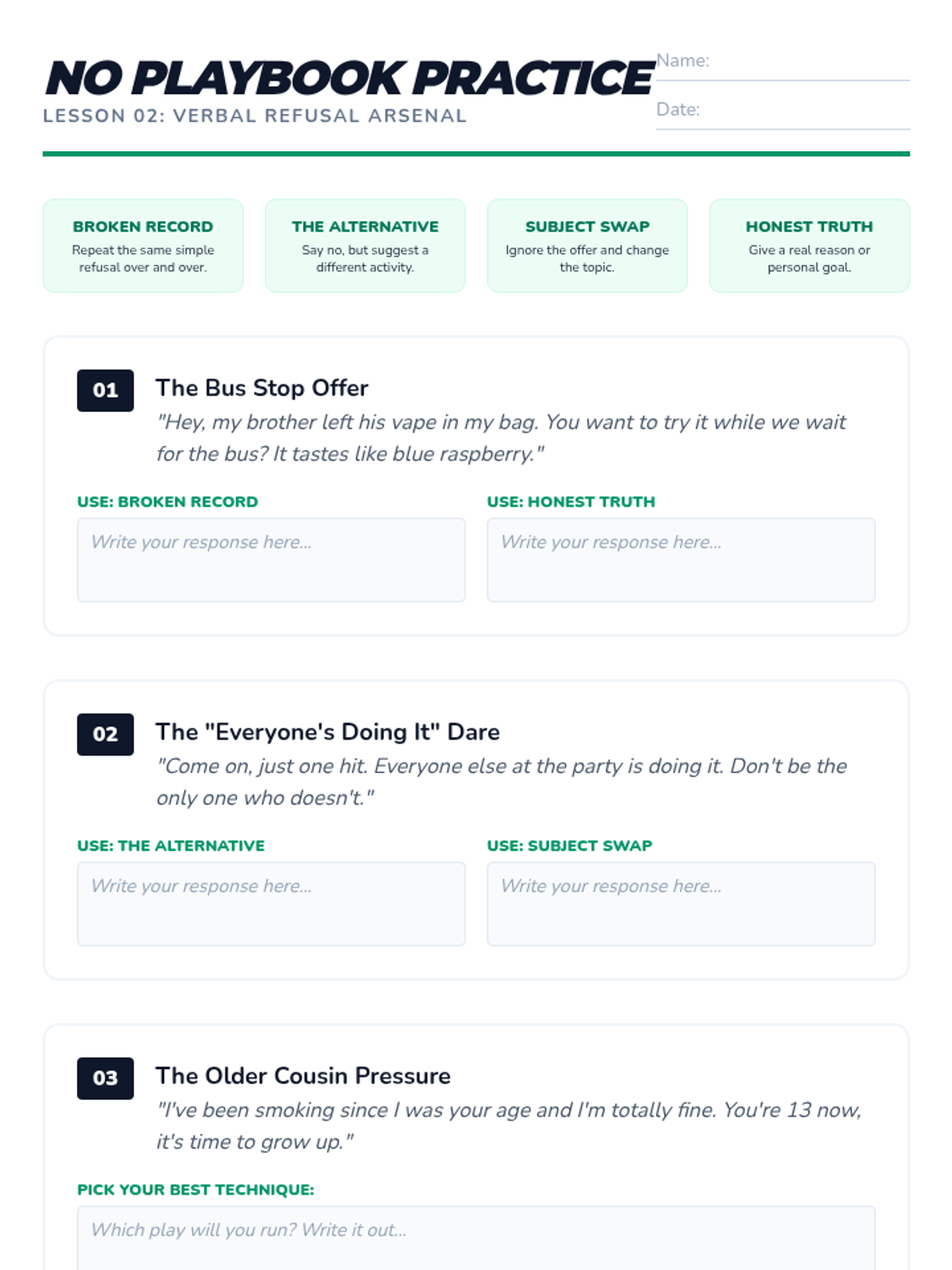 A comprehensive 7th-grade sequence on substance awareness focusing on refusal skills and peer pressure management. Students move from identifying internal and external pressures to practicing verbal and non-verbal refusal strategies, culminating in realistic role-play simulations and exit planning.