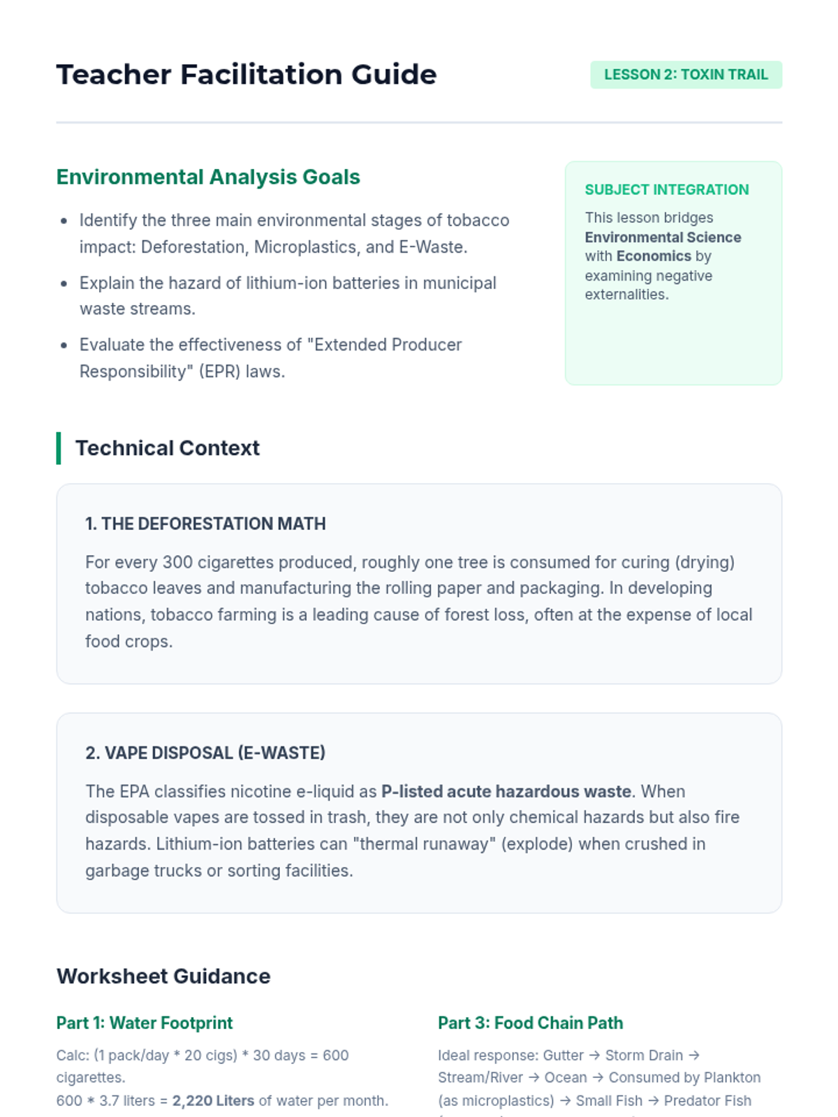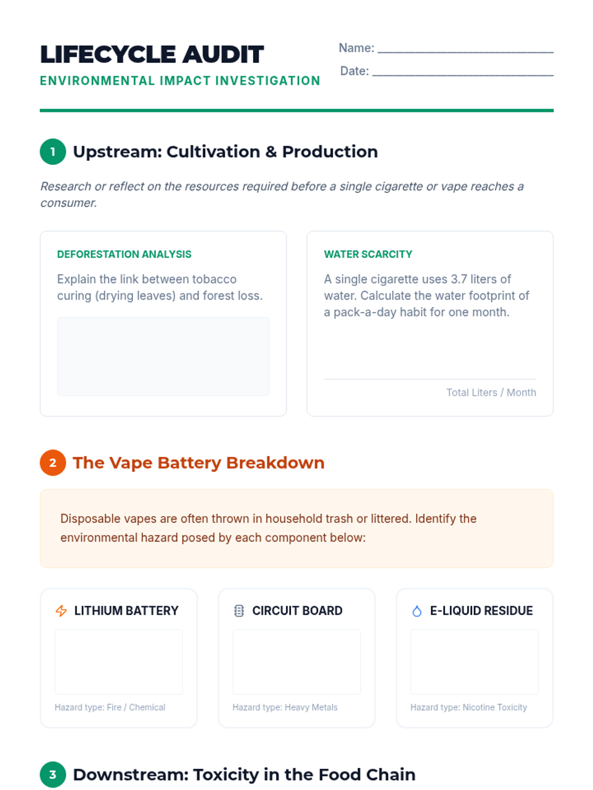 A high-level exploration of the macro-economic and environmental consequences of tobacco and e-cigarette use. Students analyze financial data, environmental toxicity, and public health policy to develop a comprehensive understanding of addiction's societal burden.