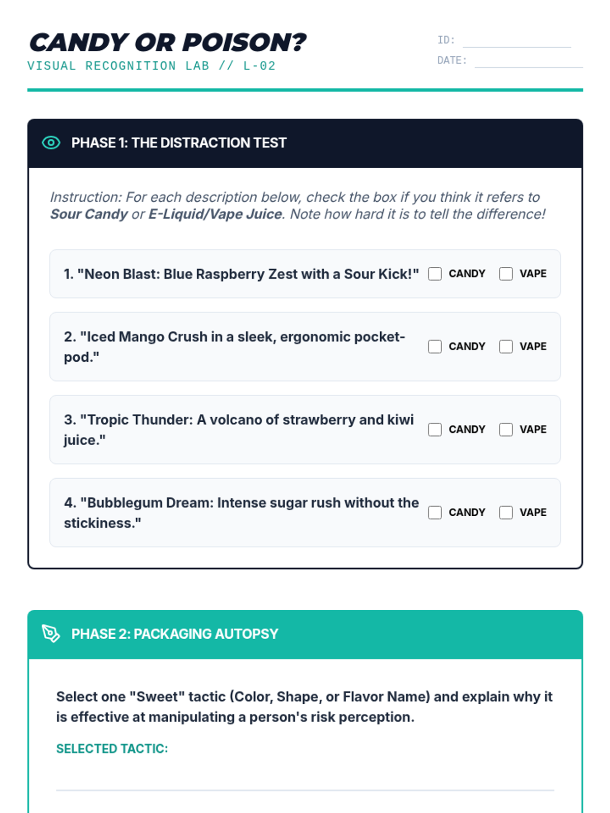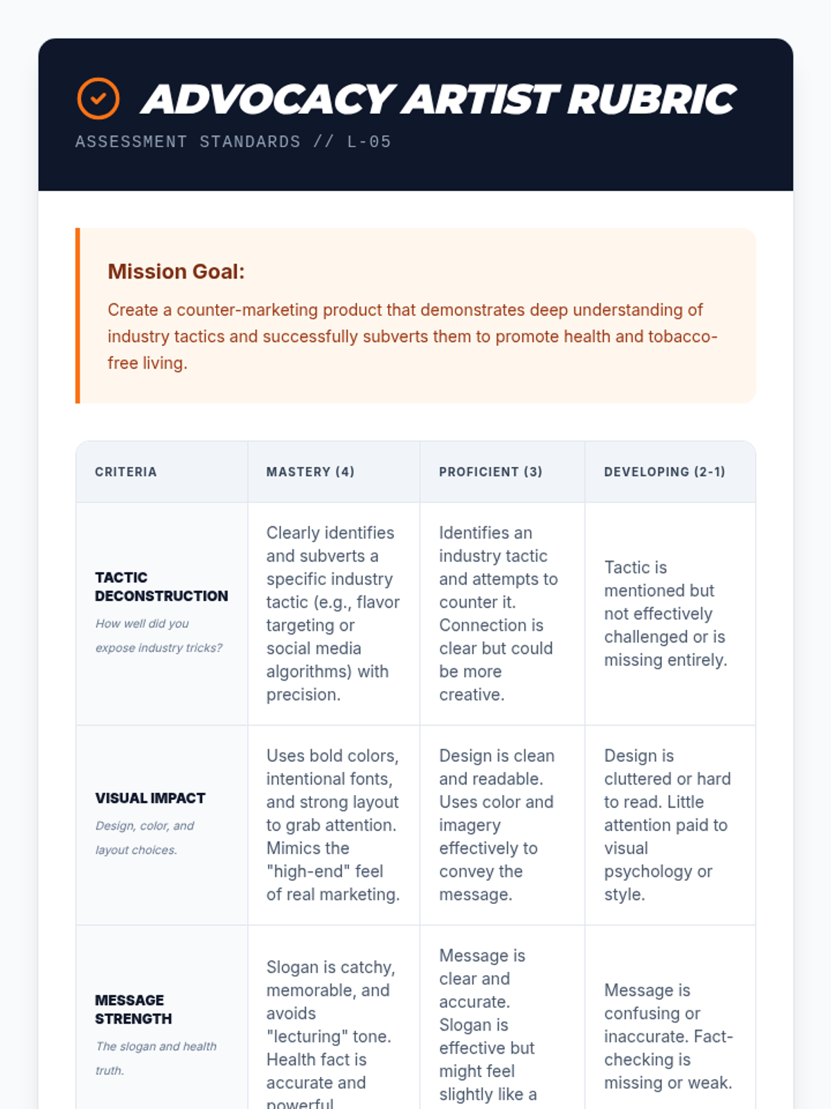 A comprehensive 7th-grade health sequence that empowers students to deconstruct tobacco and vaping industry marketing tactics, focusing on media literacy, psychological manipulation, and counter-campaign design.